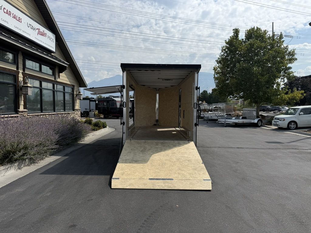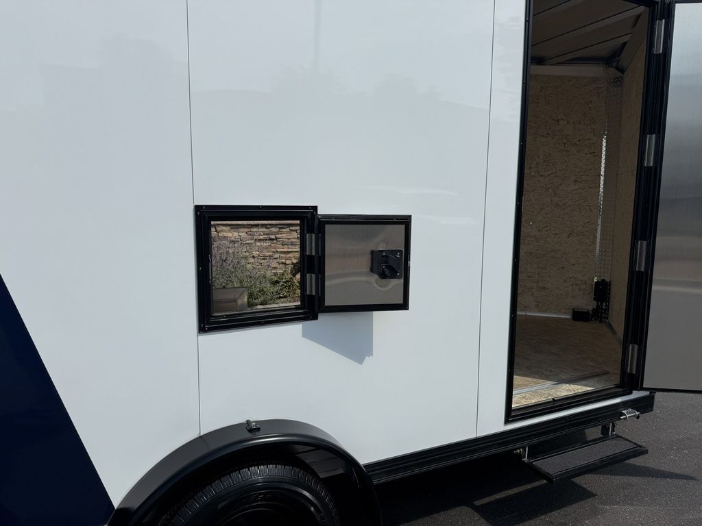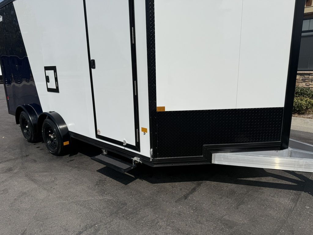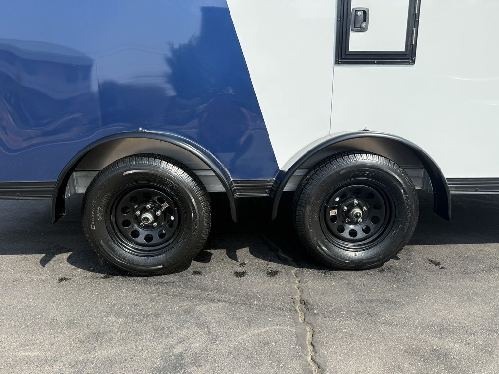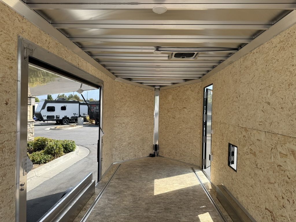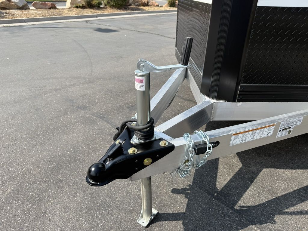 24" Stone Guard 2000# Center Jack Axles: 2-3K Torsion Braked Axles NEW Spread Axle Design w/ Individual Fenders GVWR: 7000# 2-5/16" A-Frame Coupler NEW Tires: 15" Gloss Black Mod Steel Rims (205/75R15) NEW Cargo Slide Track Package with (2) Full-Length Rows and (4) Adjustable D-Rings NEW Rear Ramp w/Spring Assist, Starter Flap & Aluminum Hardware NEW 32"x78" Side Access Door w/ Paddle Handle & Piano Hinge NEW Elite Escape Door Roof Vent Exterior LED Lighting (3) Interior LED Dome Lights w/Switch 3/8" Water Resistant Walls