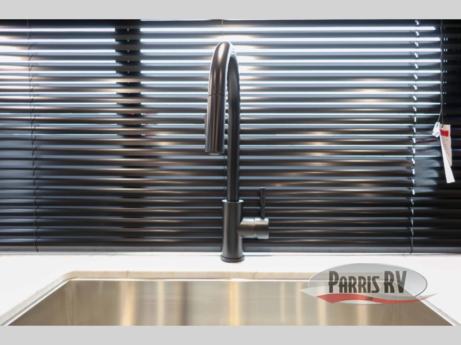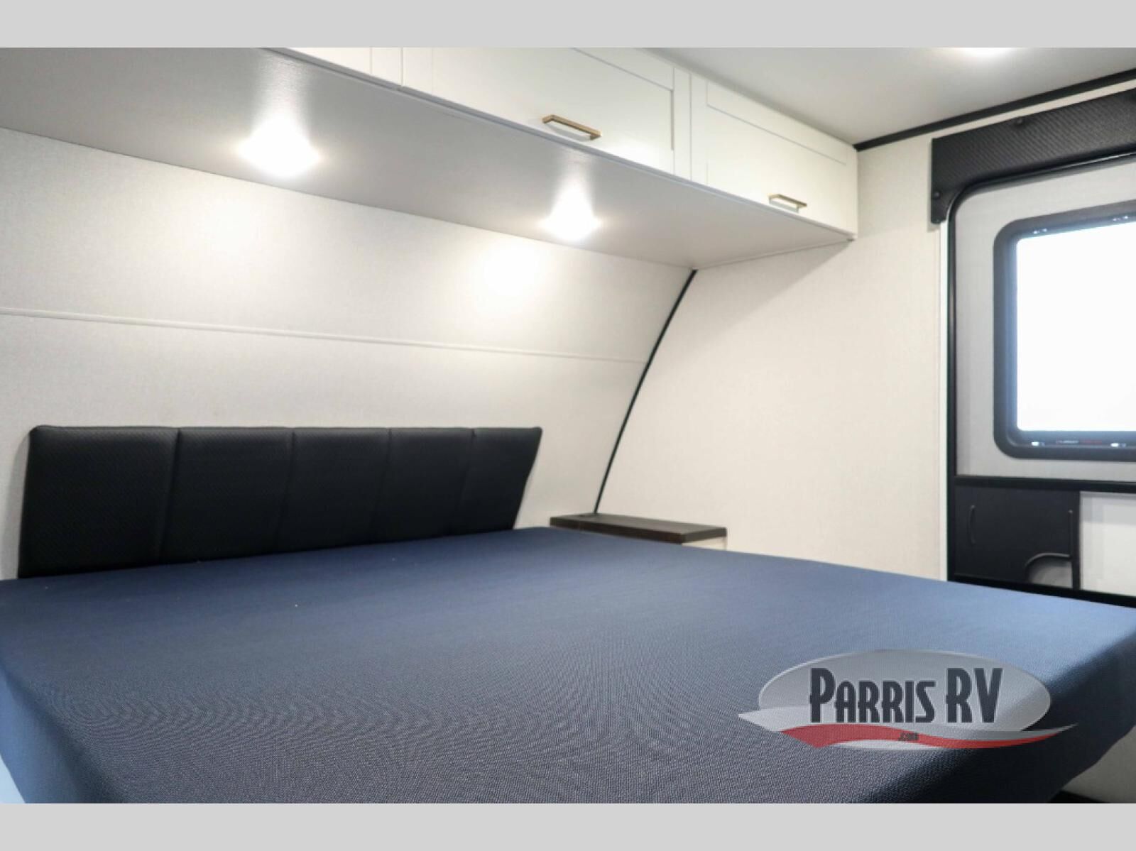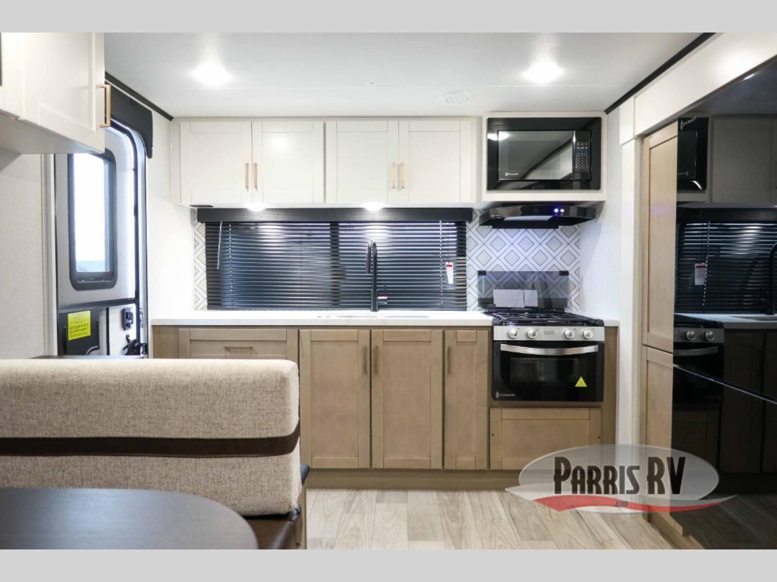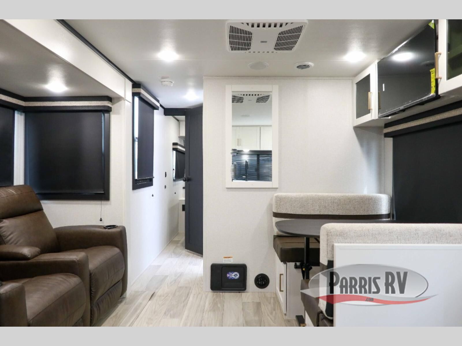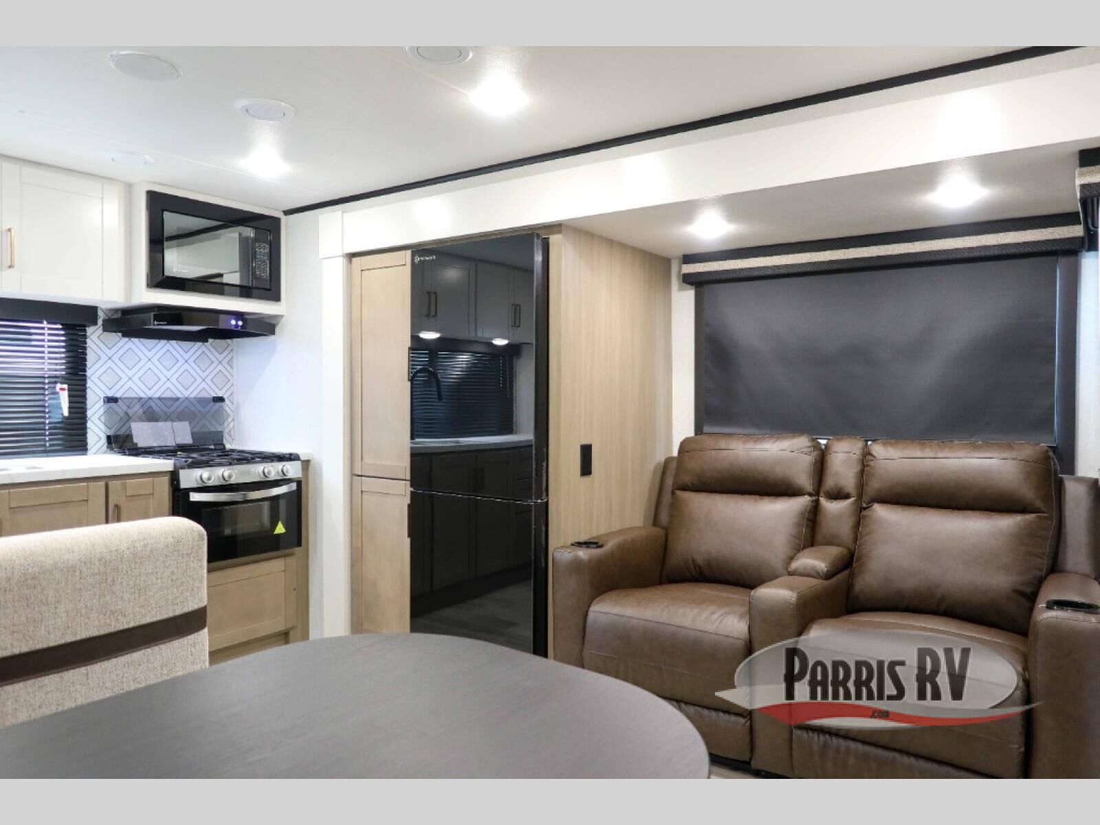 At the front of this travel trailer, you'll find a private bedroom featuring a spacious 60" x 80" queen bed, complete with pull-out nightstands and wardrobes on each side for convenient storage of clothes and essentials. One of the two entry doors is located here, providing added privacy and easy access. Moving down the hall, the full bathroom offers a 30" x 36" shower, a porcelain foot-flush toilet, and a linen cabinet to keep towels and hygiene items neatly organized. In the main living area, you can enjoy meals or game nights at the 38" x 68" booth dinette, while the 60" theater seat in the slide-out provides a cozy spot to relax. At the rear, the kitchen spans the full width of the trailer and includes a stainless-steel single-basin sink with a high-rise pullout faucet and butcher block cutting board, a three-burner range, and generous seamless countertops. Also, in the slide-out are a pantry and an 11-cu. ft. refrigerator, giving you plenty of room to store food, snacks, and leftovers for the whole trip. The second entry door is located in between the kitchen and dinette for your convenience.