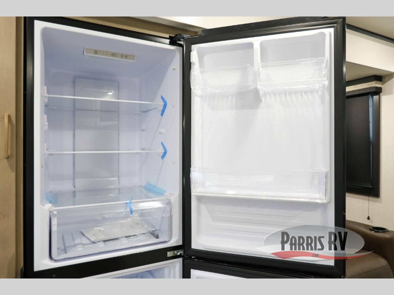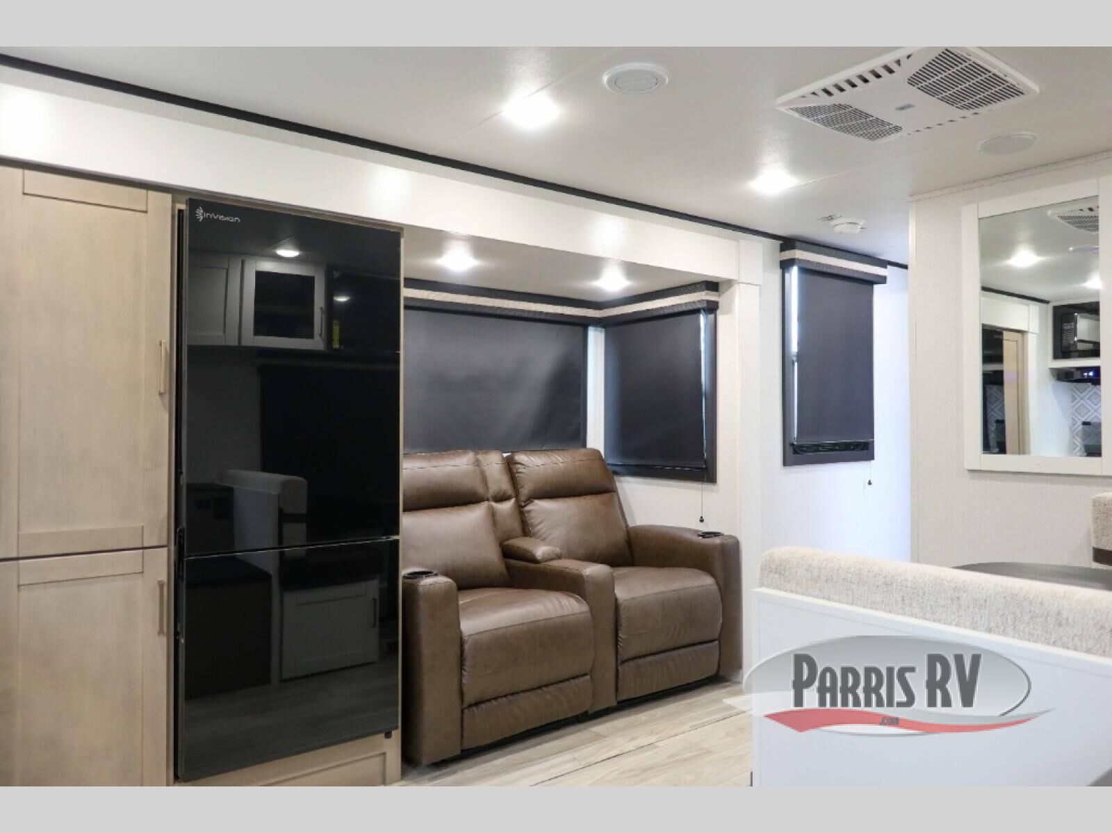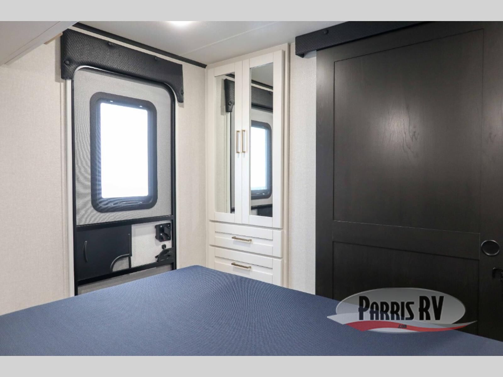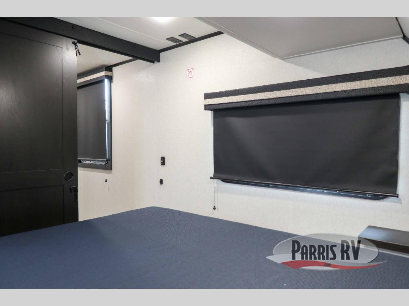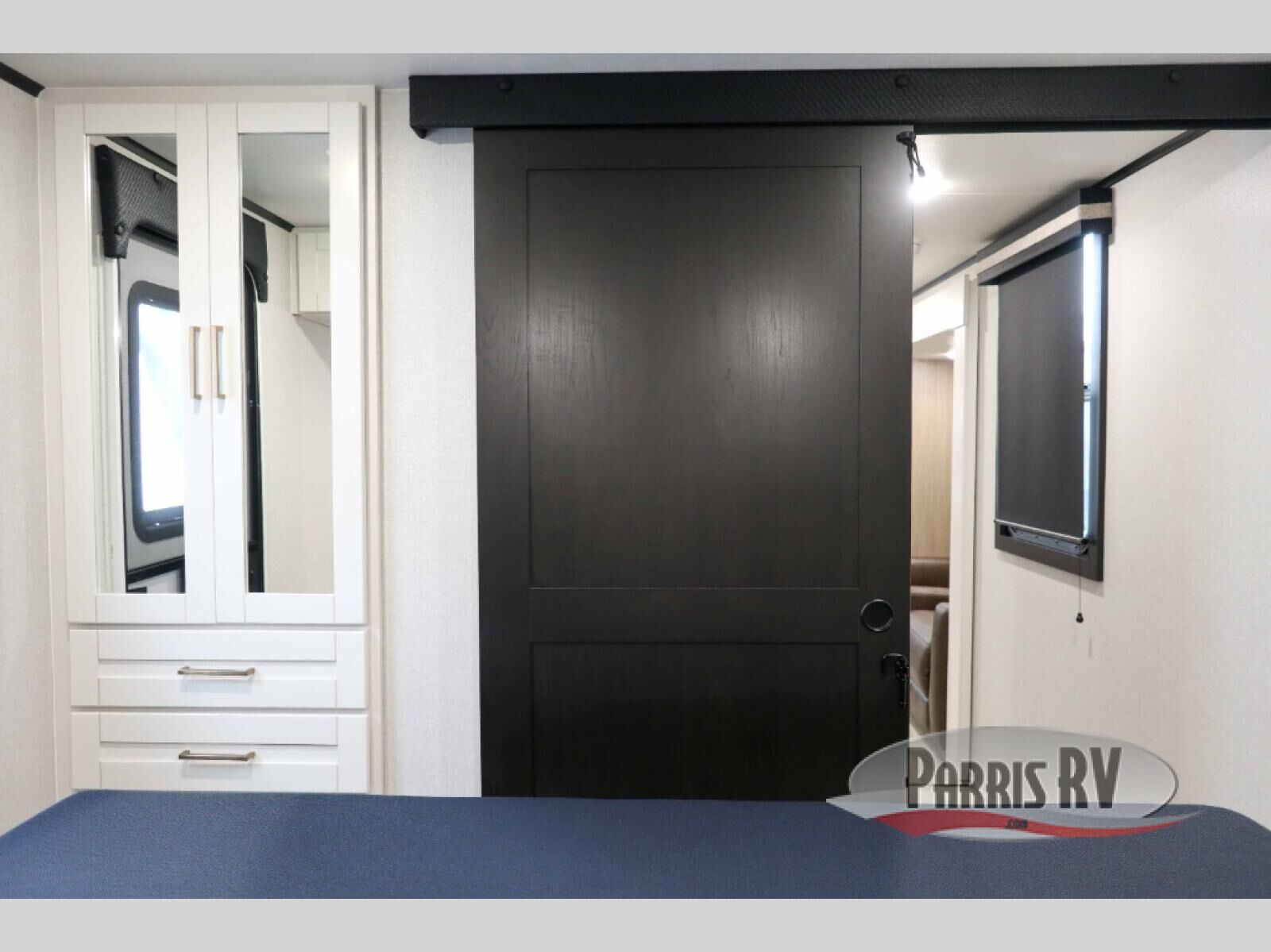 At the front of this travel trailer, you'll find a private bedroom featuring a spacious 60" x 80" queen bed, complete with pull-out nightstands and wardrobes on each side for convenient storage of clothes and essentials. One of the two entry doors is located here, providing added privacy and easy access. Moving down the hall, the full bathroom offers a 30" x 36" shower, a porcelain foot-flush toilet, and a linen cabinet to keep towels and hygiene items neatly organized. In the main living area, you can enjoy meals or game nights at the 38" x 68" booth dinette, while the 60" theater seat in the slide-out provides a cozy spot to relax. At the rear, the kitchen spans the full width of the trailer and includes a stainless-steel single-basin sink with a high-rise pullout faucet and butcher block cutting board, a three-burner range, and generous seamless countertops. Also, in the slide-out are a pantry and an 11-cu. ft. refrigerator, giving you plenty of room to store food, snacks, and leftovers for the whole trip. The second entry door is located in between the kitchen and dinette for your convenience.