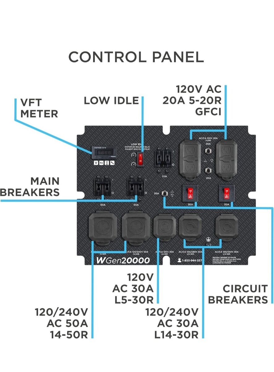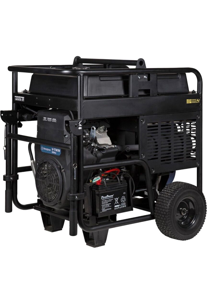 28,000 Peak Watts and 20,000 Running Watts; Easy-Access Start Panel with Keyed Electric Start, Choke Knob, and Fuel Control Valve; Up to 17 Hours of Run Time at 25% load on a 17 Gallon Fuel Tank With Fuel Gauge Featuring Four GFCI 120V 5–20R Standard Household Outlets, Two 50A 120/240V 14-50R Outlets, Two 30A 120/240V L14-30R Outlets, and One 30A 120V L5-30R Outlet; All Outlets Have Rubber Covers for Added Safety Powered by a Heavy Duty 999cc Westinghouse V-Twin OHV Engine with a Cast Iron Sleeve, Automatic Low Oil Shutdown, and Idle Control Engineered with Low THD, So It's Safe for Sensitive Electronics. Power Phones, Computers, TVs and More. Stay Connected with People, News and Entertainment During Power Outages, or on Jobsites and Campsites. Durable Copper Windings Help Your Generator Produce Cleaner Power, Run Cooler and Last Longer Plug-and-Play: Oil, Funnel, Setup Guide and Manual to Get You Started Right Out of the Box; Digital Readout Displays Lifetime Run Hours, Volts, and Frequency; Comes With Reinforced Steel Handles with Quick-Release Pins