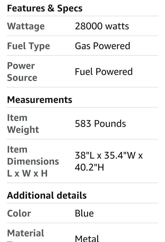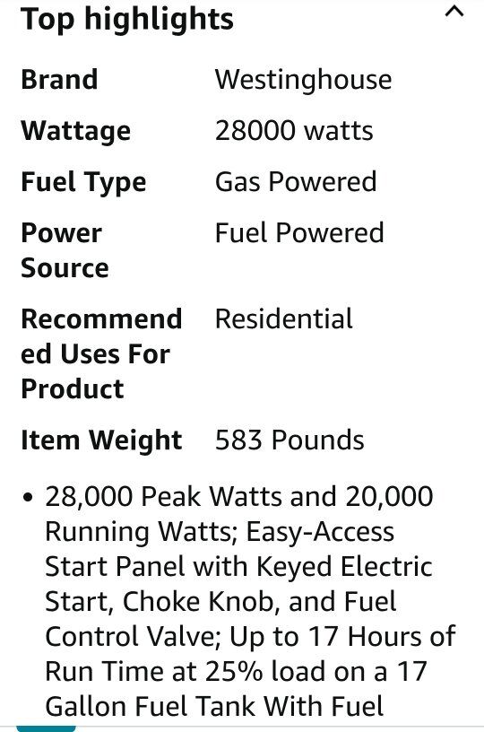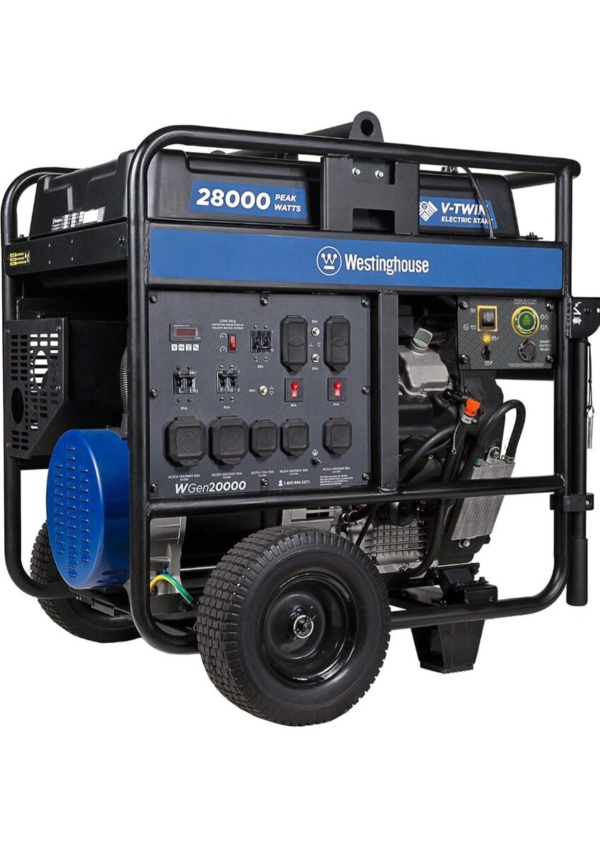 New in box. Originally paid $3,600 for it. Westinghouse 28000 Peak Watt Home Backup Portable Generator, Electric Start with Auto Choke, Transfer Switch Ready 30A & 50A Outlets, Gas Powered,Blue