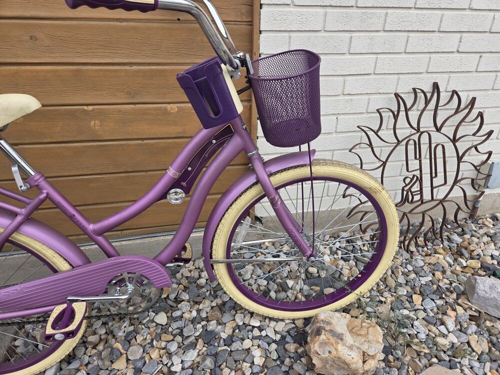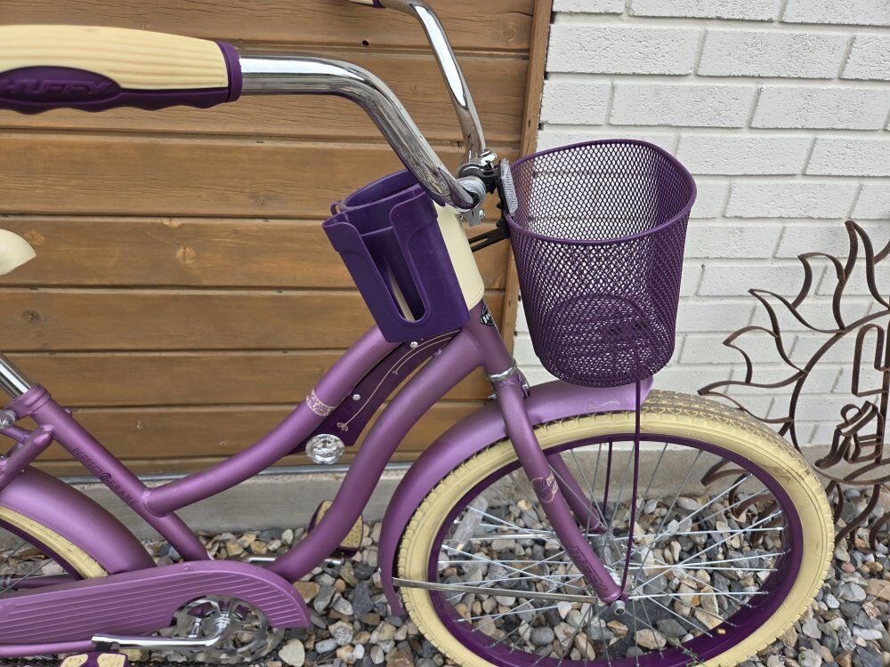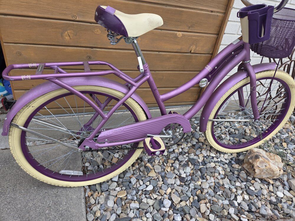 Huffy Nel Lusso Girls' Cruiser Bike, 24" Wheels, Ages 12+ Years, Purple The Huffy Nel Lusso combines a classic bike style with comfort features. Italian for “in luxury,” Nel Lusso pampers with this bicycle’s style and features. Huffy understands a comfortable bike ride begins with a comfortably padded seat. As soon as you sit down, you’ll feel like this perfect-fit frame is designed specifically for you. The raised handlebar enables you to ride in an upright position. As you pedal, your legs can fully extend forward, which eliminates wrist, arm, neck, and leg fatigue. Utilize a convenient beverage holder on the bike’s handlebar. The bike also includes a rear rack for carrying essentials and a front basket for added convenience. With its stylish design and practical features, the Huffy Nel Lusso is perfect for leisurely rides around town. From Huffy, We Make Fun! Ideal for ages 12 to 19 years old. Stylish: Purple frame with classic cruiser style for timeless charm. Durable: Steel frame ensures lasting performance on flat terrain. Smooth: Coaster brakes provide easy and reliable stopping power. Relaxed: Upright riding position promotes comfort on leisurely rides. Grippy: Wide cruiser tires enhance stability and balance on any surface. Convenient: Handlebar basket, storage rack, & cup holder for small essentials.