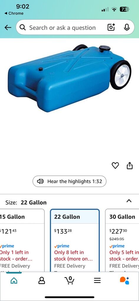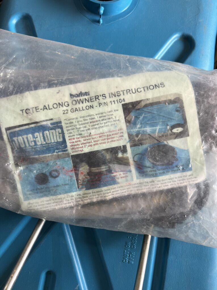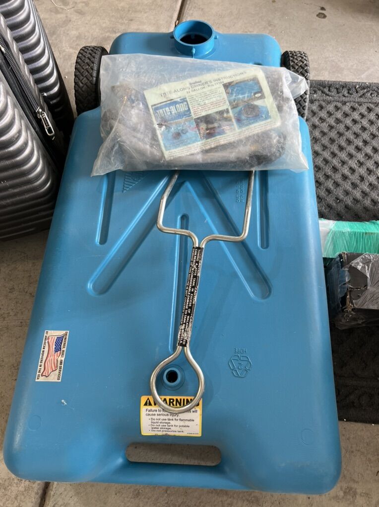 16 pounds empty Blow-molded polyethylene construction and quality zinc plated steel brackets throughout Extra large, heavy-duty wheels and standard bayonet fittings included on all tanks except 5 Gallon size Tow bracket and 5 foot sewer hose included Dimensions: 37 Inch Length x 20 Inch Width x 11 Inch Height