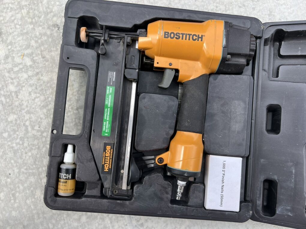 Looks brand new! The Bostitch 16 gauge finish nailer kit is designed to drive 16 gauge finish nails from 1-1/4-in to 2-1/2-in length. This nailer features smart point technology: easy nail placement as a result of a smaller nose compared to current Bostitch nailers and no need to compress the contact trip to actuate the tool. This unit also features oil-free operation which reduces the risk of oil stains. The tool-free jam release mechanism allows for easy nail removal, and dial-a-depth control allows for precise countersinking of nails. It also has a selectable trigger system for either sequential or contact operation depending on your choice of operation. Other added features of this finish nailer include a fitting, rear air exhaust, and belt hook with integrated pencil sharpener for easy accessibility. Kit includes: 16 gauge finish nailer, fitting, carrying case and extra no-mar tips.