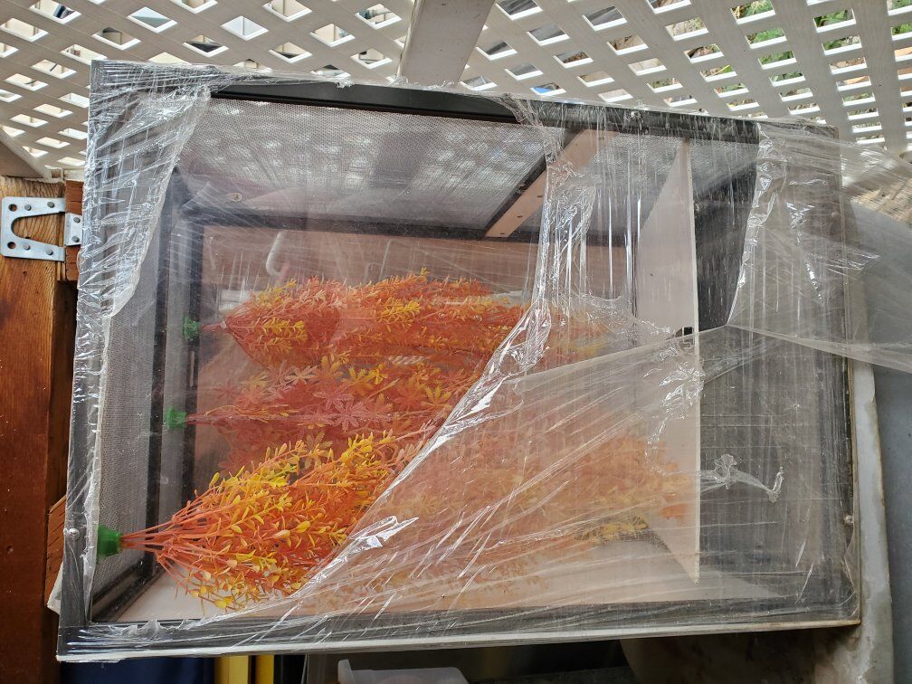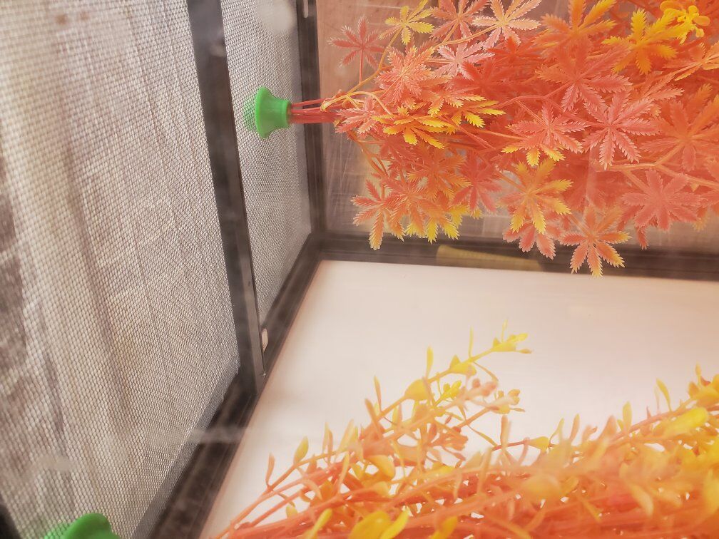 This is my very last gecko cage. It's made of plexiglass panels on the sides, PVC back, and a removable PVC floor panel. The top and from are metal mesh, the hanging plants are magnetic and both the cage and plants are no longer made. It comes with the plants pictured.