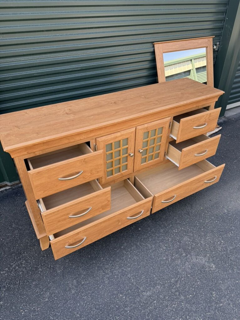 Spacious 6 Drawers middle cubby Dresser Solid N Sturdy! With mirror Note- some cosmetic imperfections please see pictures. Measurements 64” Long 16.5” Deep 36” Tall Mirror 44.5” tall 39”wide
