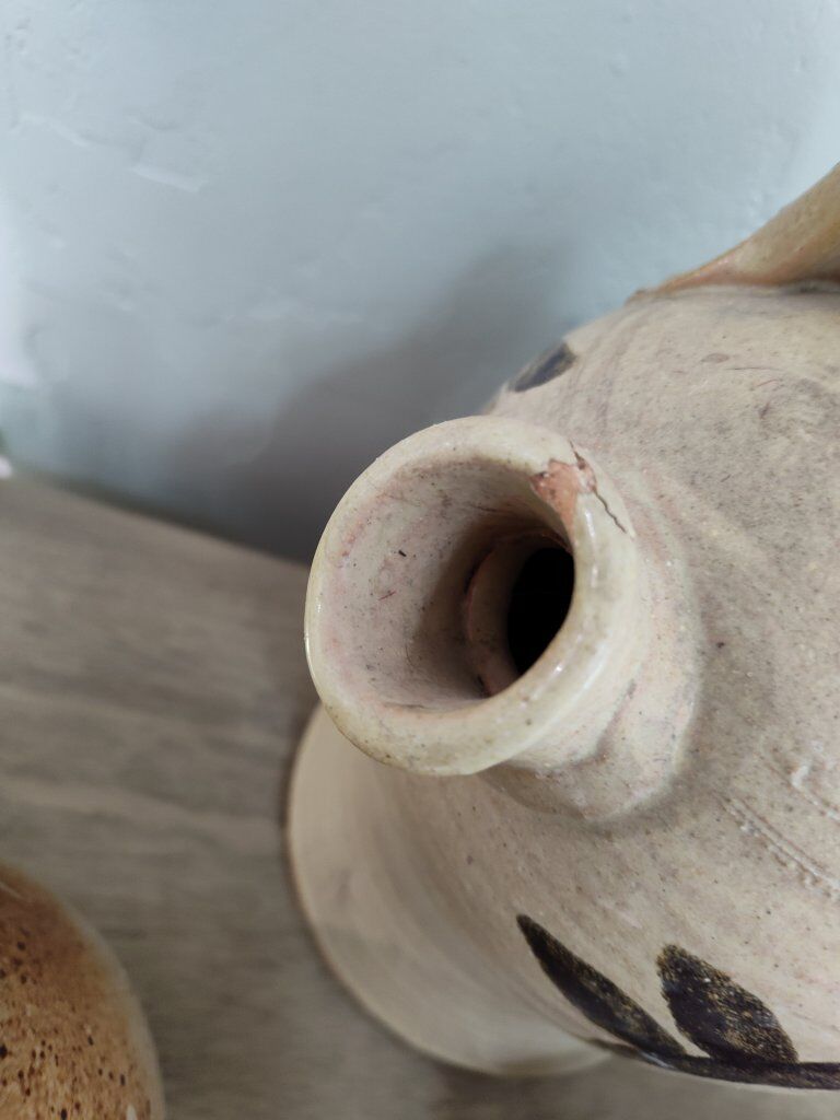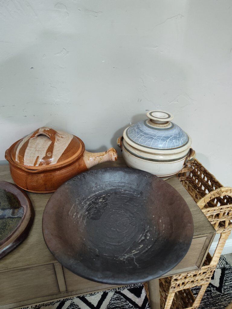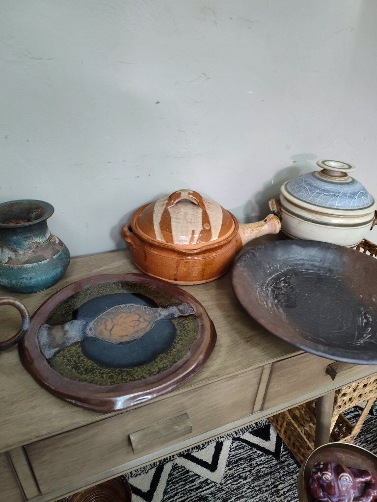 Pottery. Variety of pottery. The 2 left tall pieces have a small chip. The rest are in good condition.