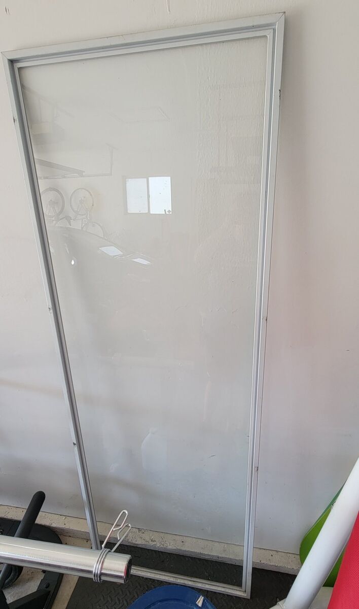 Came out of an old storm door, still in its frame. Roughly about 27x72 inches. Single paned, could go into a new door as it still has a frame. Tempered glass
