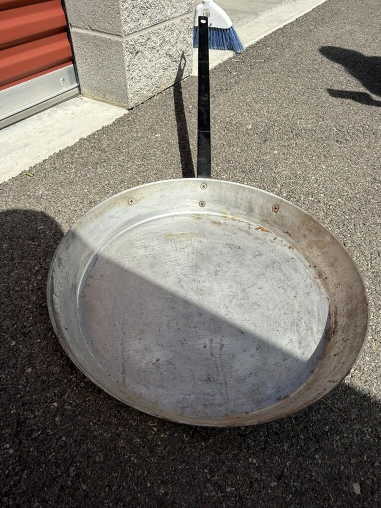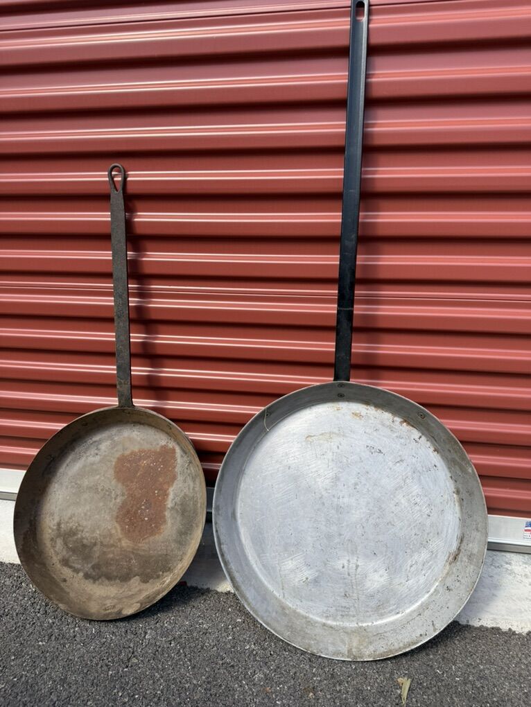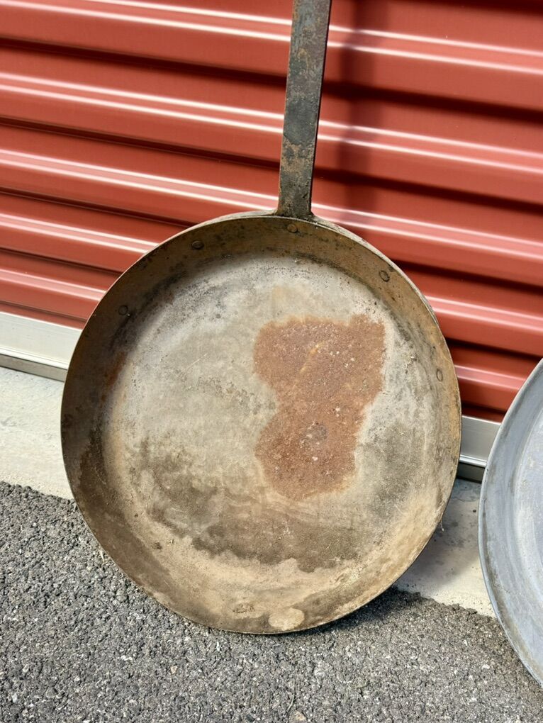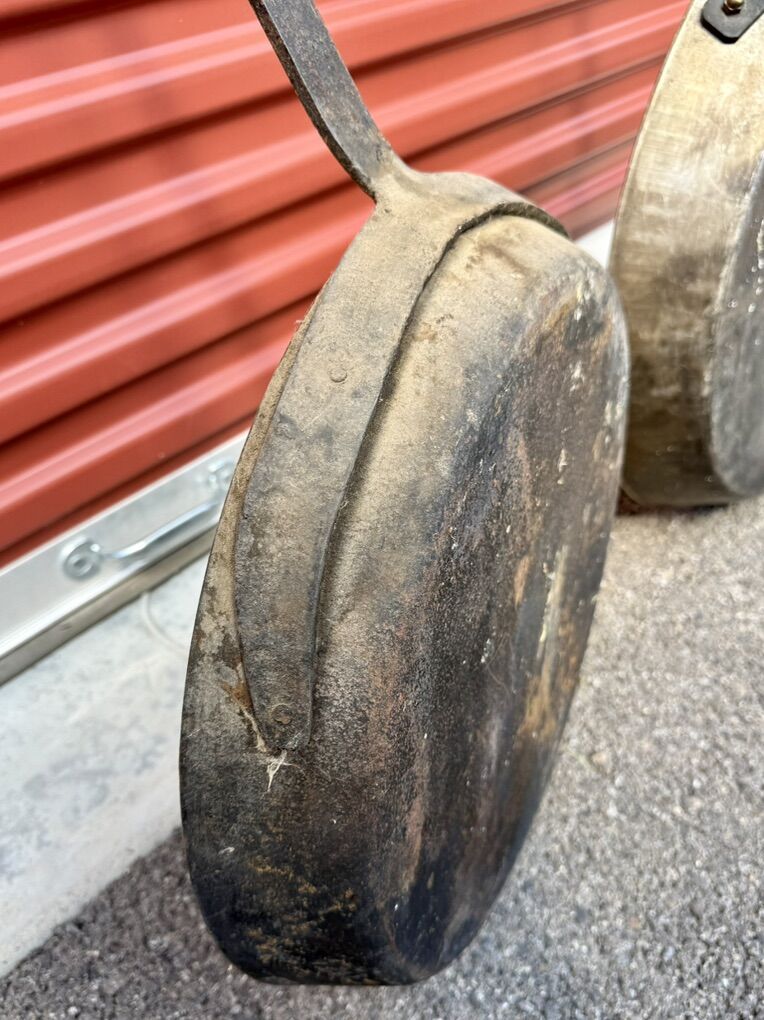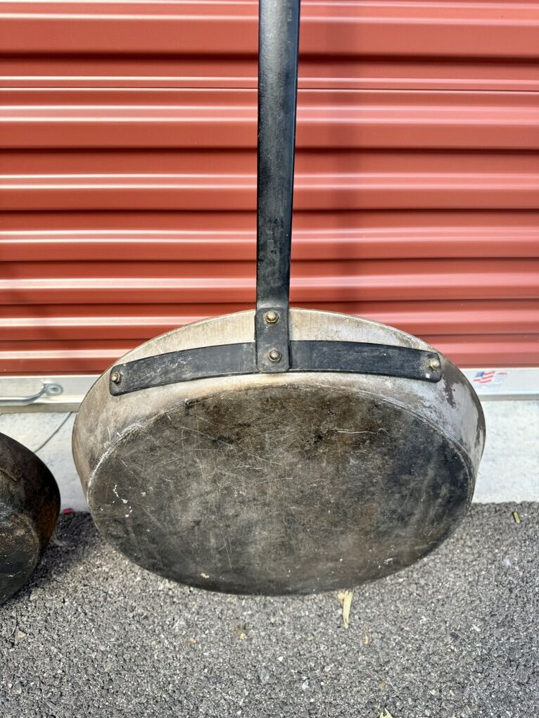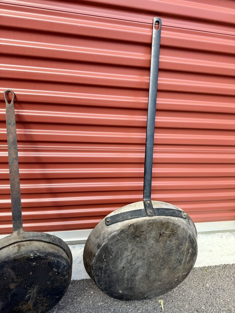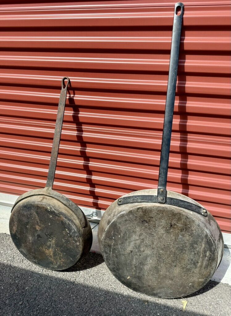 VenmoIncredible vintage skillets. One is cast iron and appears to be hand forged 3’ long with handle, 16” diameter 250$ Other is 46” long with handle 20” diameter 150$