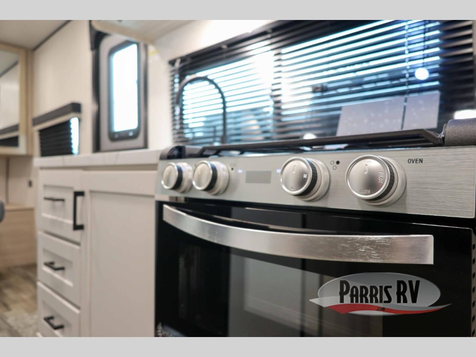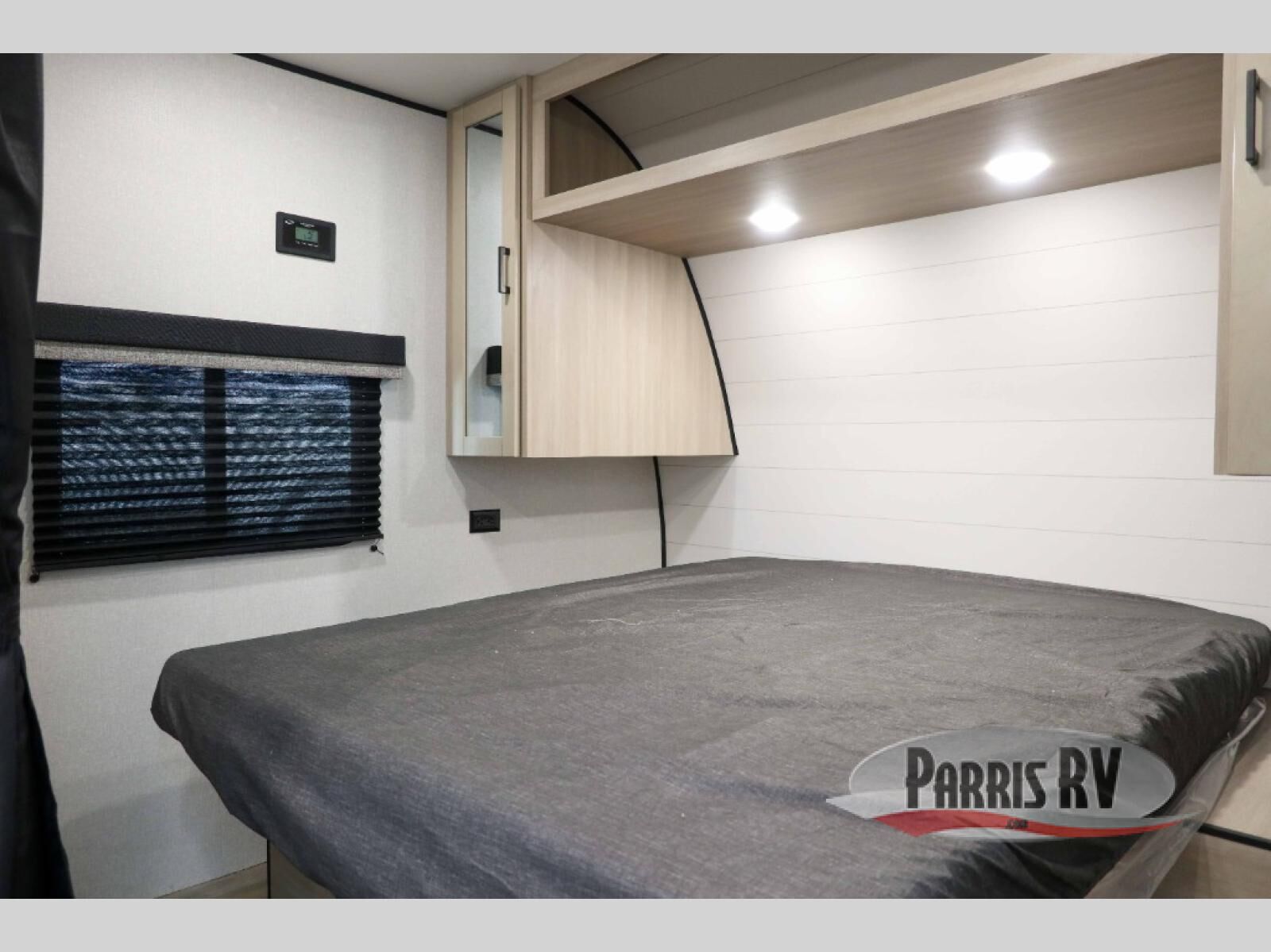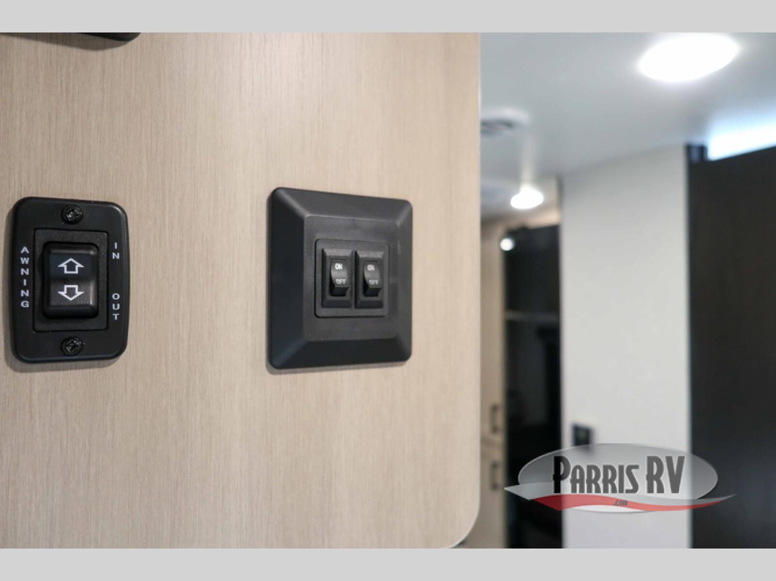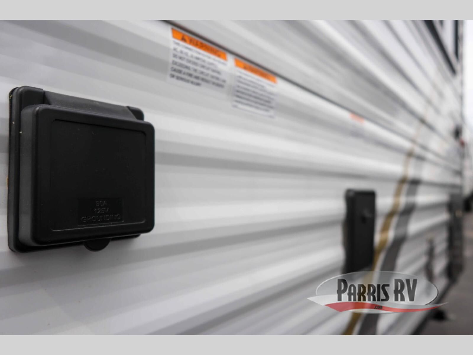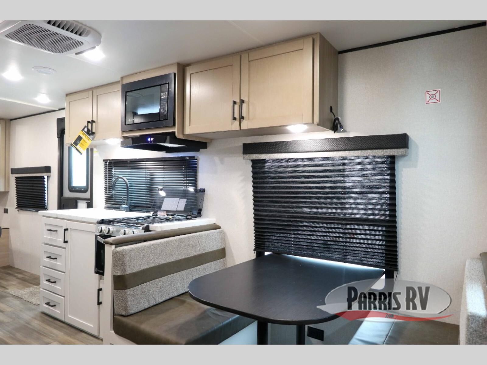 Make each camping trip count in this travel trailer that can sleep four to five each night. You'll wake up feeling refreshed on the front RV queen bed, and there are dual bedside wardrobes to keep your things organized. A middle bath includes a 40" tub/shower, which will make bath time easier if you have little ones. Once breakfast is made on the three-burner cooktop, you can dine at the booth dinette or take your plate outdoors to sit under the 16' power awning with LED lights. This unit also includes a jack-knife sofa, which can be used for sleeping space, along with the dinette!