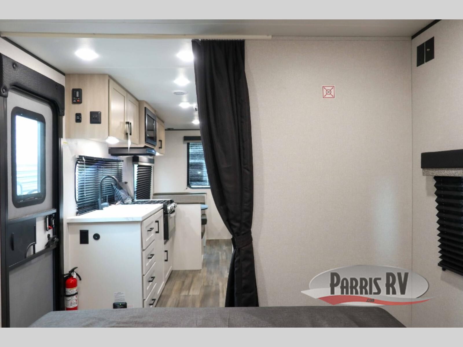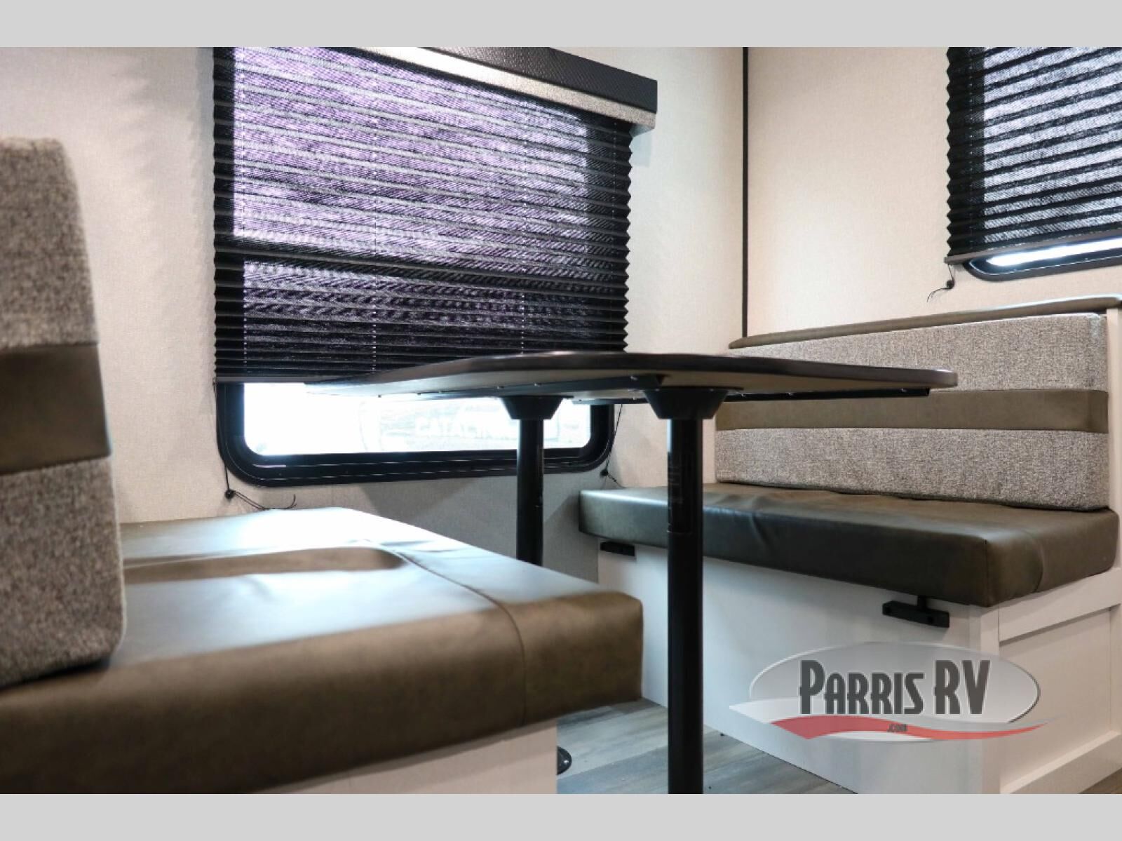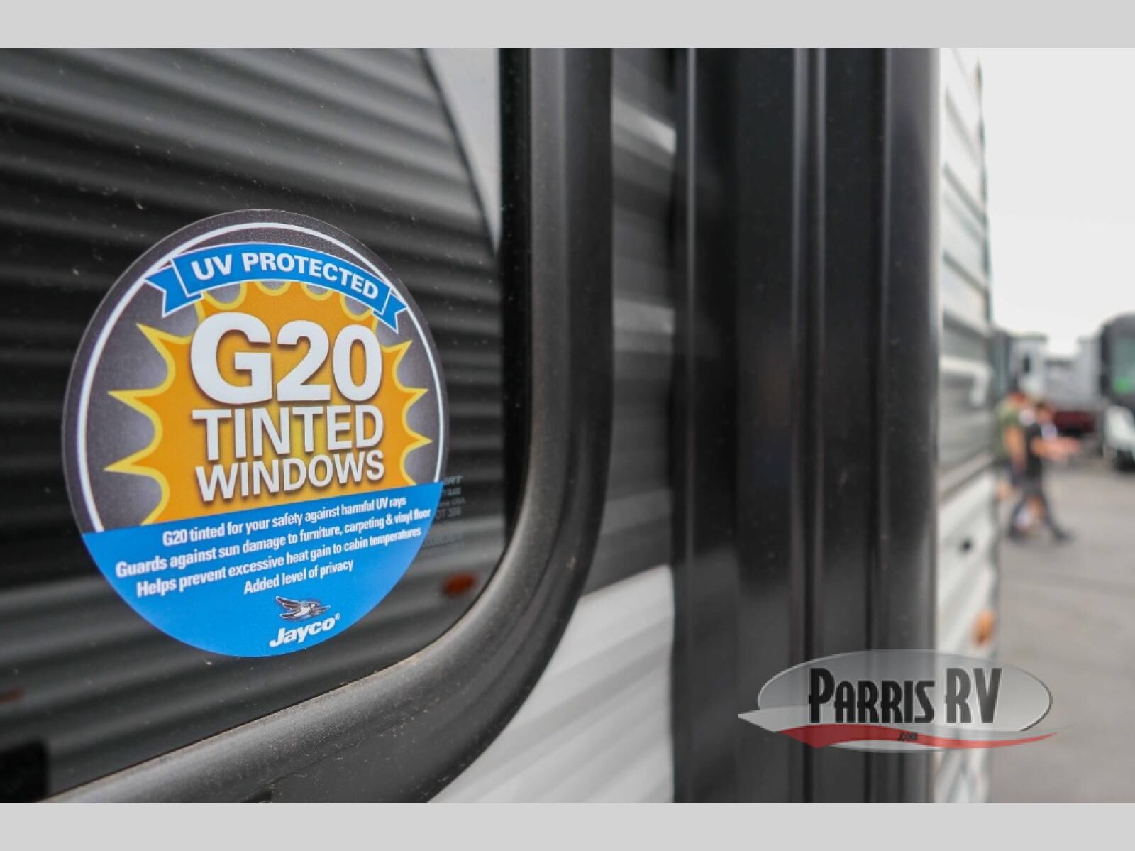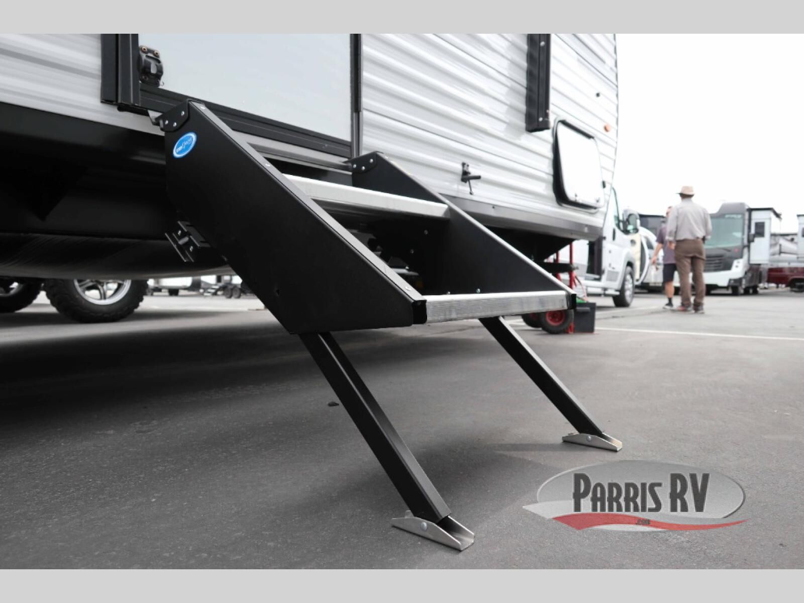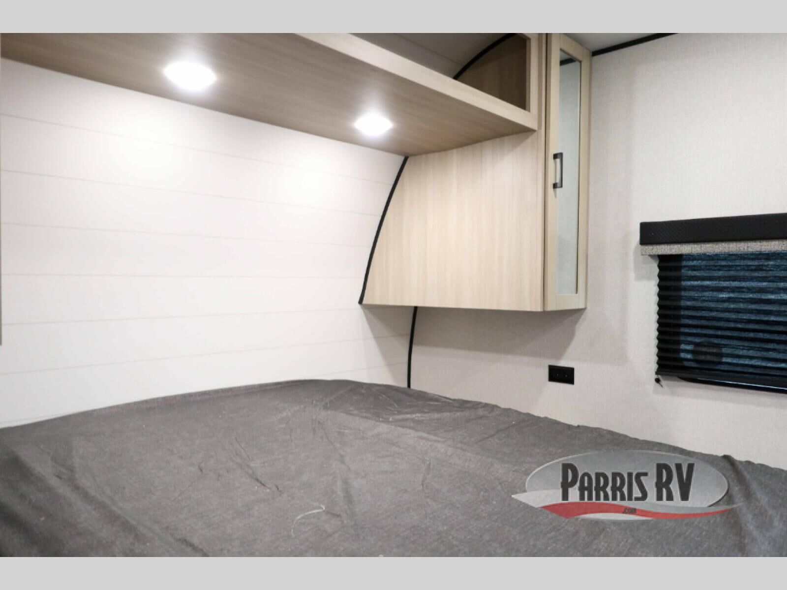Make each camping trip count in this travel trailer that can sleep four to five each night. You'll wake up feeling refreshed on the front RV queen bed, and there are dual bedside wardrobes to keep your things organized. A middle bath includes a 40" tub/shower, which will make bath time easier if you have little ones. Once breakfast is made on the three-burner cooktop, you can dine at the booth dinette or take your plate outdoors to sit under the 16' power awning with LED lights. This unit also includes a jack-knife sofa, which can be used for sleeping space, along with the dinette!