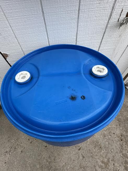 VenmoBlue industrial plastic storage barrel. 55 gal. capacity. Tight-headed “sealed” drum with 2 removeable bung holes. Measures 35”H x 23” W. Unused since new.