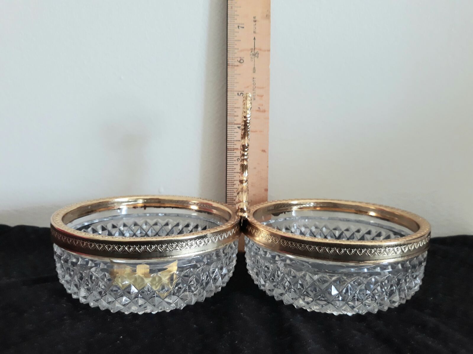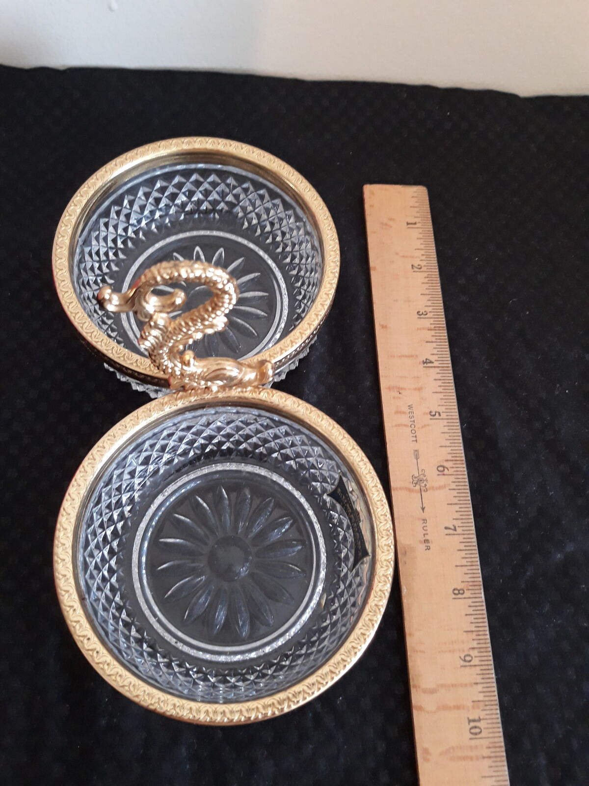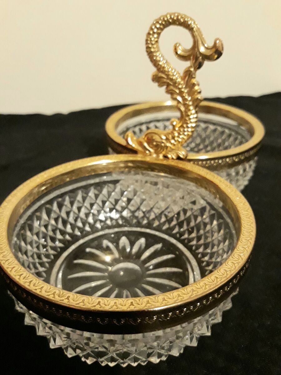 This is a beautiful vintage lead crystal dual bowl. The handle is possibly a koi fish or a dragon? The trim is gold-plated. This lovely piece was made in Belgium by Lumedart. Phone calls or texts please. Cash only. Thanks for looking!