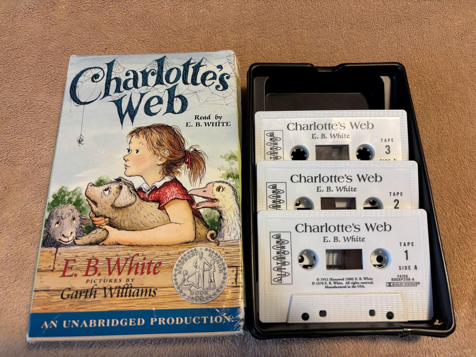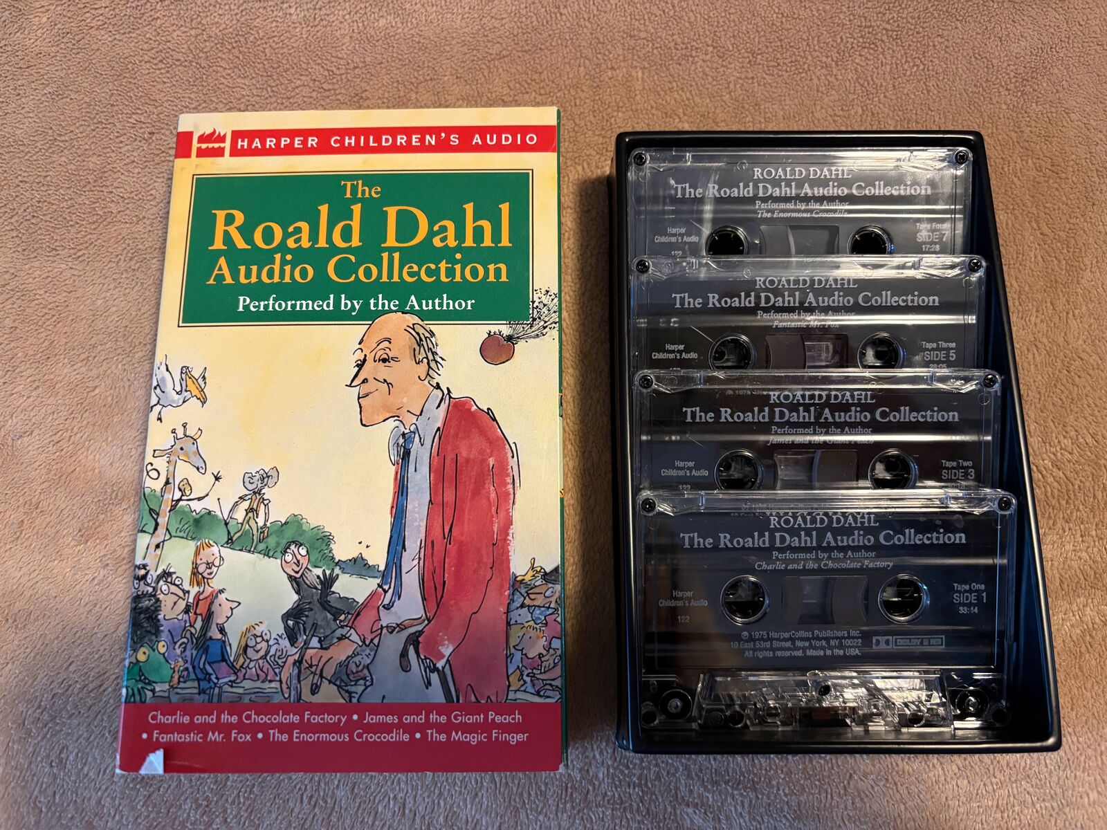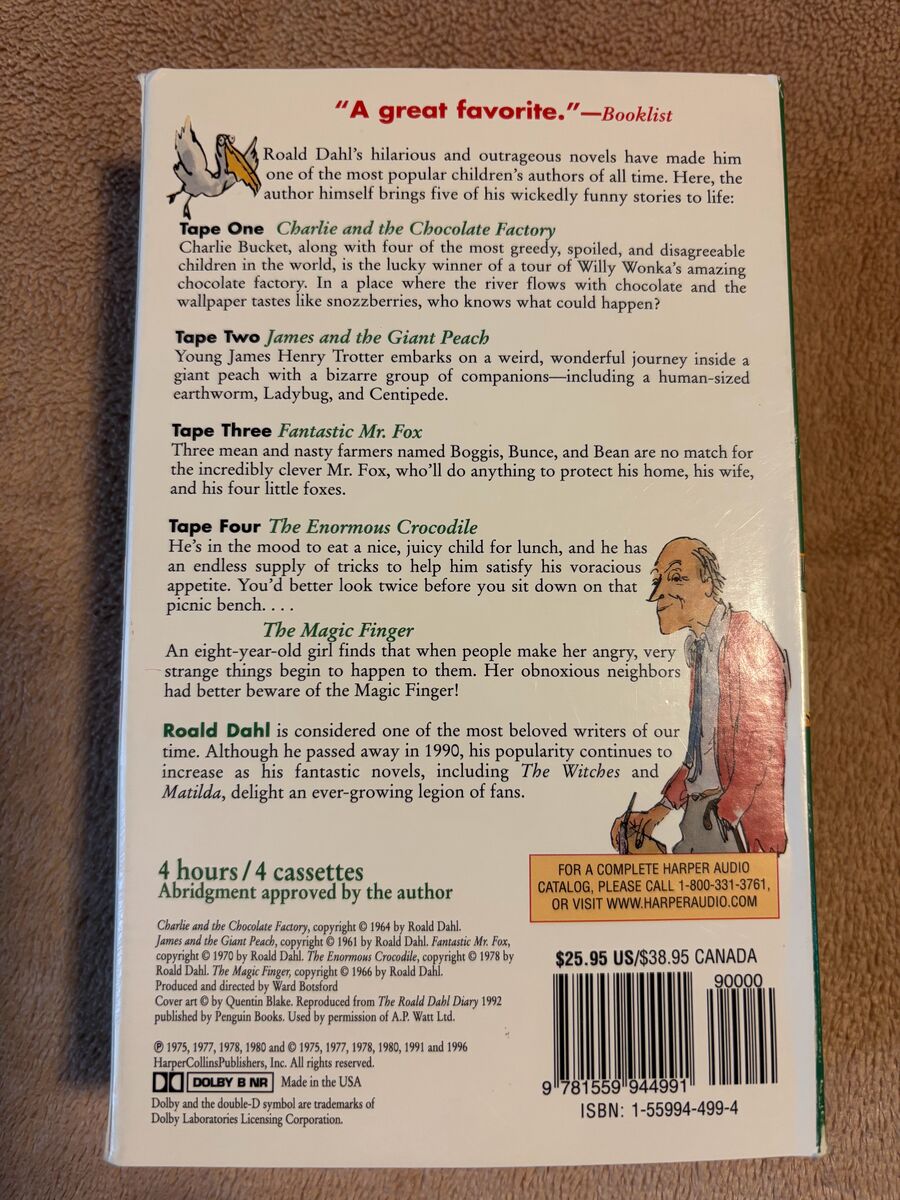 12 Children's Books on Cassette Tape - All tapes tested and play well. The Roald Dahl Audio Collection plays 5 books: Charlie and the Chocolate Factory James and the Giant Peach Fantastic Mr. Fox The Enormous Crocodile The Magic Finger Charlotte’s Web by E. B. White The Hat by Jan Brett The Mitten by Jan Brett Jingle, The Christmas Clown by Tomie DePaola Samuel Eaton’s Day by Kate Waters Sarah Morton’s Day by Kate Waters The Valentine Bears by Eve Bunting