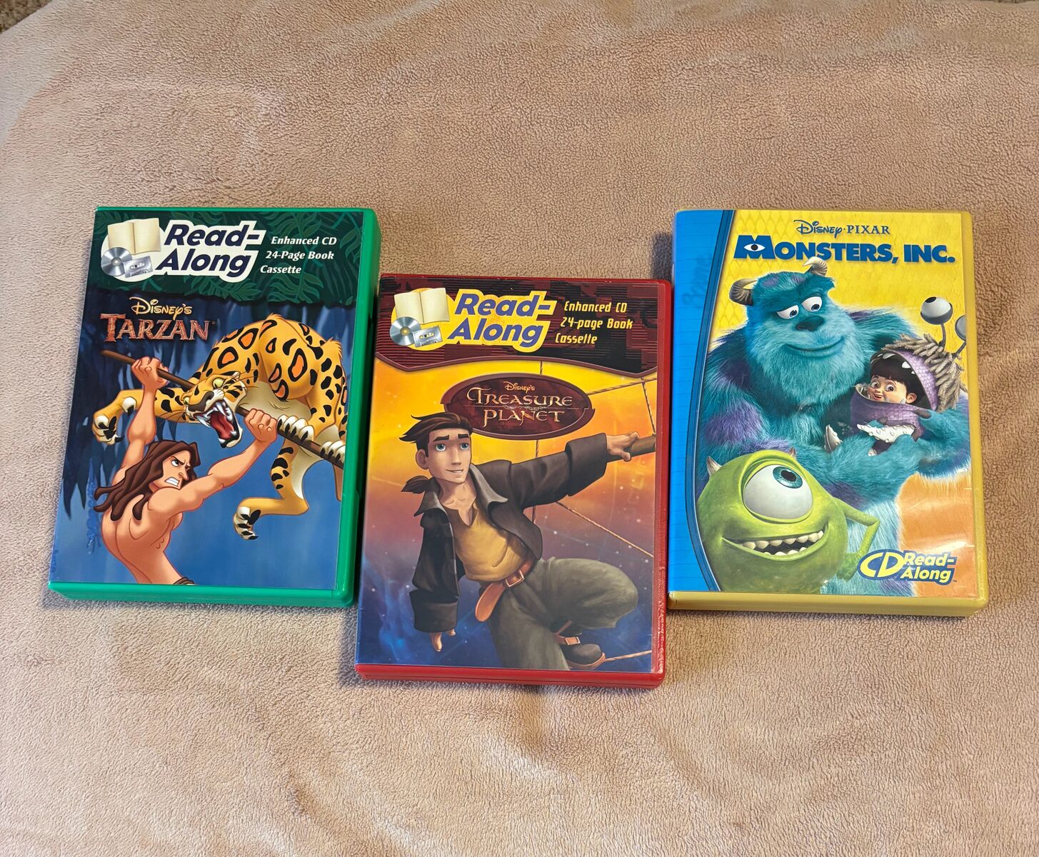 Disney Read Along Books on CD - 9 Books in all Disney’s Tarzan – Book,CD & Tape Disney’s Treasure Planet – Book & CD Disney’s Monster’s Inc – Book & CD Disney’s Toy Story Collections – CD, Tape and 3 books Toy Story Toy Story 2 Toy Story Sing Along Disney’s Little Mermaid Collection – CD and 3 Books The Little Mermaid Ariel and the Secret Grotto Ariel and the Mysterious World Above