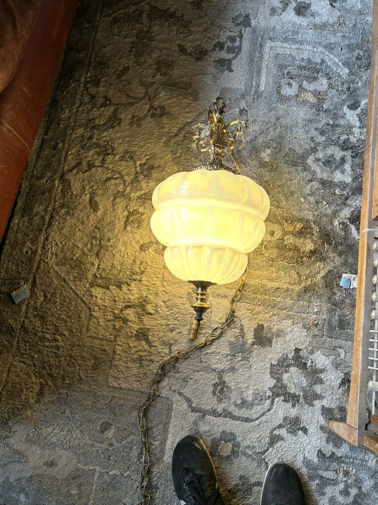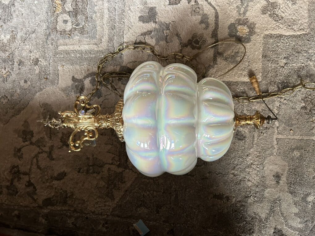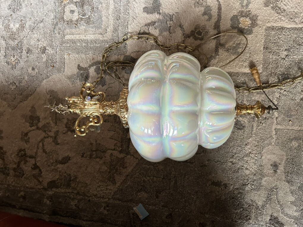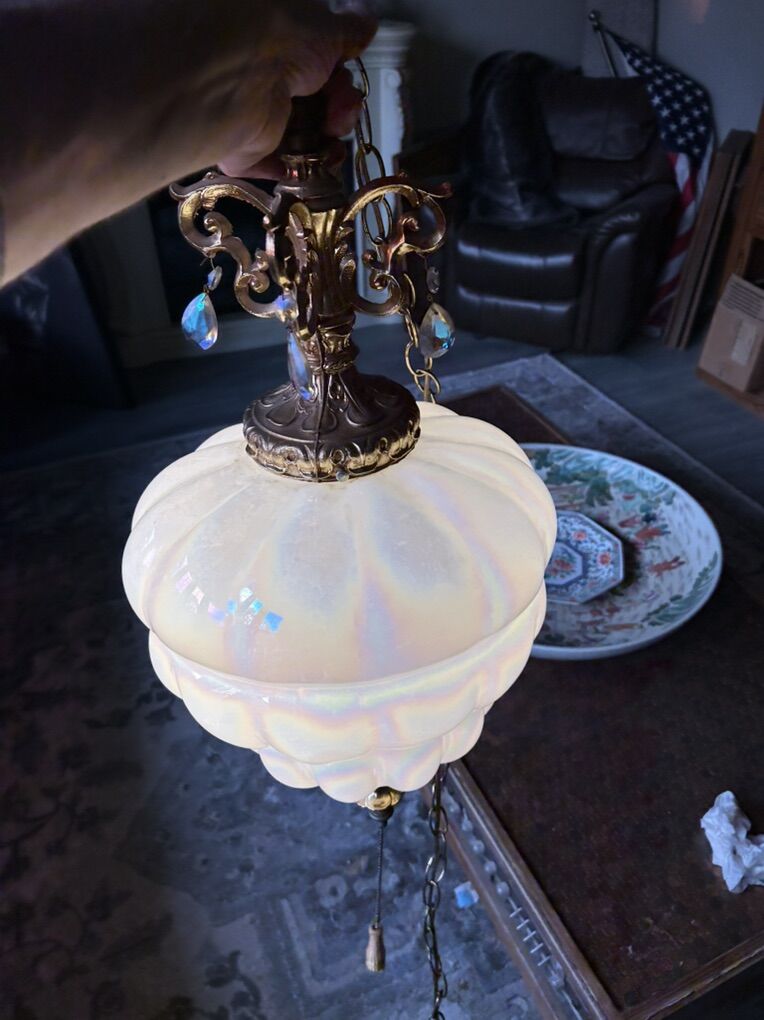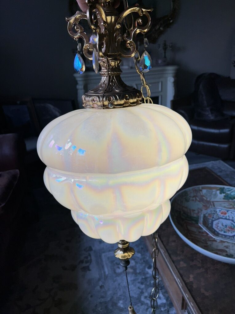 CashAppOpalescent iridescent blown glass with teardrop crystals Hollywood Regency swag lamp CIRCA MCM mounted on a brass intricate designed frame and a long brass chain for hanging. $580.00 OBO
