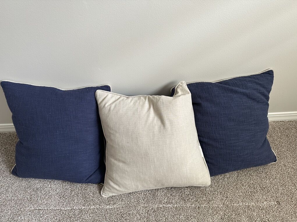 Set of 3 navy/cream reversible textured throw pillows from Downeast. 20 x 20”