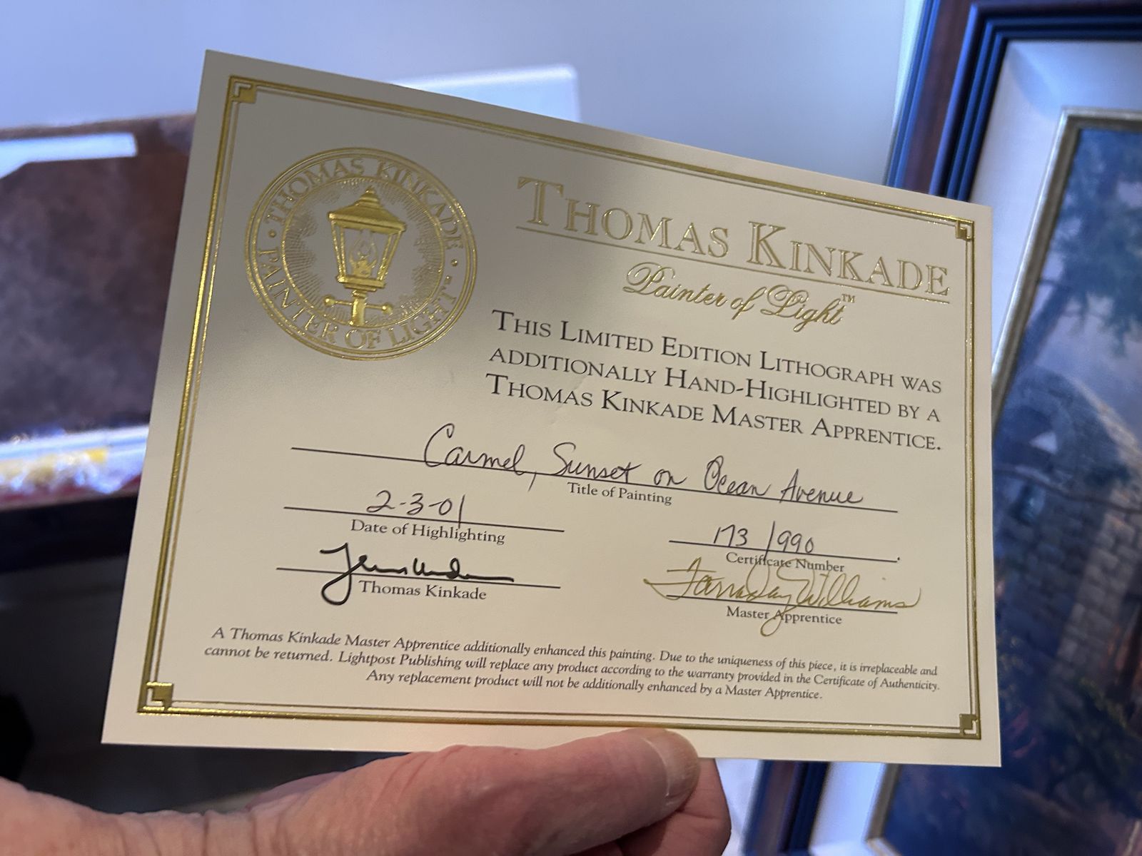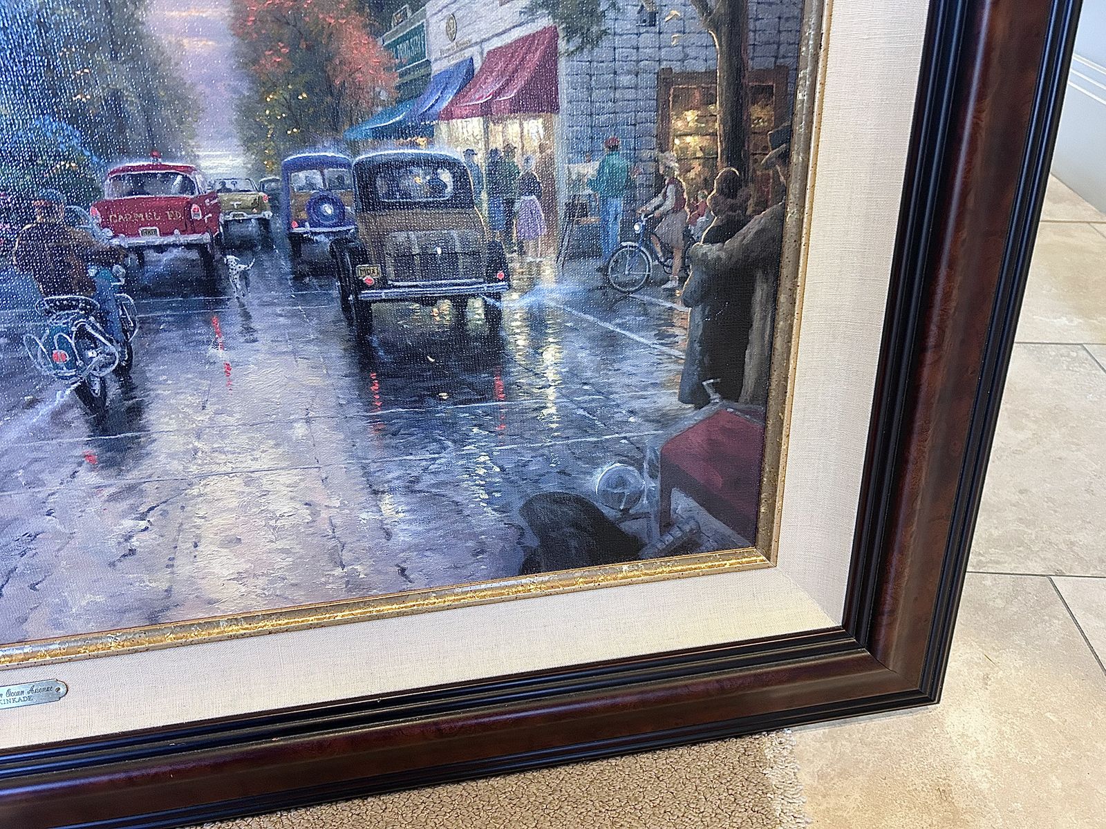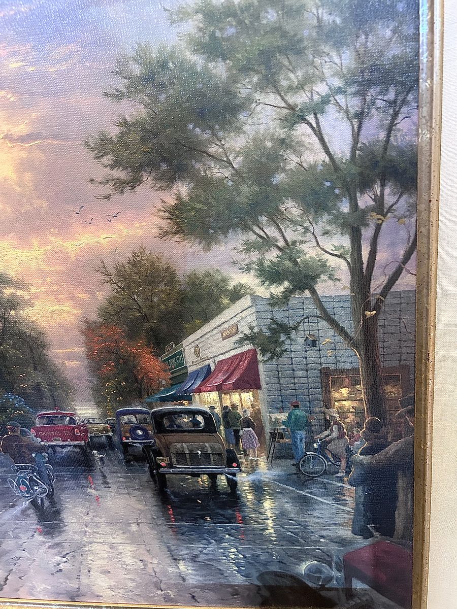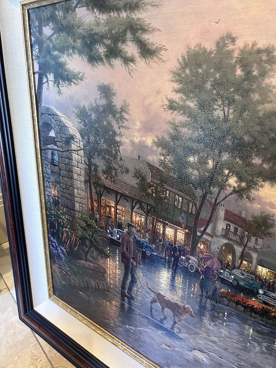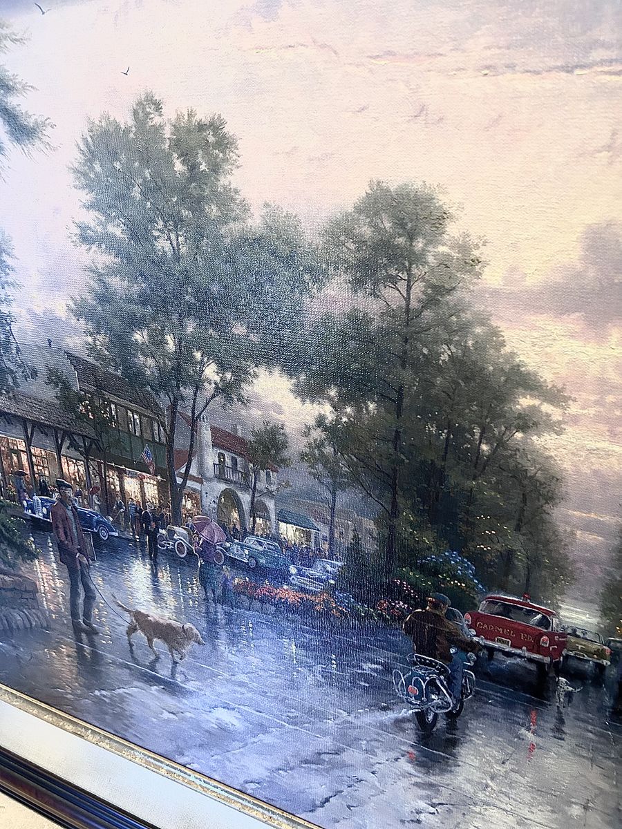 ZelleThe Thomas Kinkade, Carmel - Sunset On Ocean Ave, painting is a limited edition piece signed by the artist himself. This large canvas painting depicts a beautiful landscape of Carmel, California, showcasing a stunning sunset on Ocean Avenue. Produced in 2001 using oil painting techniques, this contemporary artwork comes framed with a Certificate of Authenticity issued by the artist's studio. This licensed reproduction is a nature-themed piece that captures the essence of cityscapes and sunsets, making it a valuable addition to any art collection.