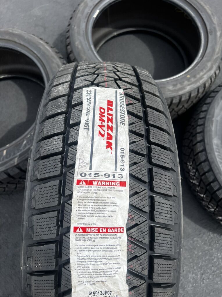 ZelleBrand new set of 4 235/55R20 Bridgestone Blizzak DM-V2 snow tires. DM-V2 is an ice and snow winter tire that is specially engineered for drivers of SUVs, CUVs, and light pickup trucks who are looking for a superior grip in unpredictable wintry conditions. This tire offers exceptional traction in slush, snow, and ice, boosting your driving confidence and competence in the freezing conditions. Best-suited for: SUVs, CUVs, and Light Pickup Trucks. Tire Features: Next-Generation Multicell Compound for resistance against hydroplaning and improved traction and braking on glare ice. Reliable wet road-handling and confident stopping power on snow and ice. Aggressively blocked edges and enhanced ground contact for better control on ice surfaces. Microscopic bite particles enhance traction on ice. Tread depth indicators alert the user of the tire’s life. Mountain/ Snowflake (3PMSF) rated tires.