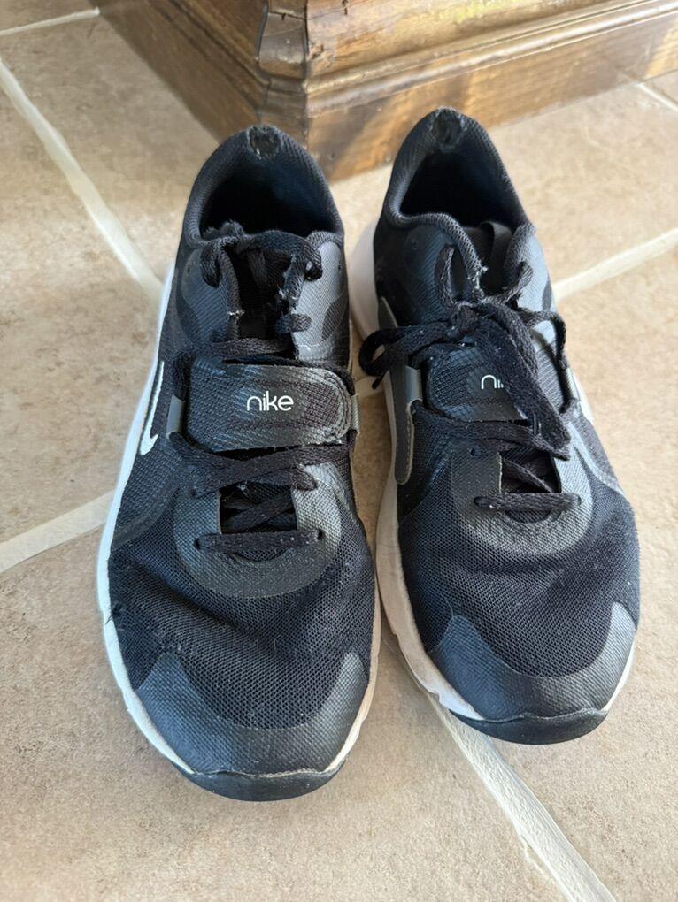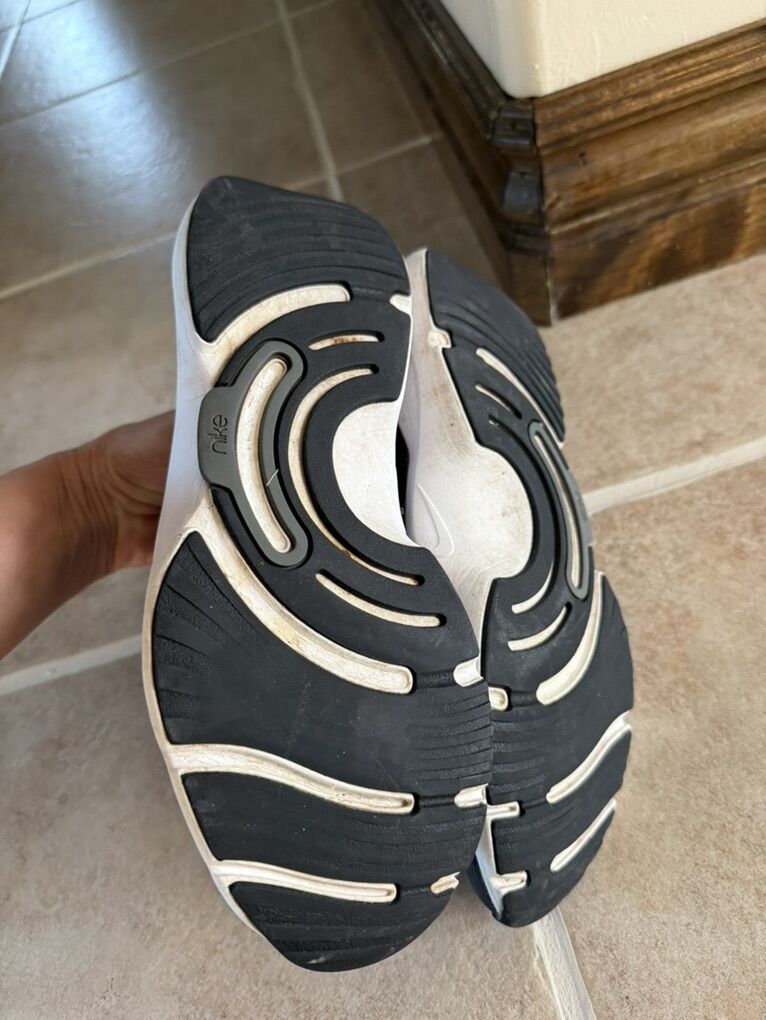 Nike women’s shoes black and white size 9 they have wear on inside of back of shoes and a couple small holes on the side.