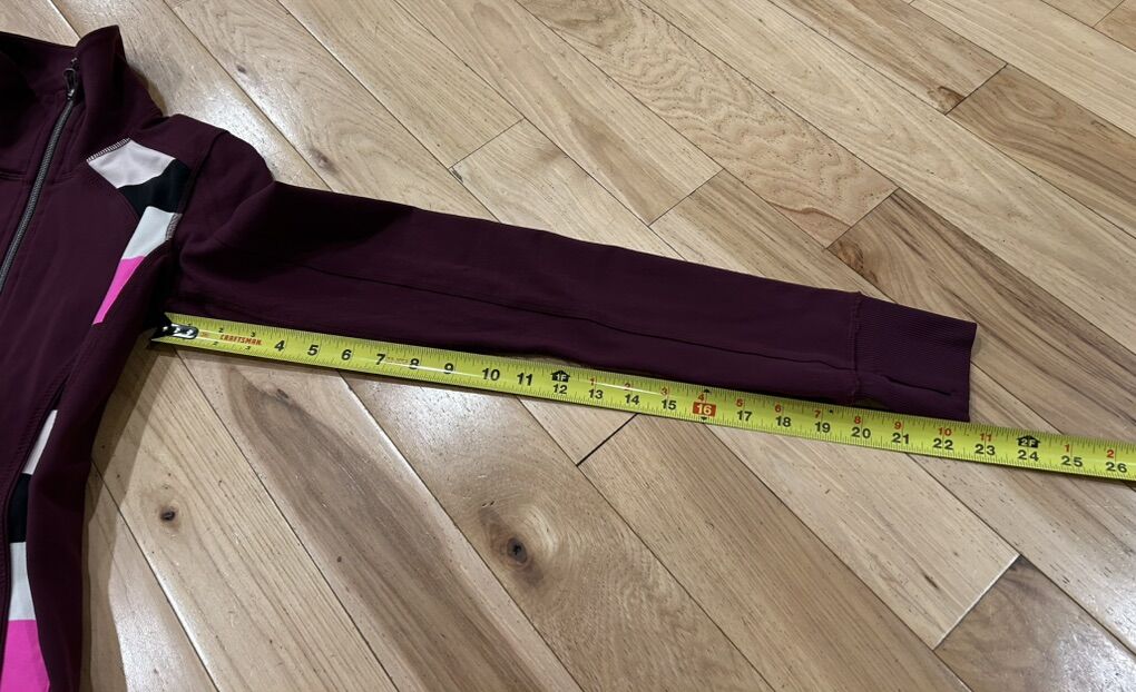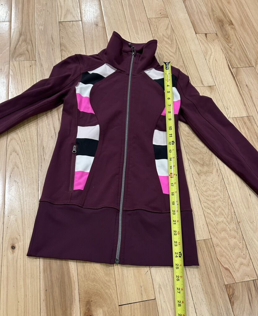 Lululemon Asana Jacket - Plum Raspberry Purple Striped - Full Zippered Front Closure - Women’s Size 2 (please note the rip tag has been removed so size has estimated off measurements) - with pockets and thumb holes - long sleeved - good condition - pre-owned.