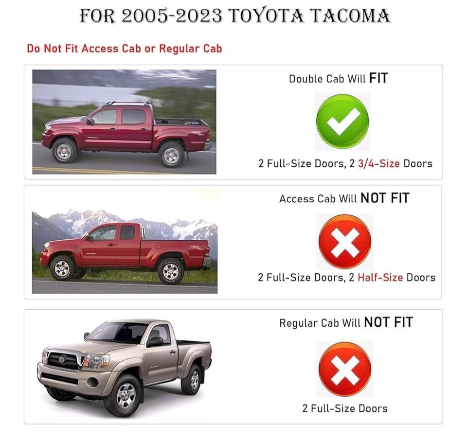 Vehicle Service Type 2005-2023 Toyota Tacoma, Double Cab (Crew Cab)Models Only!!!! Material Aluminum, Plastic Brand APSVE Is Foldable No Load Capacity 160 Pounds Compatible Model & Year: 2005 2006 2007 2008 2009 2010 2011 2012 2013 2014 2015 2016 2017 2018 2019 2020 2021 2022 2023 Toyota Tacoma Double Cab. !!!Double Cab (Crew Cab)Models Only!!!! Not Fit Access Cab. Made of high quality light weight durable aluminum Black powder finish for long lasting, water proof and anti-corrosion. Load capacity : 160lbs. (when load is evenly distributed). Size: L 61-3/4 (in) * W 42 (in) Great solution for oversized items that you need to transport like: kayaks, canoes, luggage, snowboards, skis, bikes, fishing poles and more. Package includes: 1 X Roof Rack, 1 X Cross Bar Set, Screw Kit Easy to install with instructions.