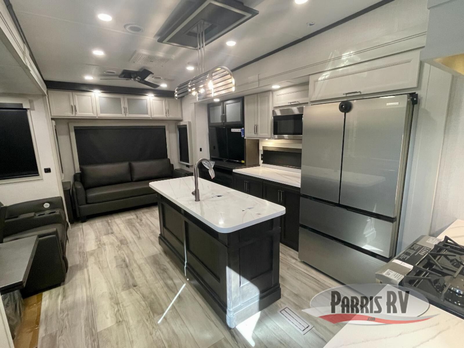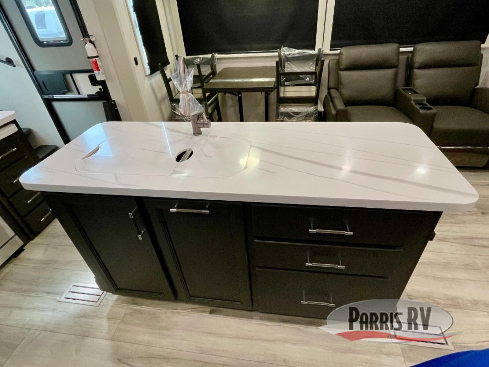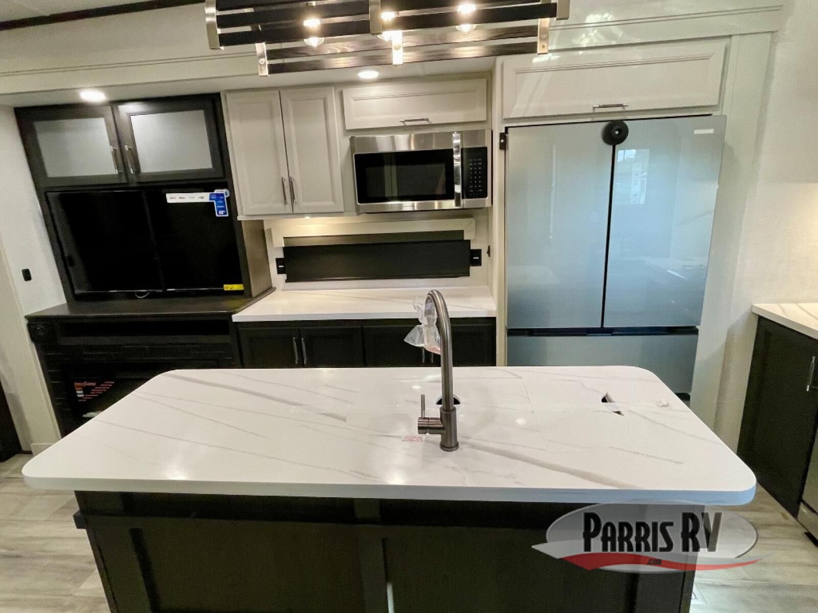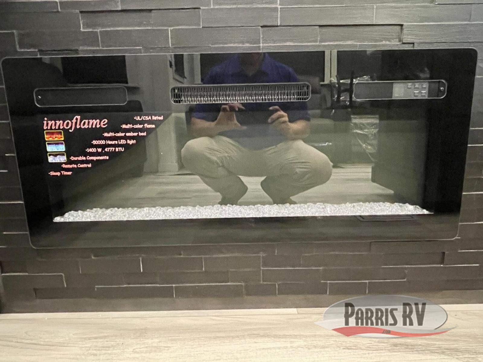 You will feel right at home camping in this fifth wheel! The chef will have lots of countertop space to prepare their best meals along with a kitchen island, two pull-out pantries to store your dishes, and an 18 cu. ft. residential refrigerator to store any leftovers. The free standing dinette offers a comfortable place to enjoy your meals, and the theater seating across from the fireplace and entertainment center will be perfect for movie nights. There is also a rear hide-a-bed sofa sleeper for any guests you may have. You will love the full bath that includes a shower with a seat, a linen closet, plus two bath sinks for convenience. And don't overlook the front bedroom with a sliding door, king bed slide out, and master closet for all your things. You'll also find stackable washer and dryer prep, two drawers, and a Smart HDTV for movies in bed.