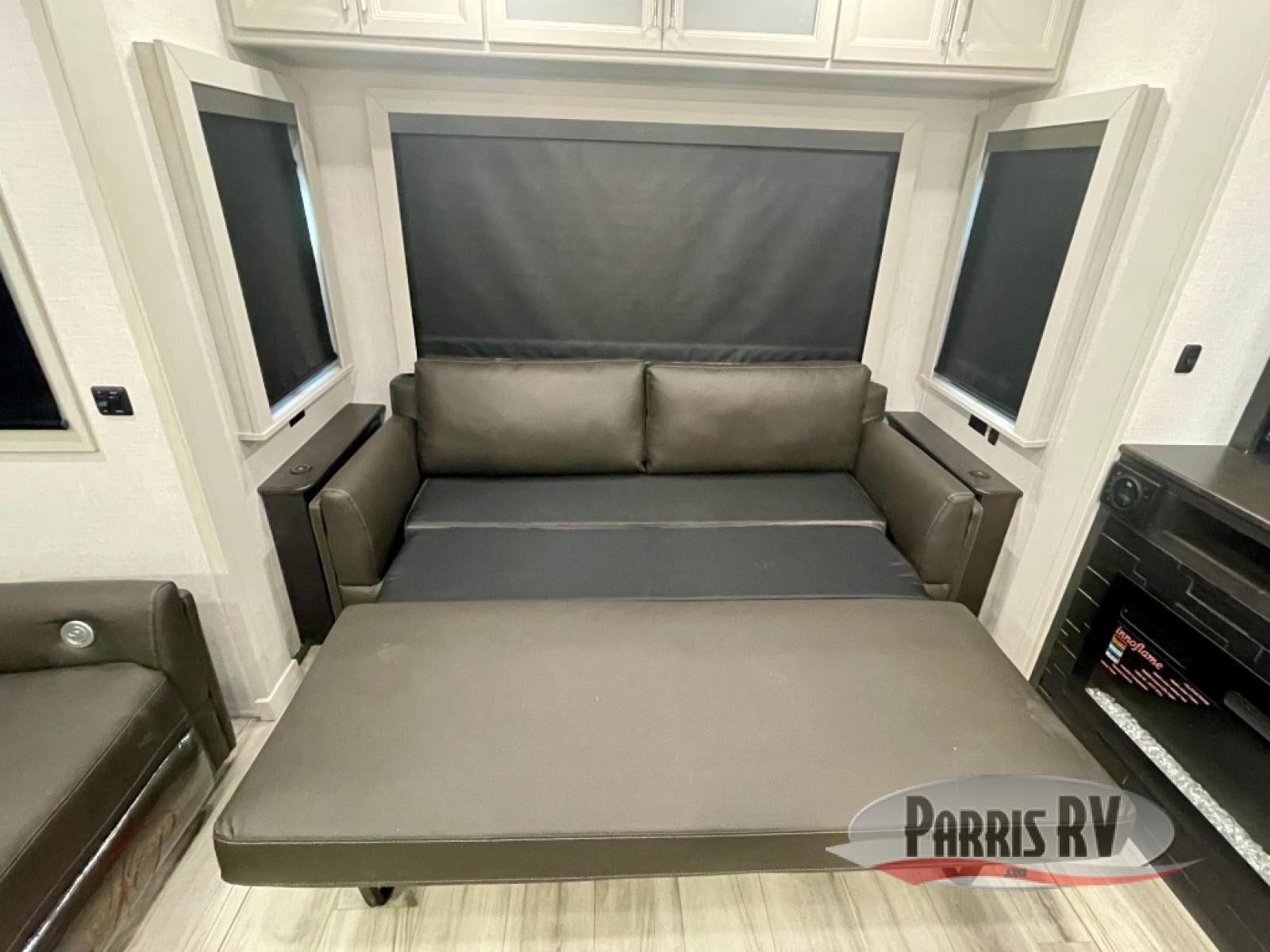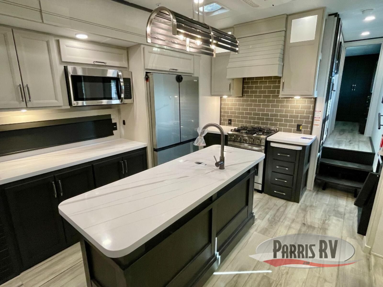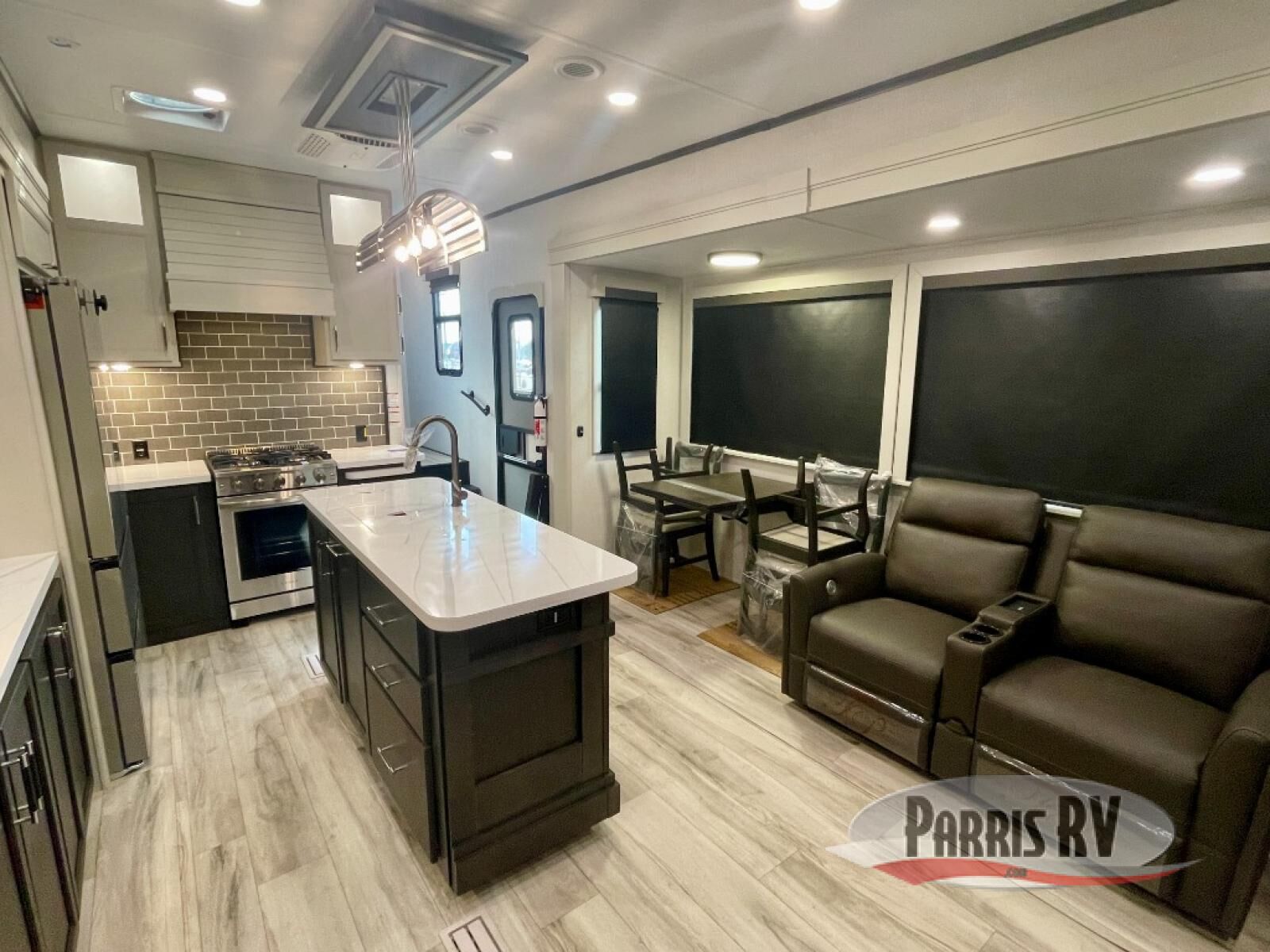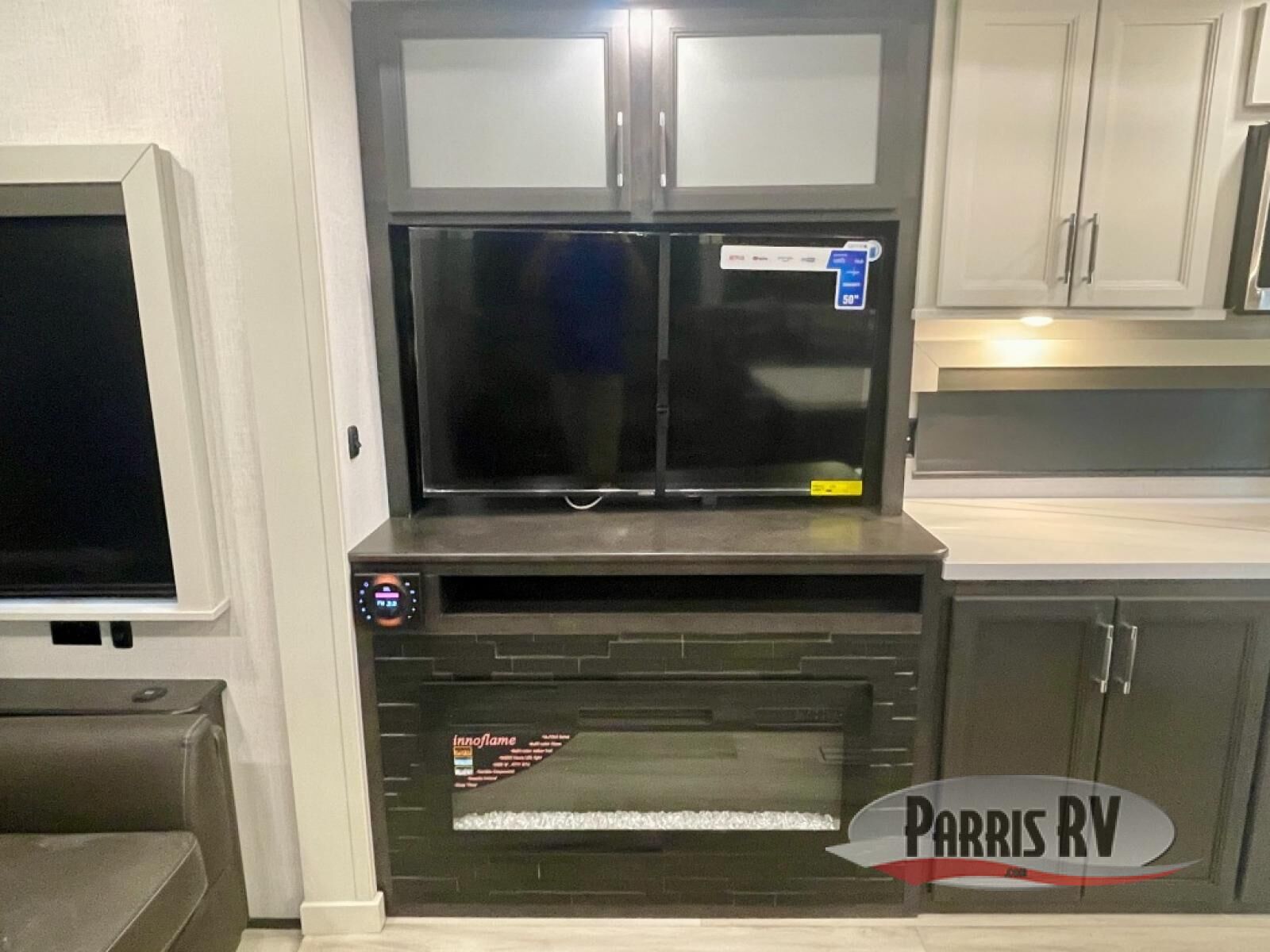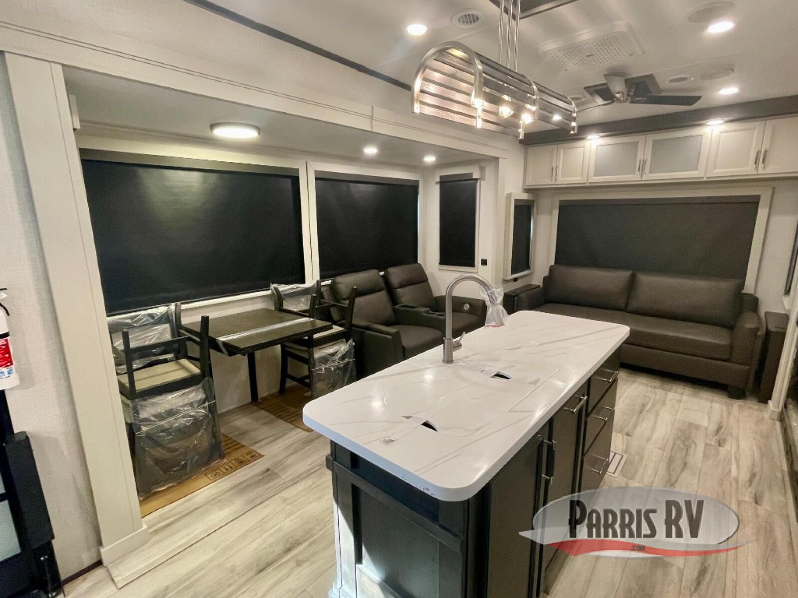 You will feel right at home camping in this fifth wheel! The chef will have lots of countertop space to prepare their best meals along with a kitchen island, two pull-out pantries to store your dishes, and an 18 cu. ft. residential refrigerator to store any leftovers. The free standing dinette offers a comfortable place to enjoy your meals, and the theater seating across from the fireplace and entertainment center will be perfect for movie nights. There is also a rear hide-a-bed sofa sleeper for any guests you may have. You will love the full bath that includes a shower with a seat, a linen closet, plus two bath sinks for convenience. And don't overlook the front bedroom with a sliding door, king bed slide out, and master closet for all your things. You'll also find stackable washer and dryer prep, two drawers, and a Smart HDTV for movies in bed.