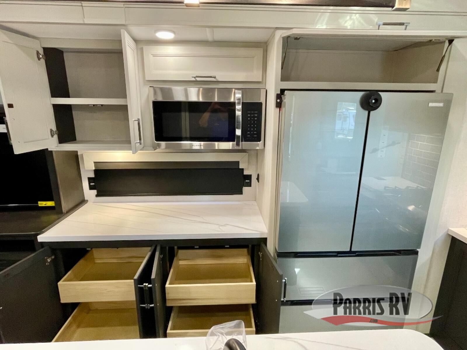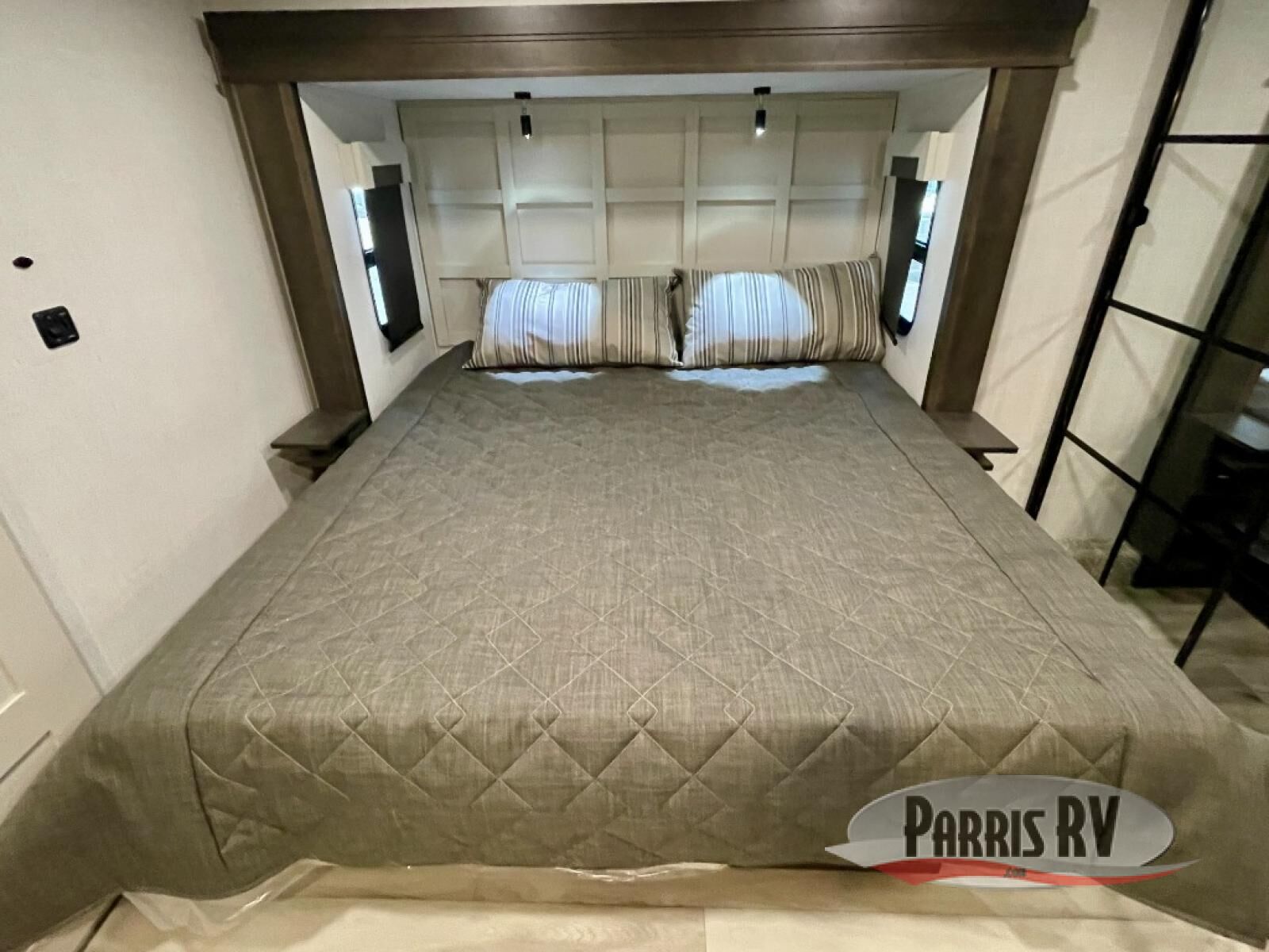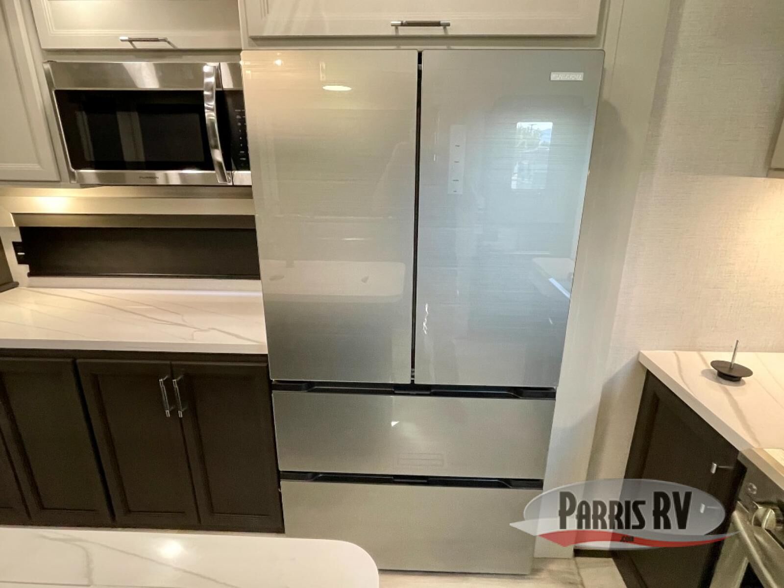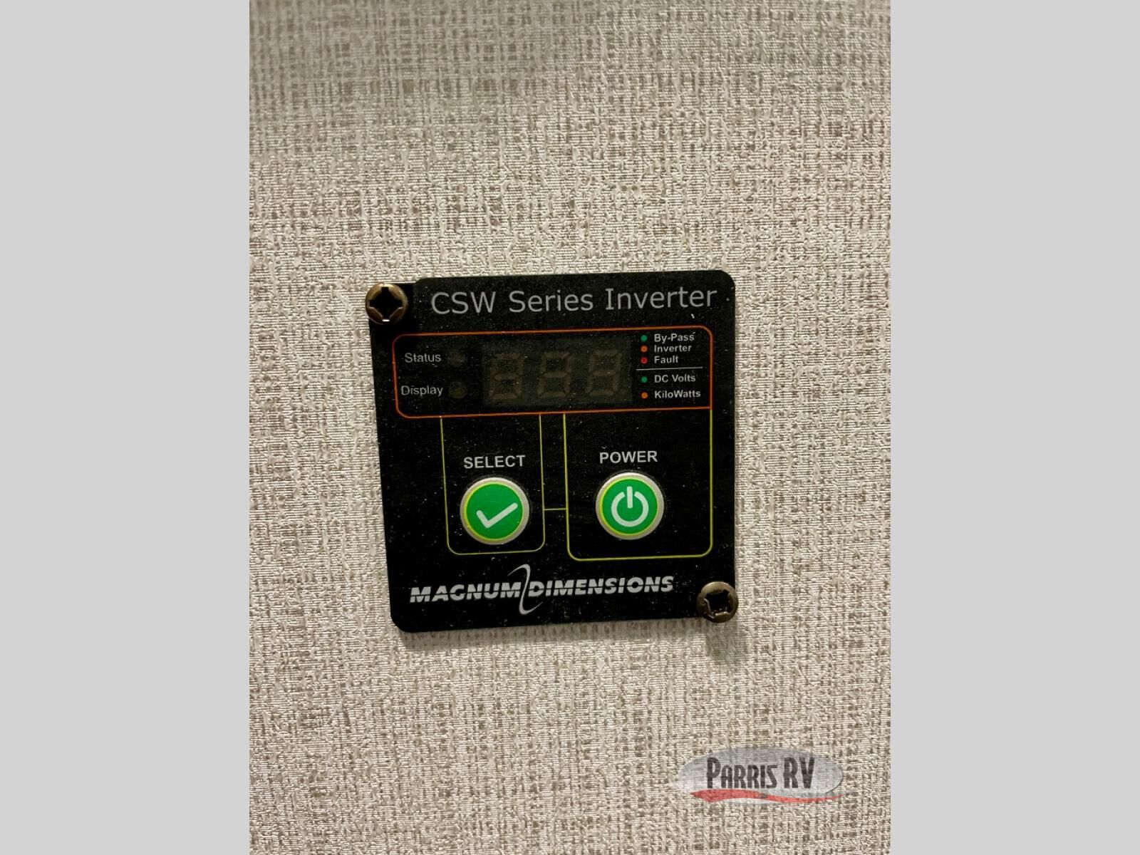 You will feel right at home camping in this fifth wheel! The chef will have lots of countertop space to prepare their best meals along with a kitchen island, two pull-out pantries to store your dishes, and an 18 cu. ft. residential refrigerator to store any leftovers. The free standing dinette offers a comfortable place to enjoy your meals, and the theater seating across from the fireplace and entertainment center will be perfect for movie nights. There is also a rear hide-a-bed sofa sleeper for any guests you may have. You will love the full bath that includes a shower with a seat, a linen closet, plus two bath sinks for convenience. And don't overlook the front bedroom with a sliding door, king bed slide out, and master closet for all your things. You'll also find stackable washer and dryer prep, two drawers, and a Smart HDTV for movies in bed.