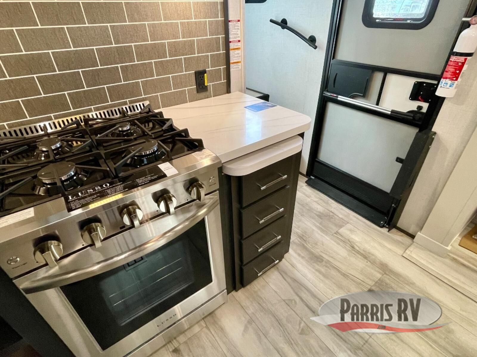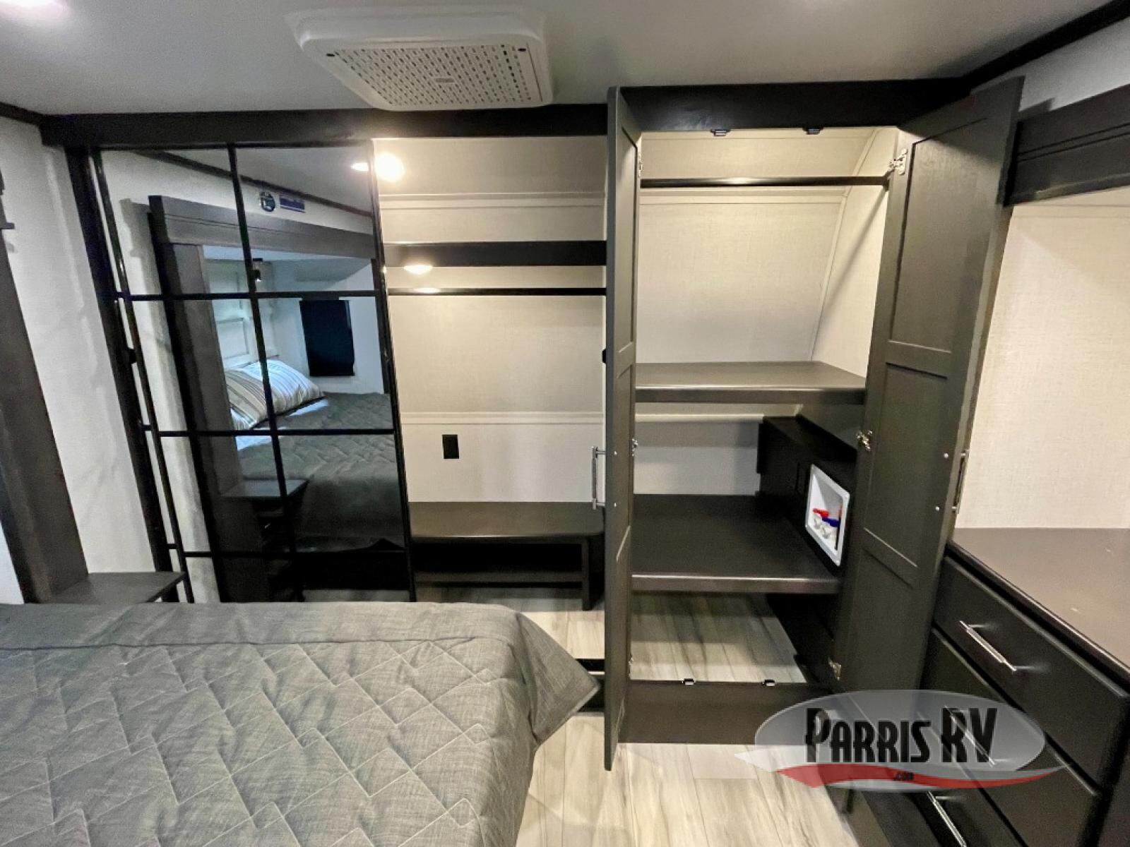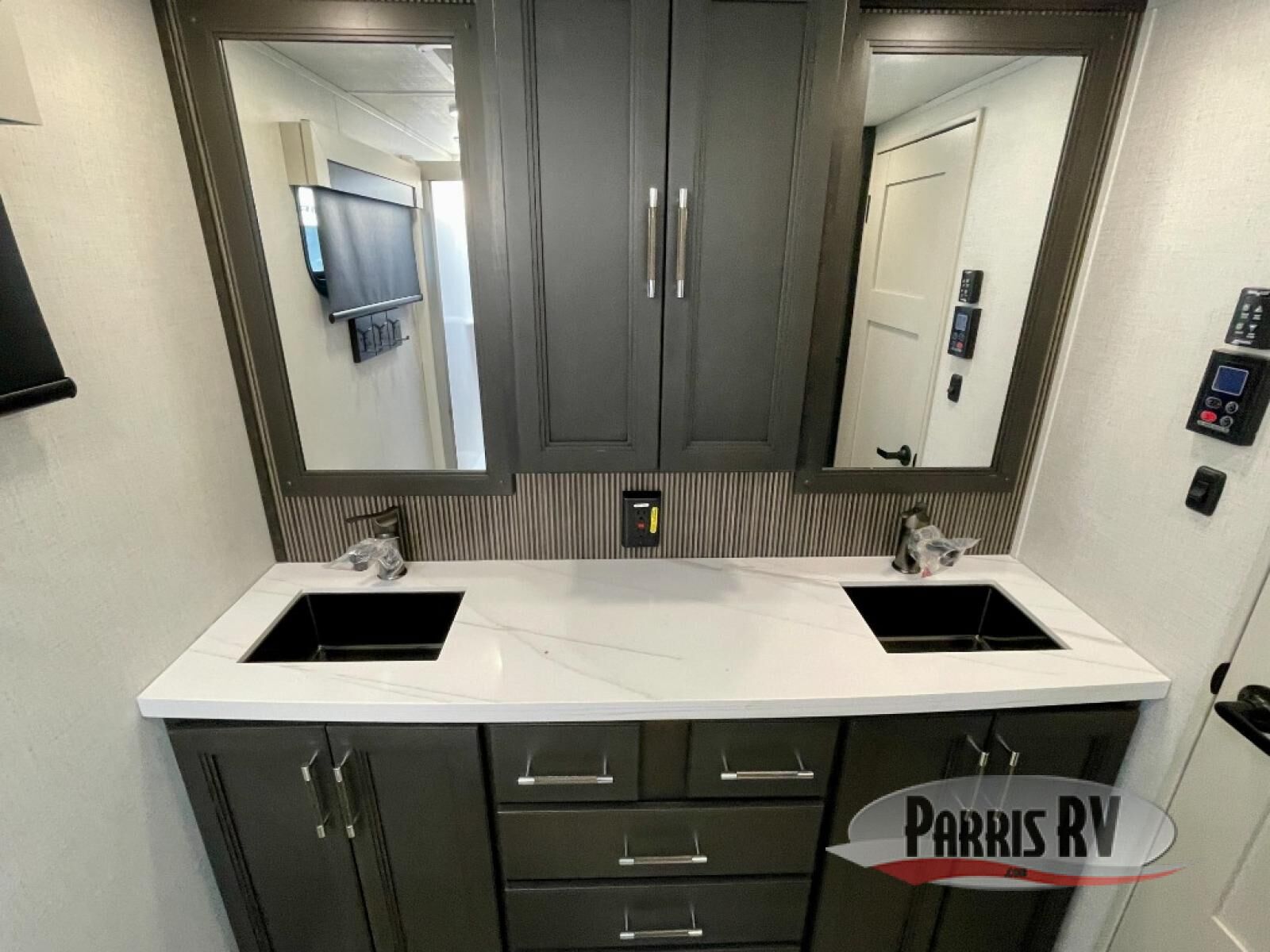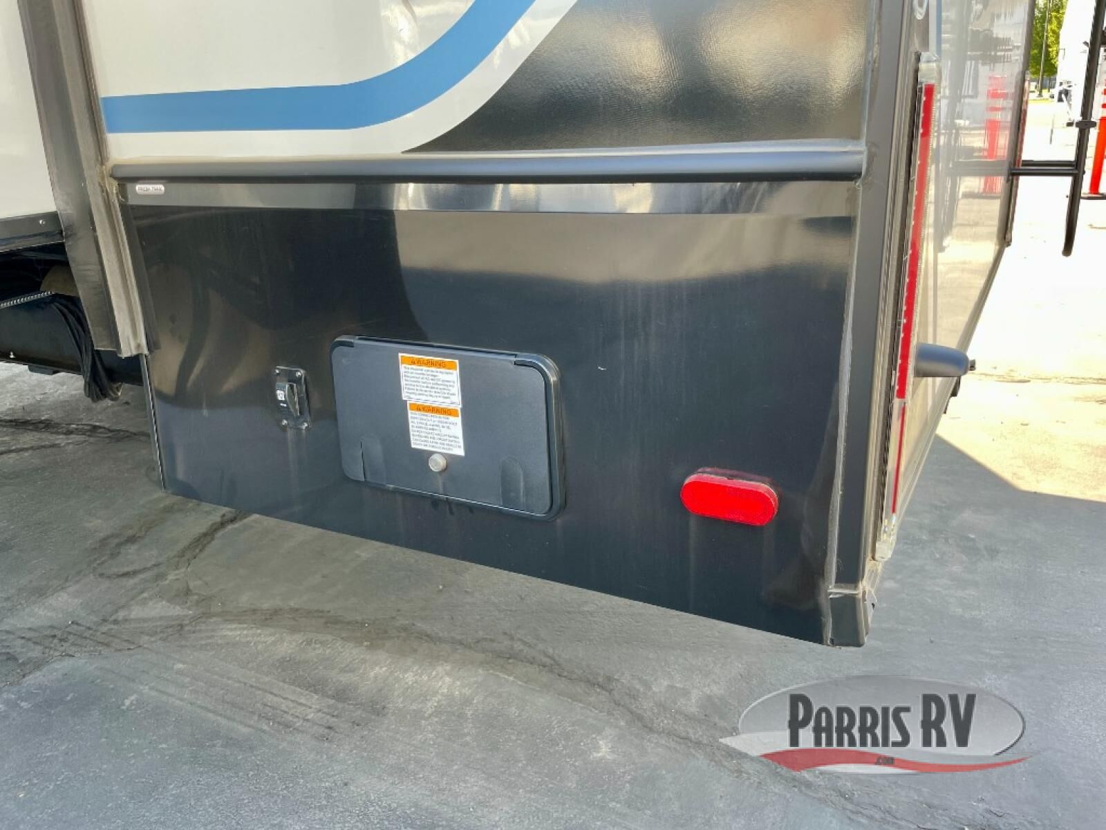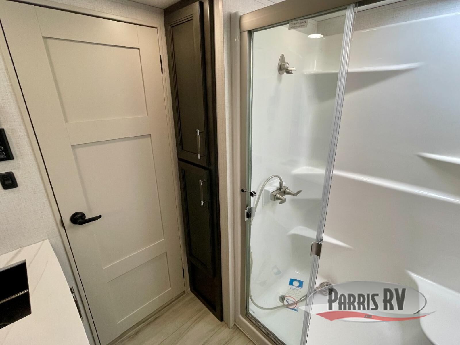 You will feel right at home camping in this fifth wheel! The chef will have lots of countertop space to prepare their best meals along with a kitchen island, two pull-out pantries to store your dishes, and an 18 cu. ft. residential refrigerator to store any leftovers. The free standing dinette offers a comfortable place to enjoy your meals, and the theater seating across from the fireplace and entertainment center will be perfect for movie nights. There is also a rear hide-a-bed sofa sleeper for any guests you may have. You will love the full bath that includes a shower with a seat, a linen closet, plus two bath sinks for convenience. And don't overlook the front bedroom with a sliding door, king bed slide out, and master closet for all your things. You'll also find stackable washer and dryer prep, two drawers, and a Smart HDTV for movies in bed.