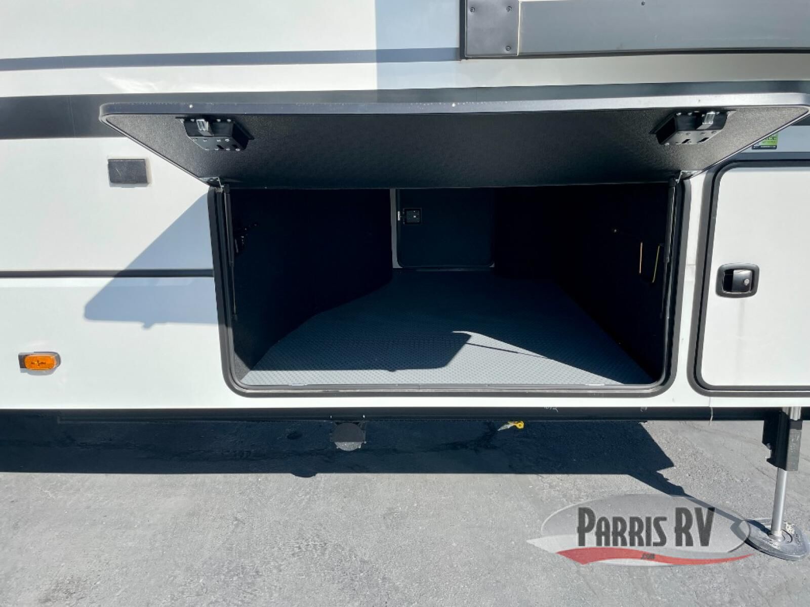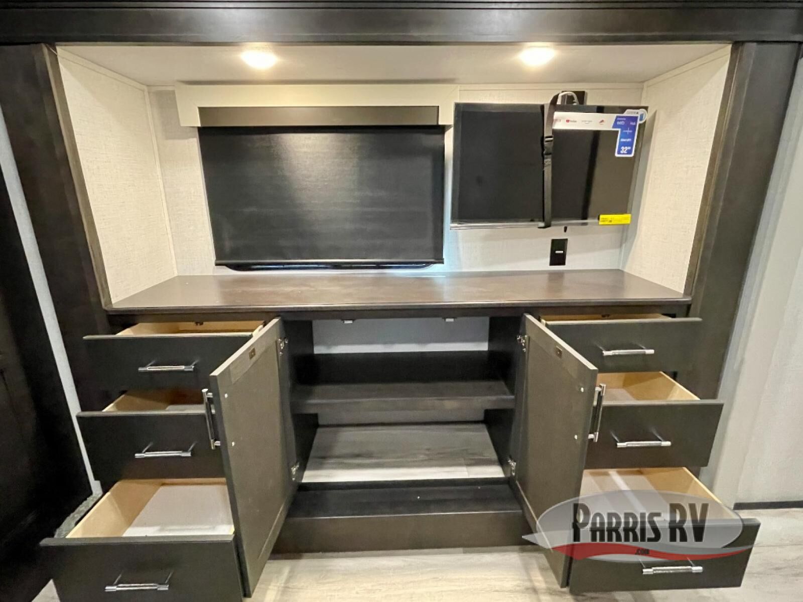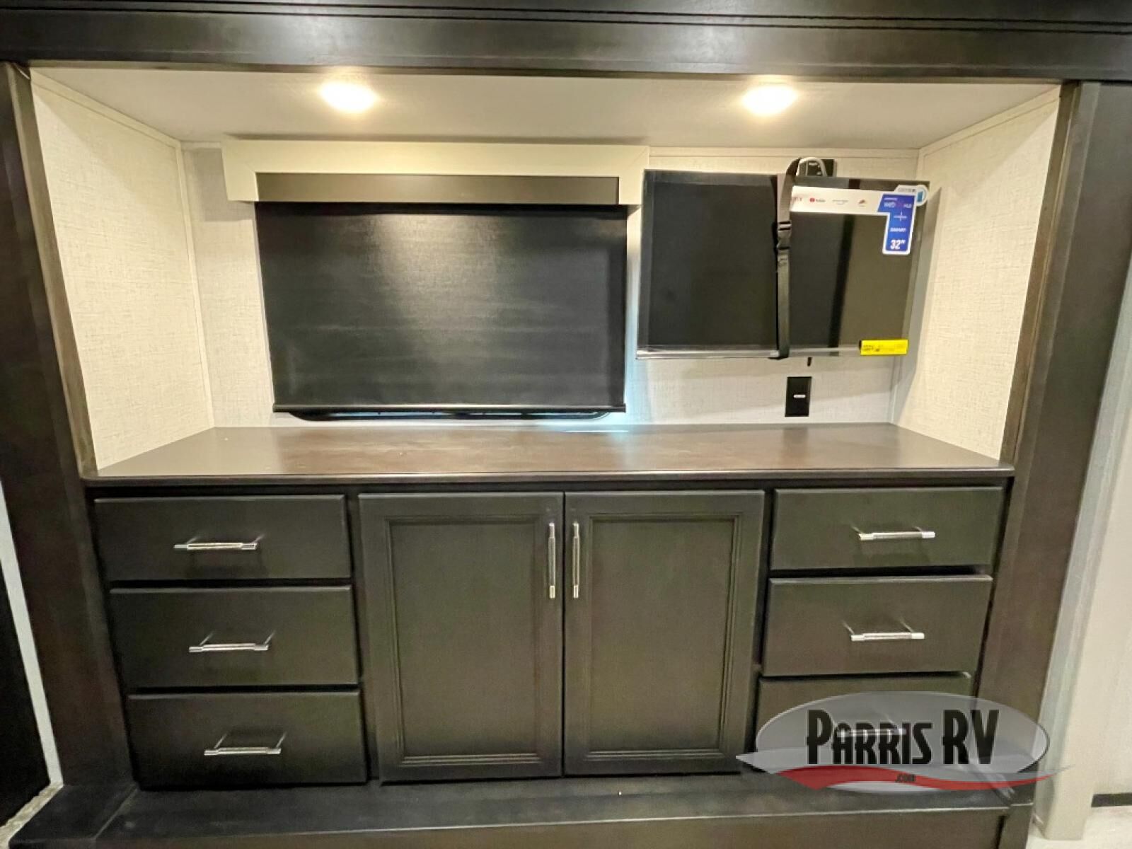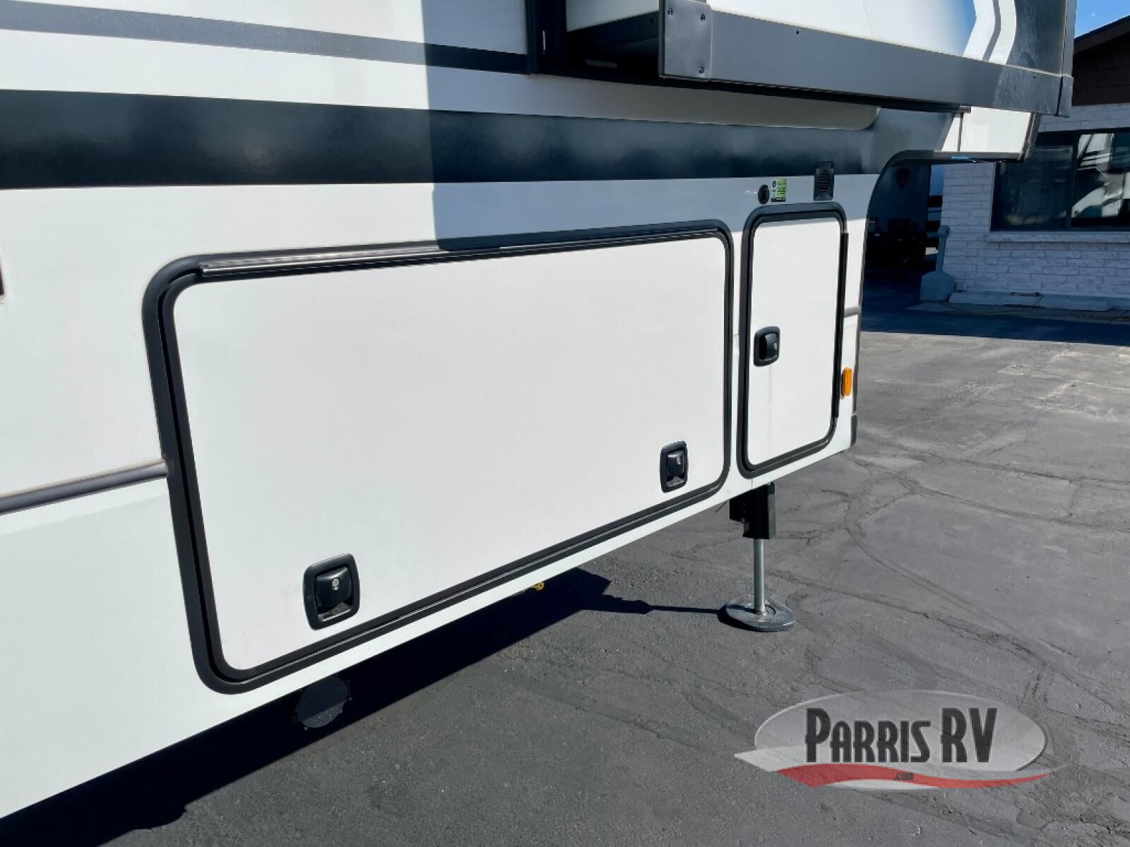 You will feel right at home camping in this fifth wheel! The chef will have lots of countertop space to prepare their best meals along with a kitchen island, two pull-out pantries to store your dishes, and an 18 cu. ft. residential refrigerator to store any leftovers. The free standing dinette offers a comfortable place to enjoy your meals, and the theater seating across from the fireplace and entertainment center will be perfect for movie nights. There is also a rear hide-a-bed sofa sleeper for any guests you may have. You will love the full bath that includes a shower with a seat, a linen closet, plus two bath sinks for convenience. And don't overlook the front bedroom with a sliding door, king bed slide out, and master closet for all your things. You'll also find stackable washer and dryer prep, two drawers, and a Smart HDTV for movies in bed.