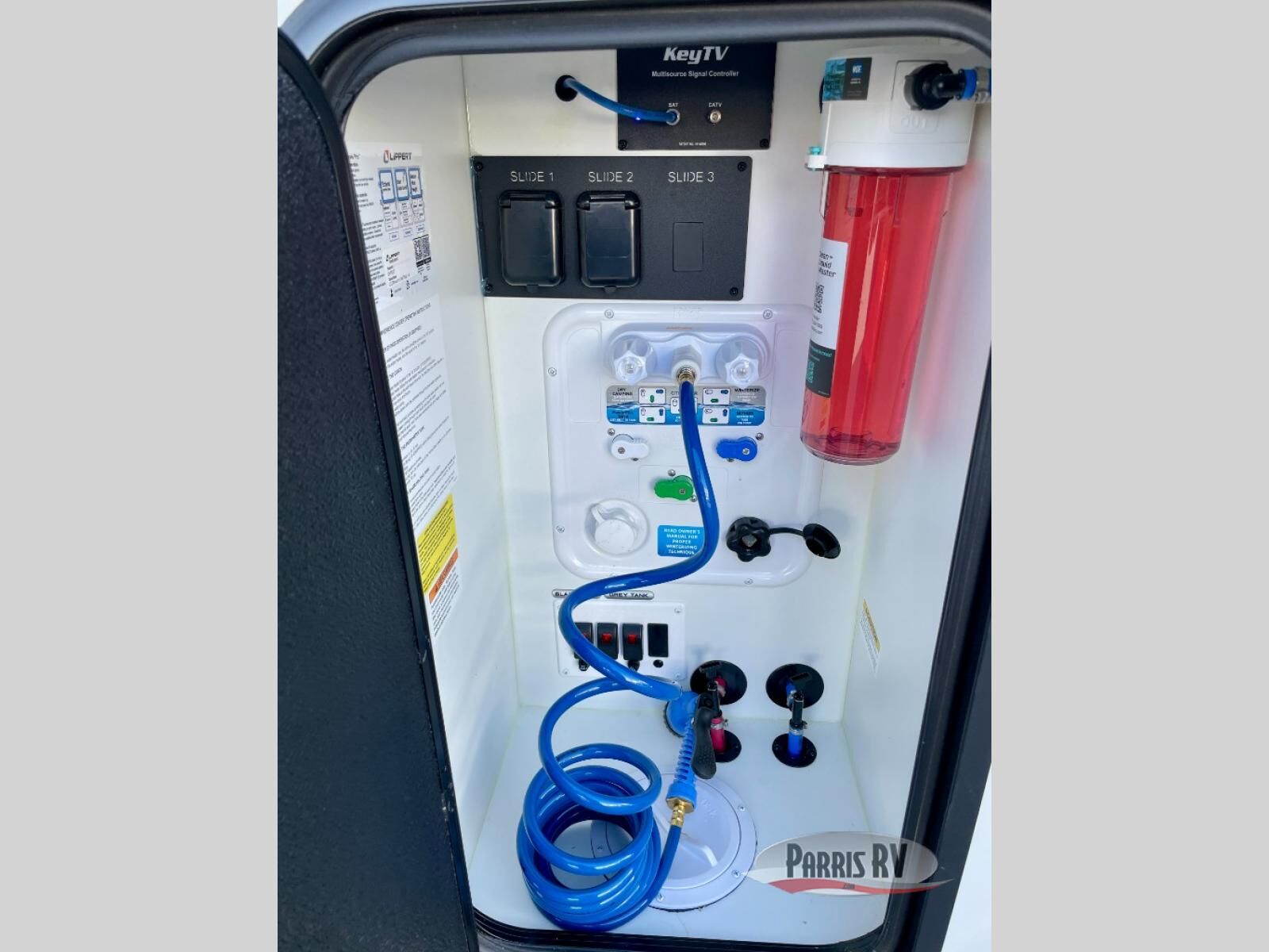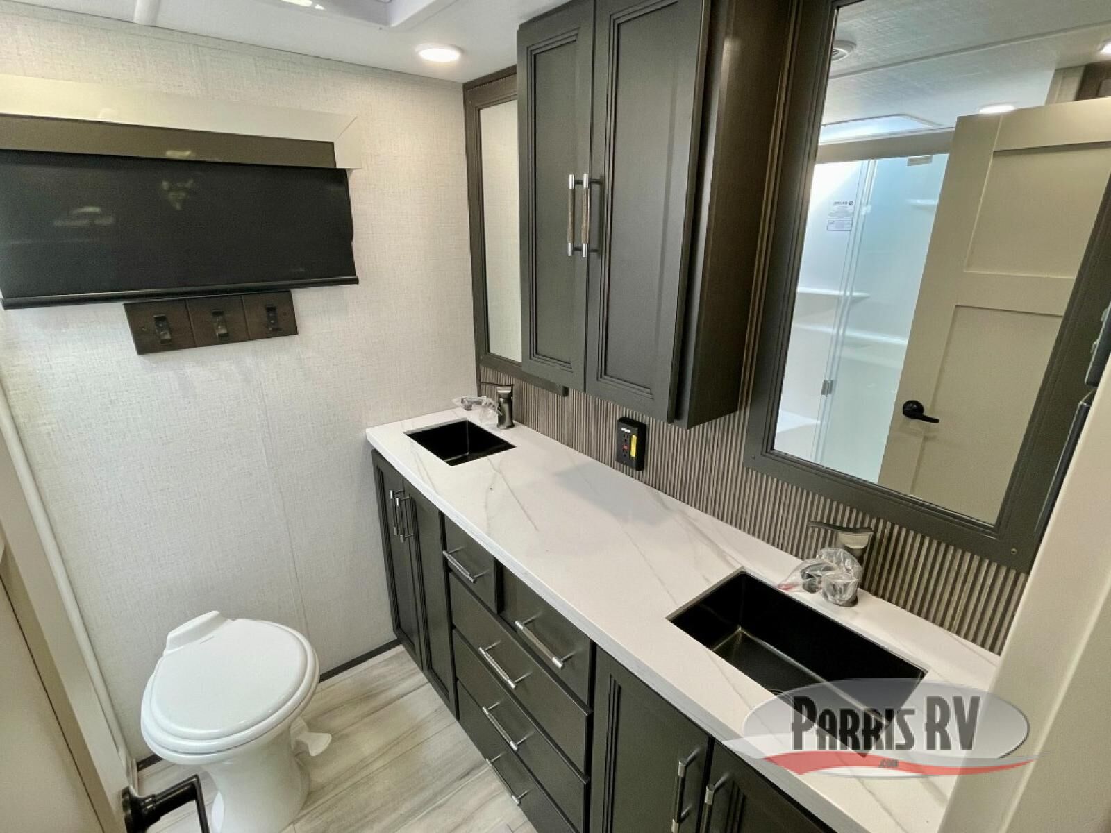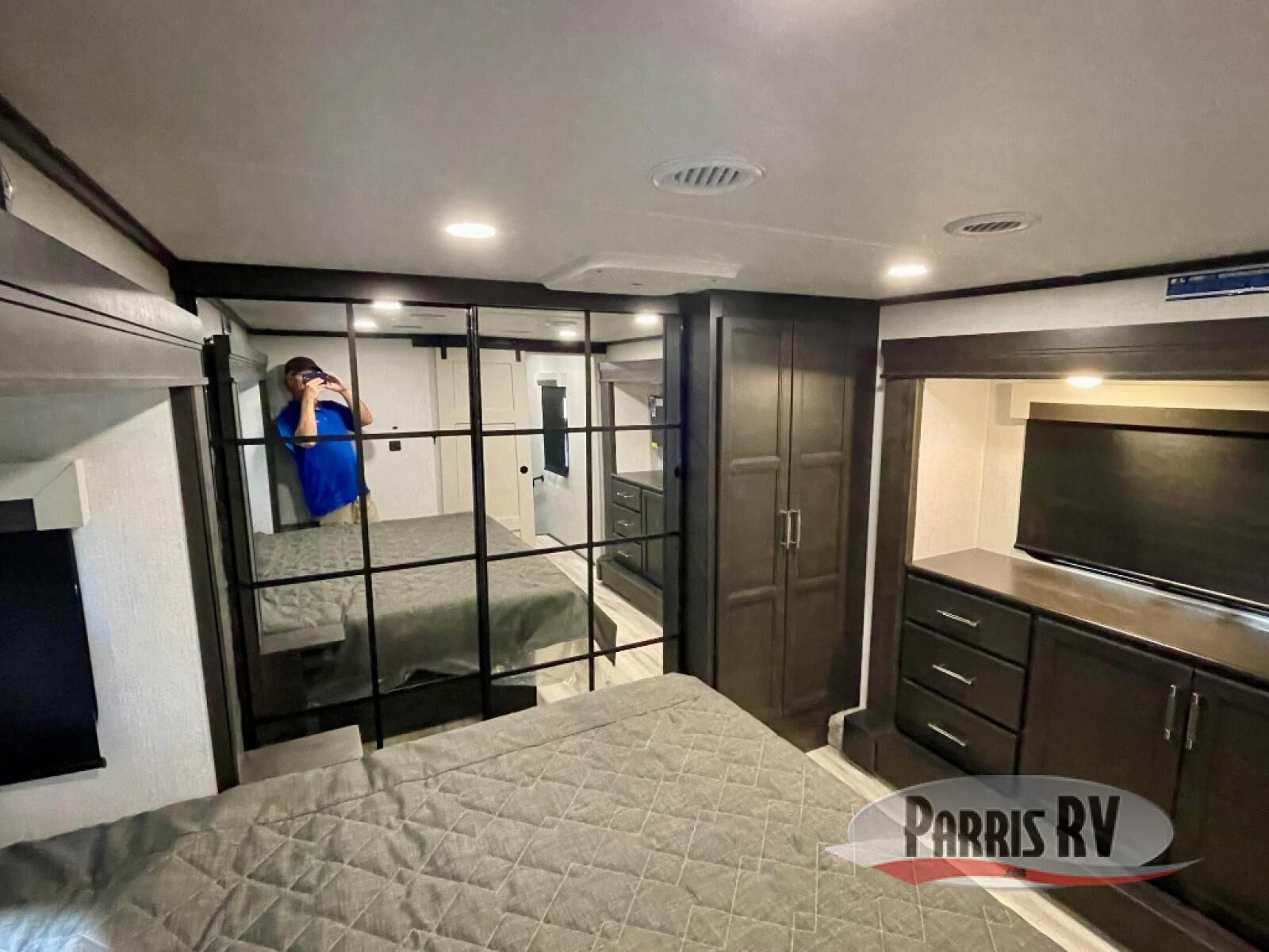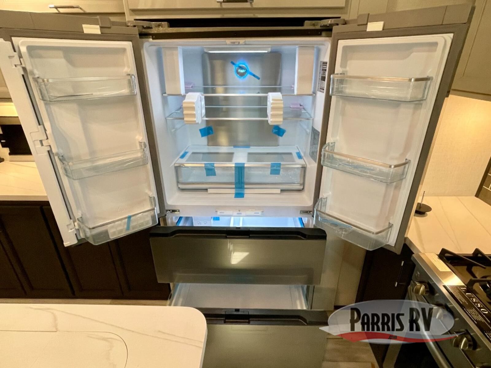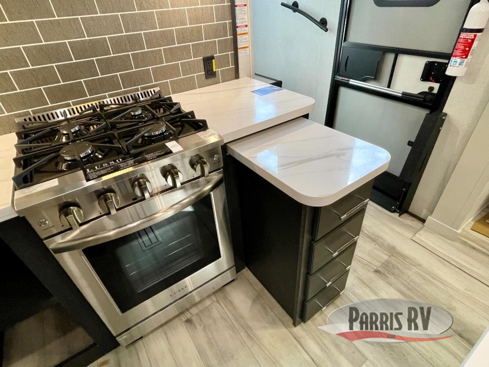 You will feel right at home camping in this fifth wheel! The chef will have lots of countertop space to prepare their best meals along with a kitchen island, two pull-out pantries to store your dishes, and an 18 cu. ft. residential refrigerator to store any leftovers. The free standing dinette offers a comfortable place to enjoy your meals, and the theater seating across from the fireplace and entertainment center will be perfect for movie nights. There is also a rear hide-a-bed sofa sleeper for any guests you may have. You will love the full bath that includes a shower with a seat, a linen closet, plus two bath sinks for convenience. And don't overlook the front bedroom with a sliding door, king bed slide out, and master closet for all your things. You'll also find stackable washer and dryer prep, two drawers, and a Smart HDTV for movies in bed.