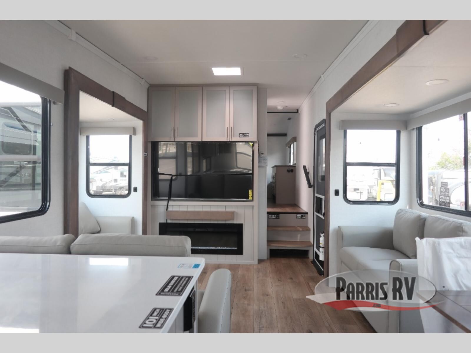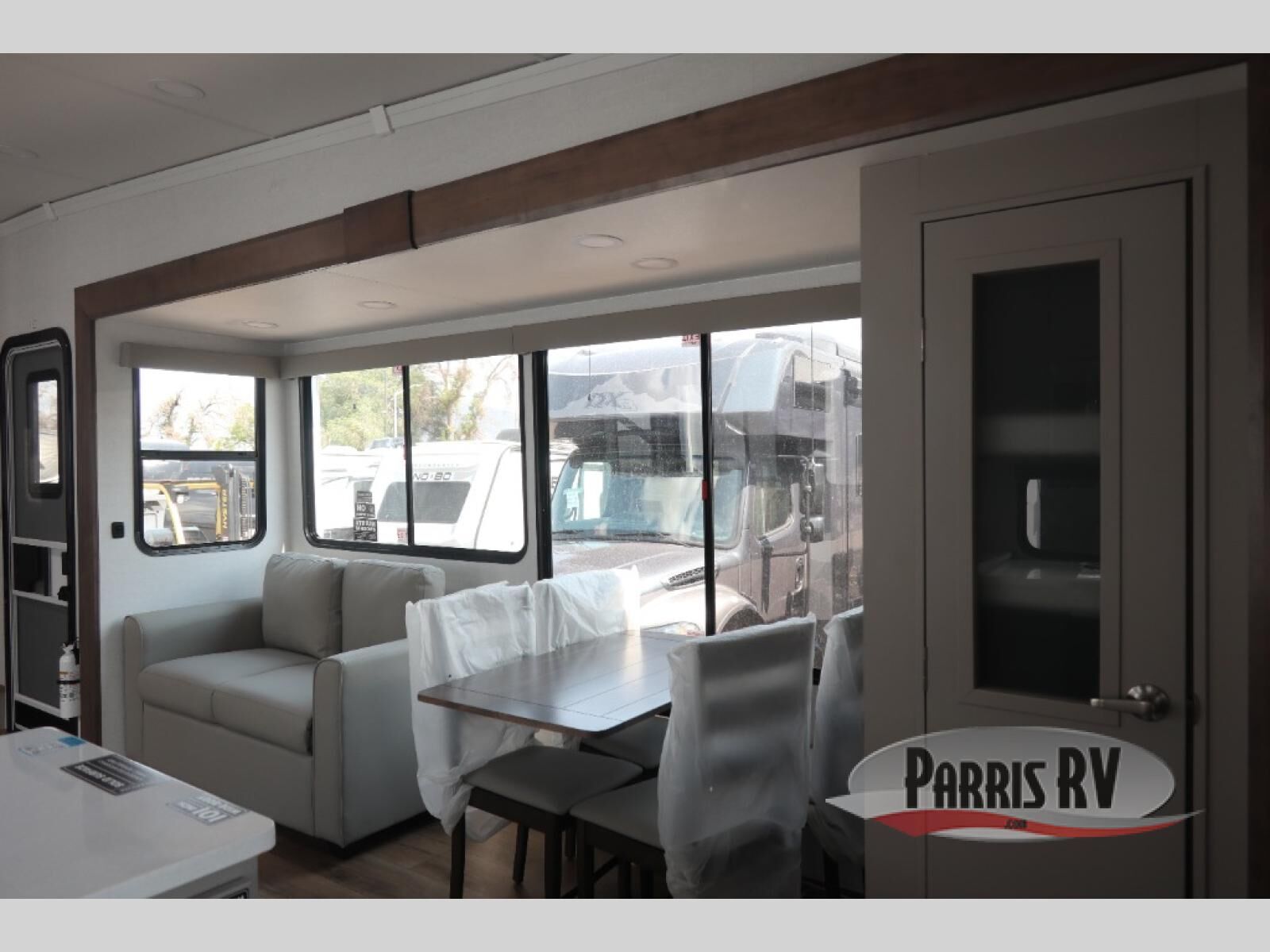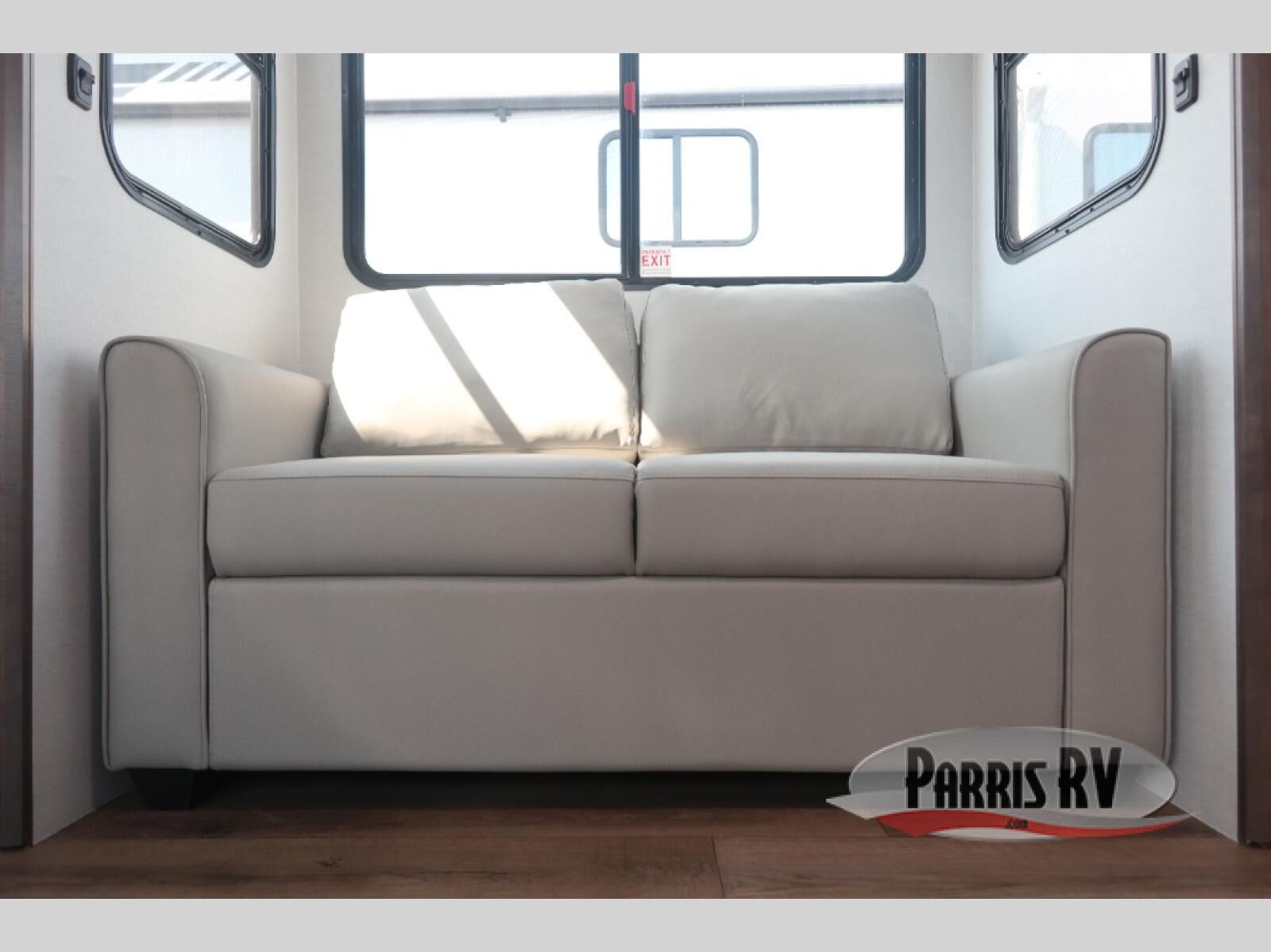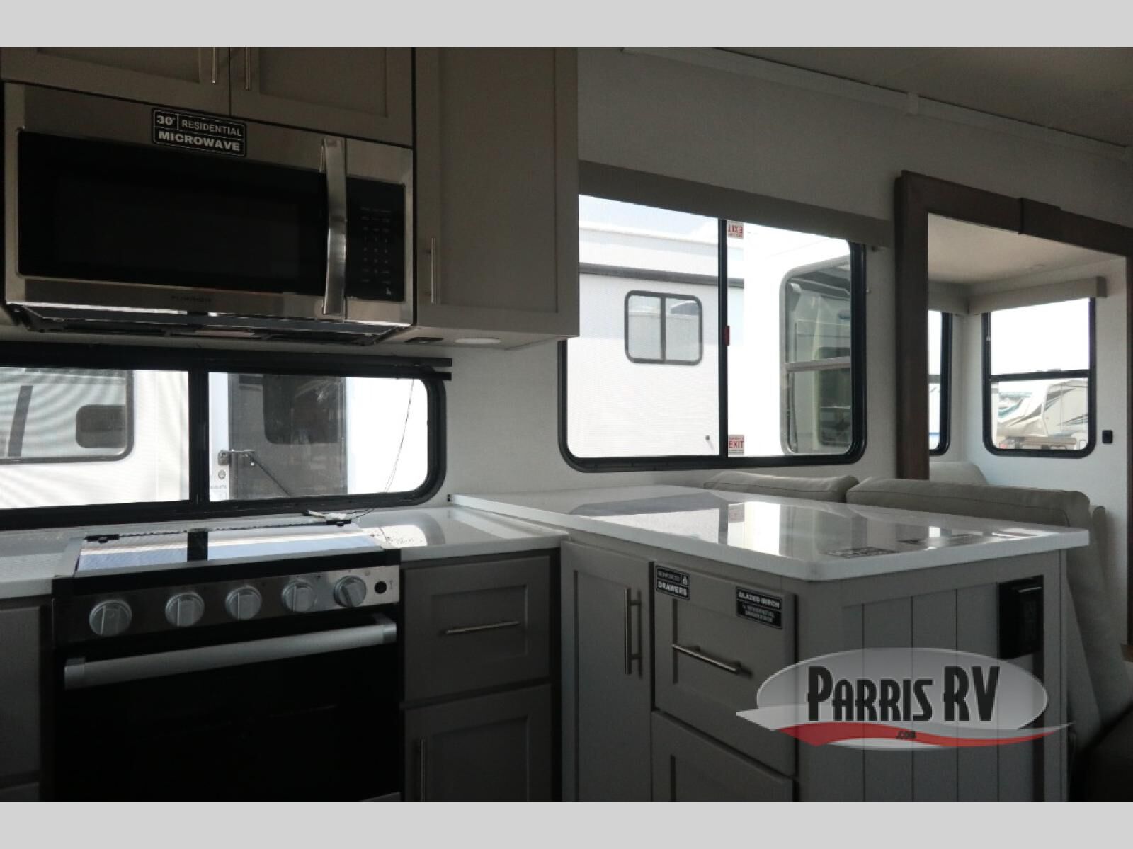 You're sure to love every minute spent in this triple slide out fifth wheel! There are dual sleeper sofas in the middle living area where your guests can sleep, while you take the queen bed slide out in the front bedroom. There is also a king bed option, a walk-in closet with washer and dryer prep, plus a dresser for even more storage. Back in the living area, you can relax on the dual recliner loveseat that sits across from the fireplace and 65" TV. Once dinner has been made on the three burner cooktop, you can dine at the floating dinette table with four chairs.