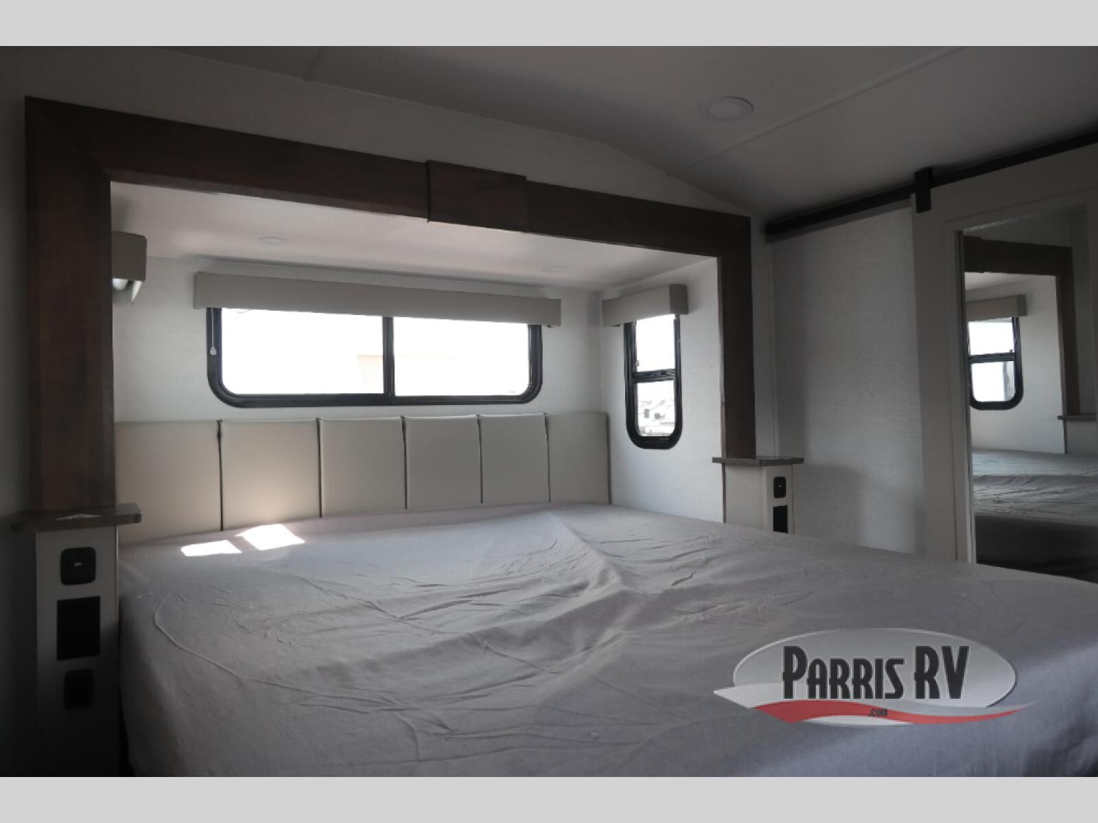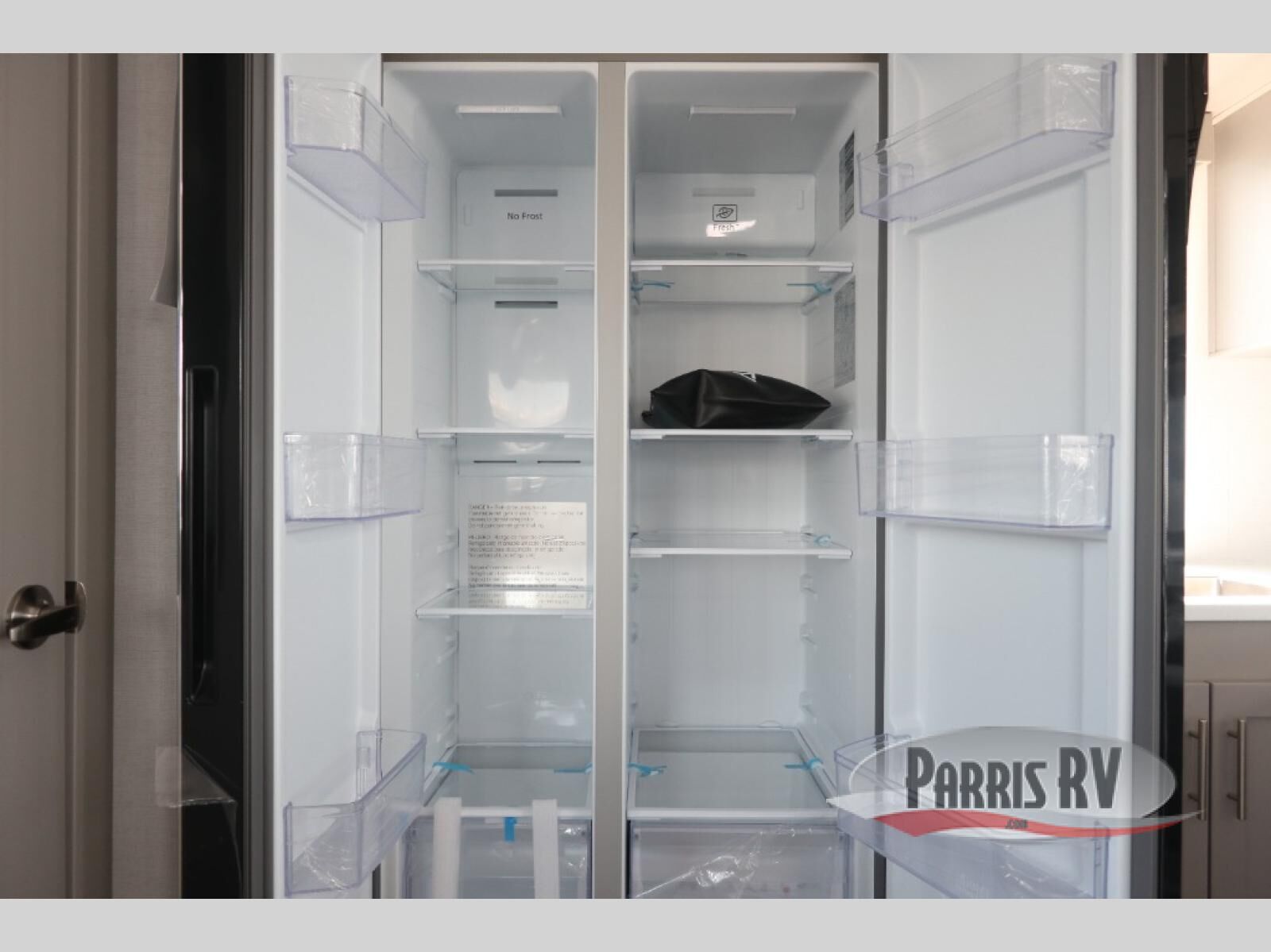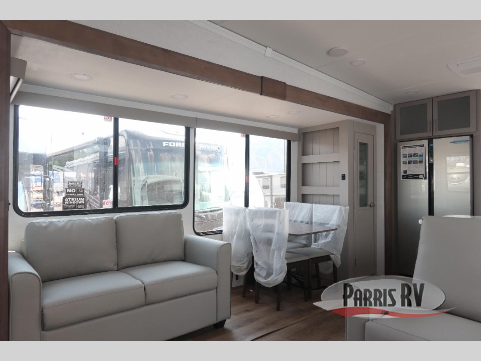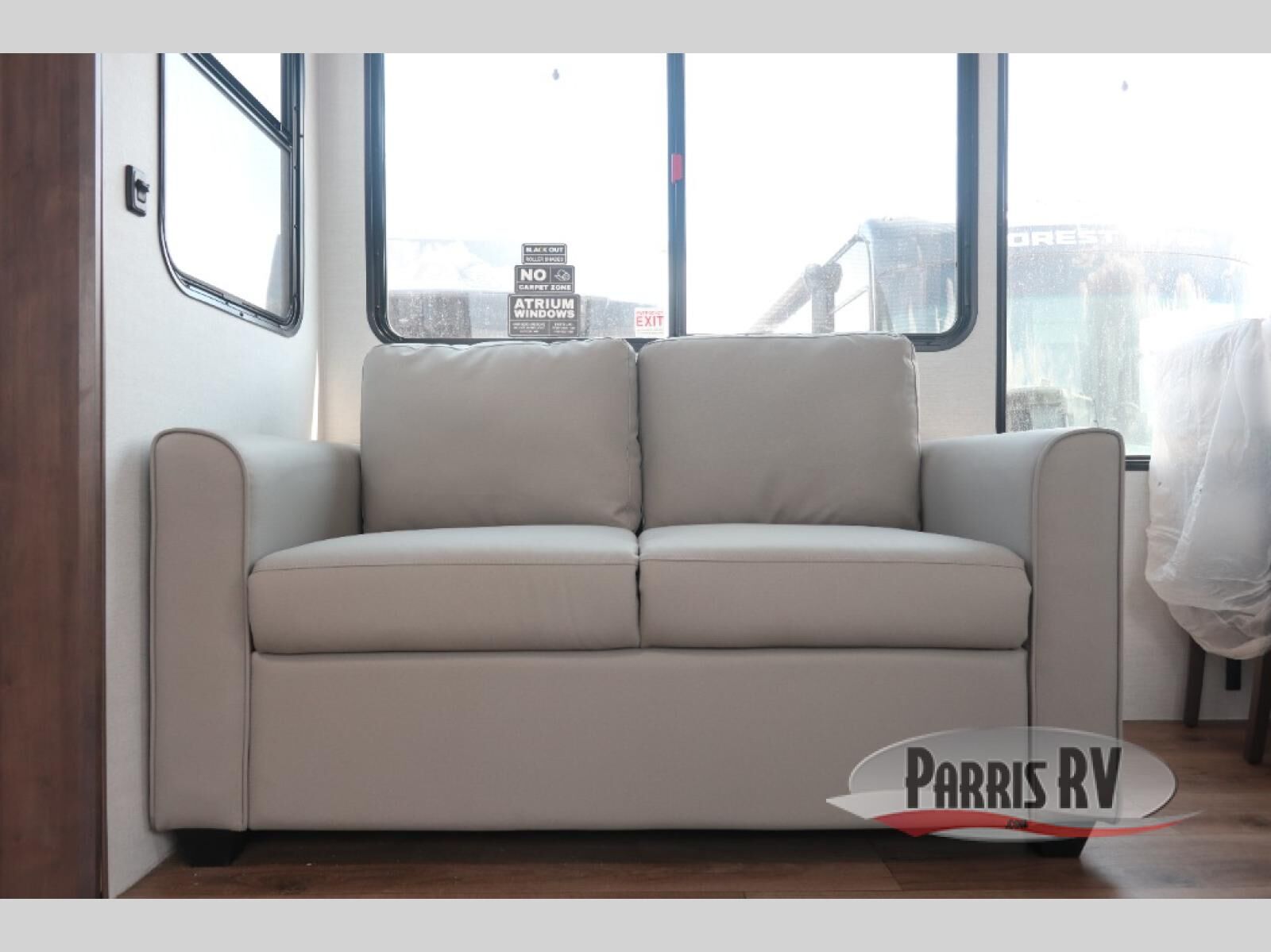 You're sure to love every minute spent in this triple slide out fifth wheel! There are dual sleeper sofas in the middle living area where your guests can sleep, while you take the queen bed slide out in the front bedroom. There is also a king bed option, a walk-in closet with washer and dryer prep, plus a dresser for even more storage. Back in the living area, you can relax on the dual recliner loveseat that sits across from the fireplace and 65" TV. Once dinner has been made on the three burner cooktop, you can dine at the floating dinette table with four chairs.