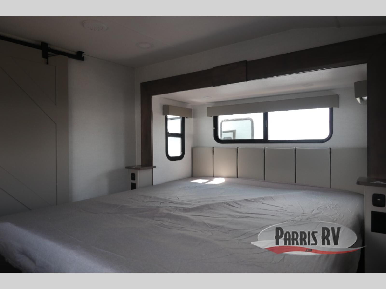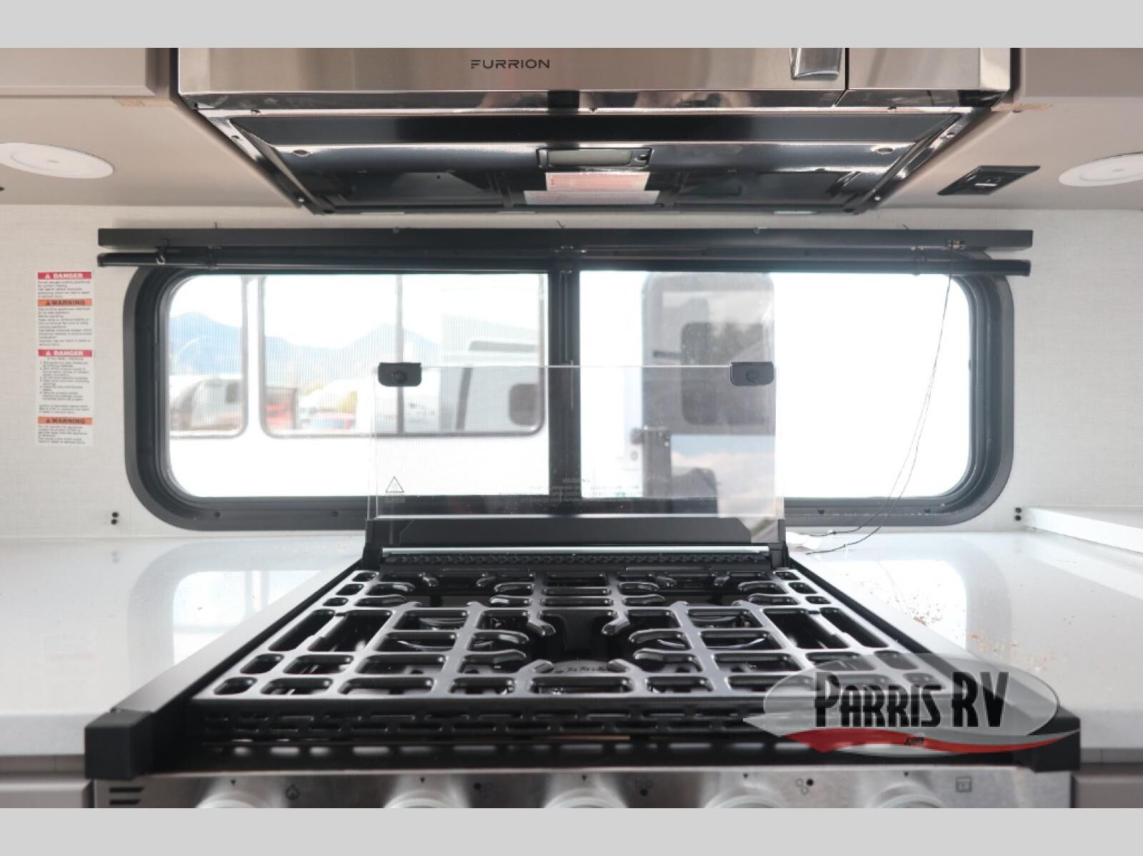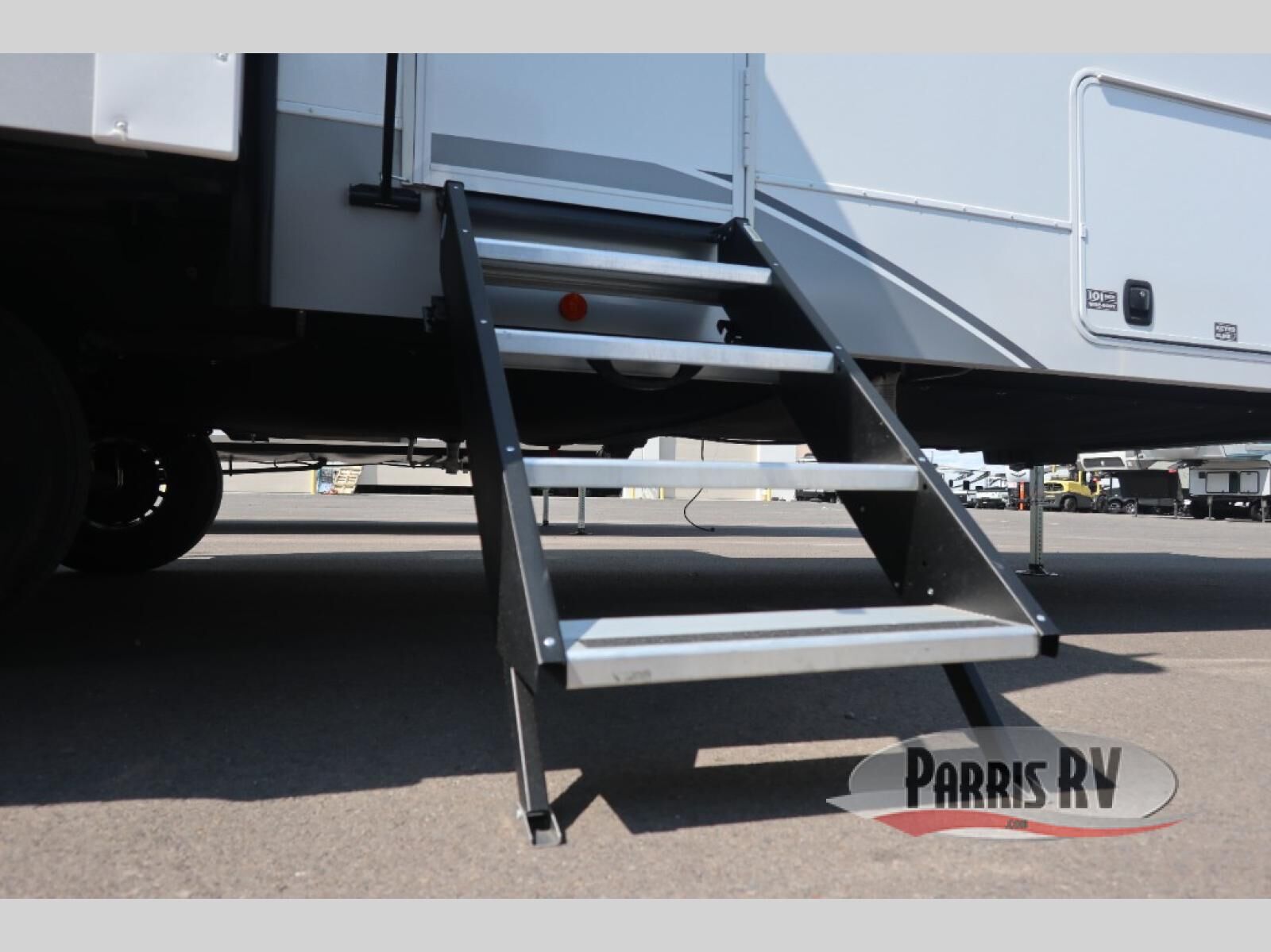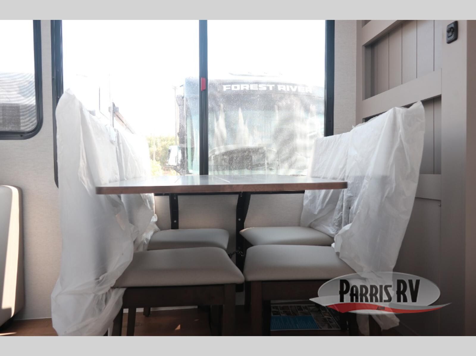 You're sure to love every minute spent in this triple slide out fifth wheel! There are dual sleeper sofas in the middle living area where your guests can sleep, while you take the queen bed slide out in the front bedroom. There is also a king bed option, a walk-in closet with washer and dryer prep, plus a dresser for even more storage. Back in the living area, you can relax on the dual recliner loveseat that sits across from the fireplace and 65" TV. Once dinner has been made on the three burner cooktop, you can dine at the floating dinette table with four chairs.