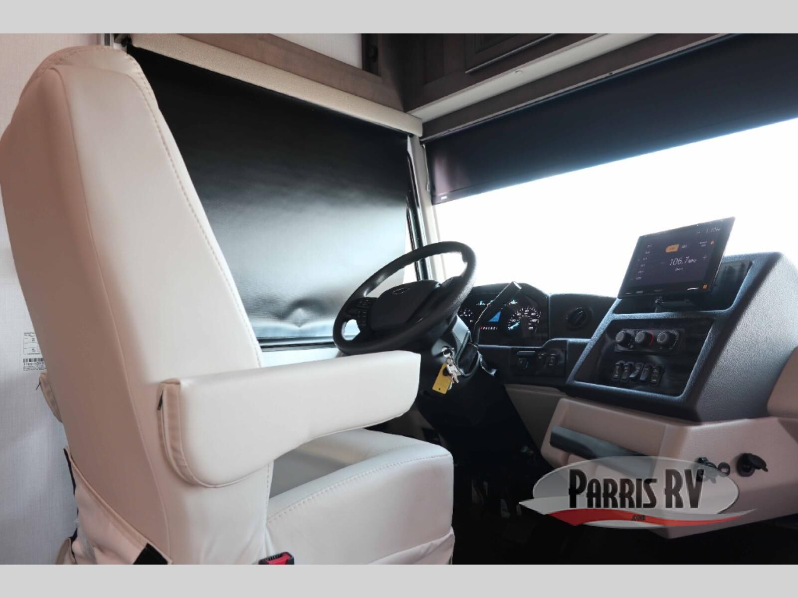 You will love the spacious living entertainment in this motorhome! There is a Thomas Payne 4-person theater seating that reclines with adjustable headrests, heat, massage and has USB outlets. There is also a 5,000 BTU fireplace with a 40" LED TV to watch your favorite movies in true comfort. The kitchen has everything you need to prepare your best home cooked meals including a brush nickel designer faucet with a pull-out spray wand for easy clean up, and you can enjoy all of your meals at the Dream Dinette. You will appreciate having your own private retreat with the rear bedroom which has a 72" x 80" king bed slide across from a dresser with a 32" LED TV, a wardrobe on one side, and another wardrobe on the other with an optional combo washer and dryer. There is also a power front overhead bunk for more sleeping space!