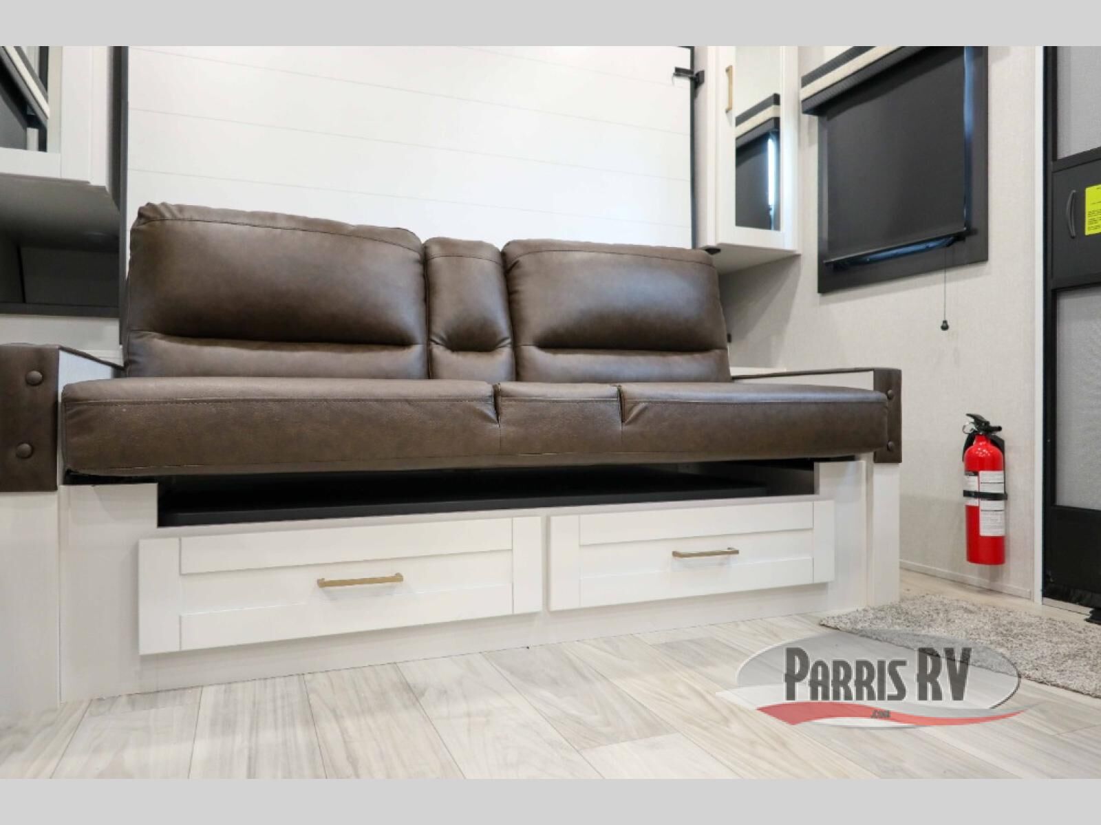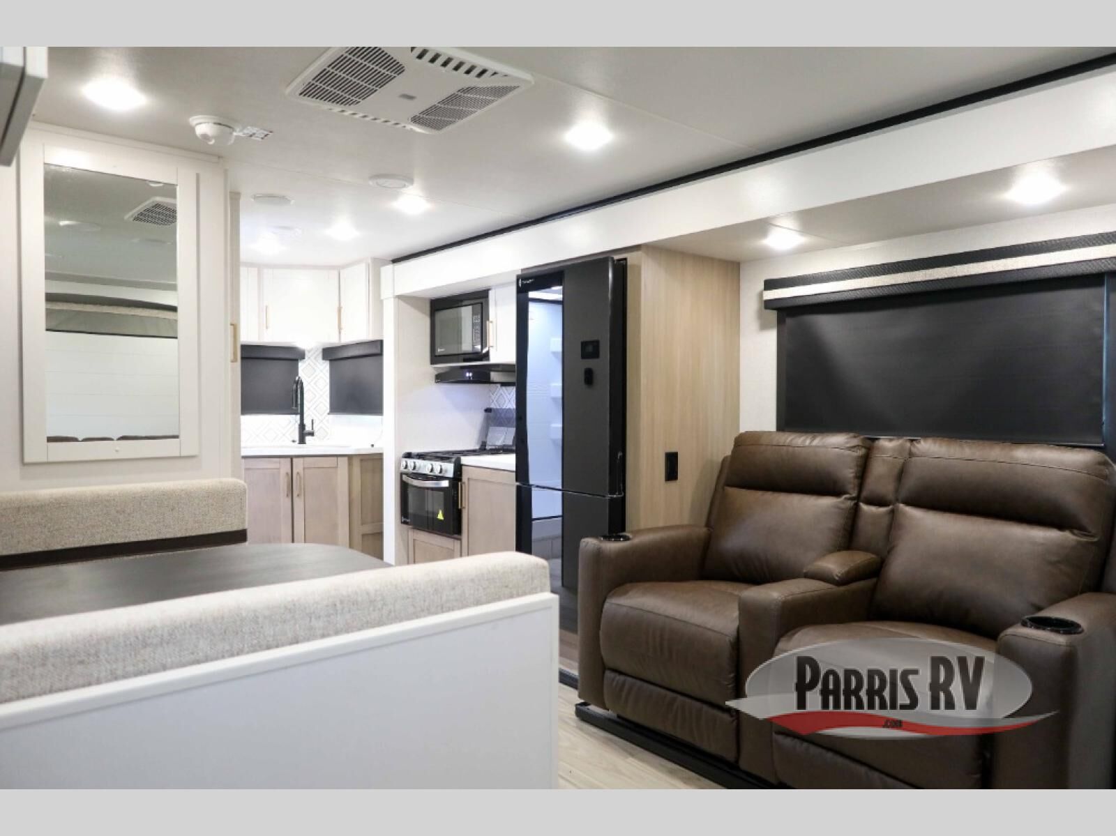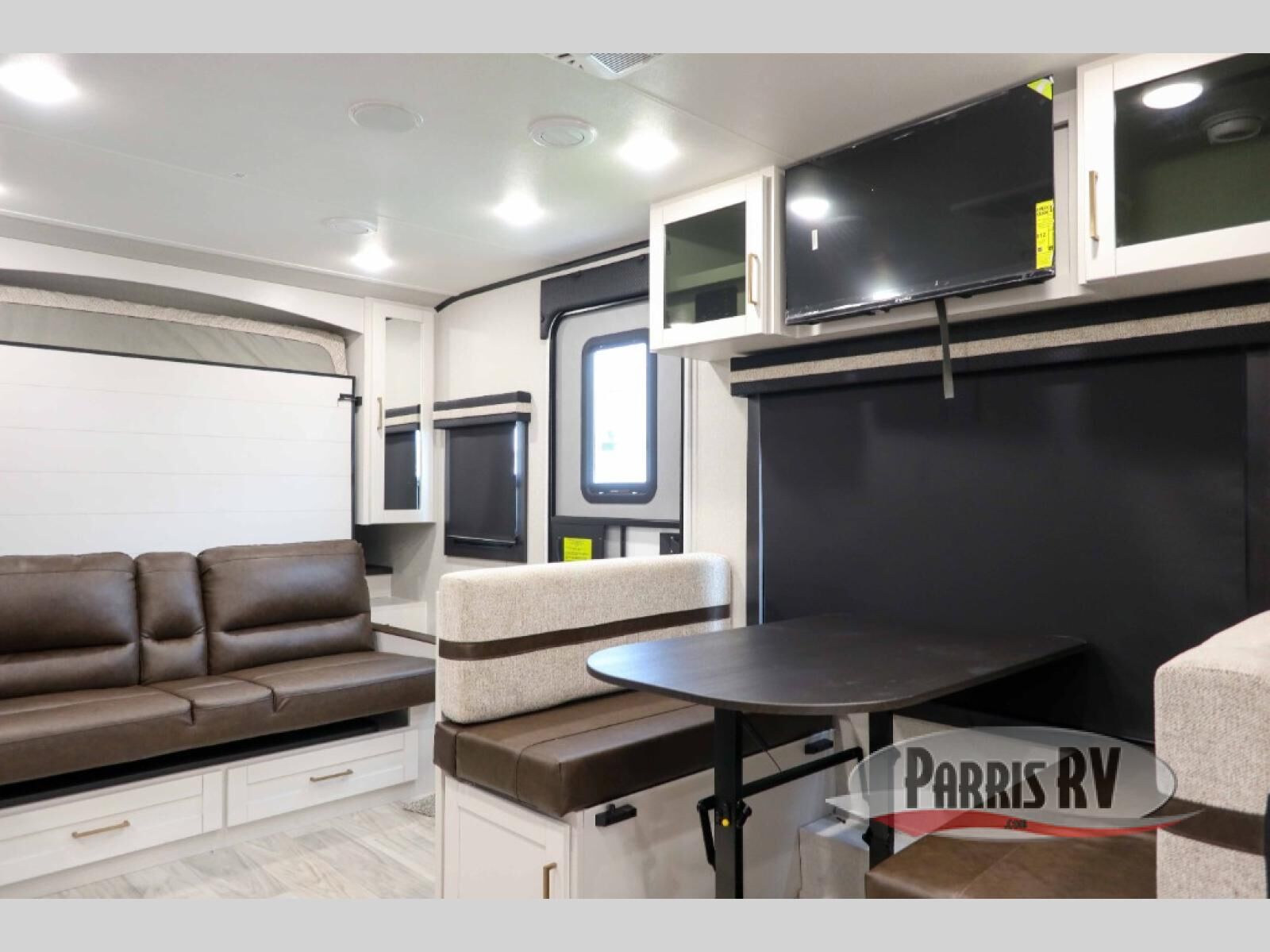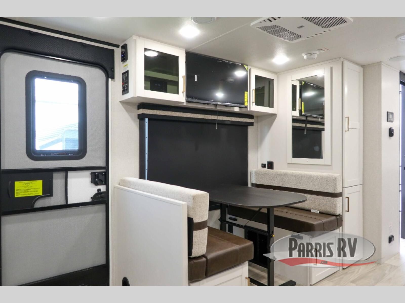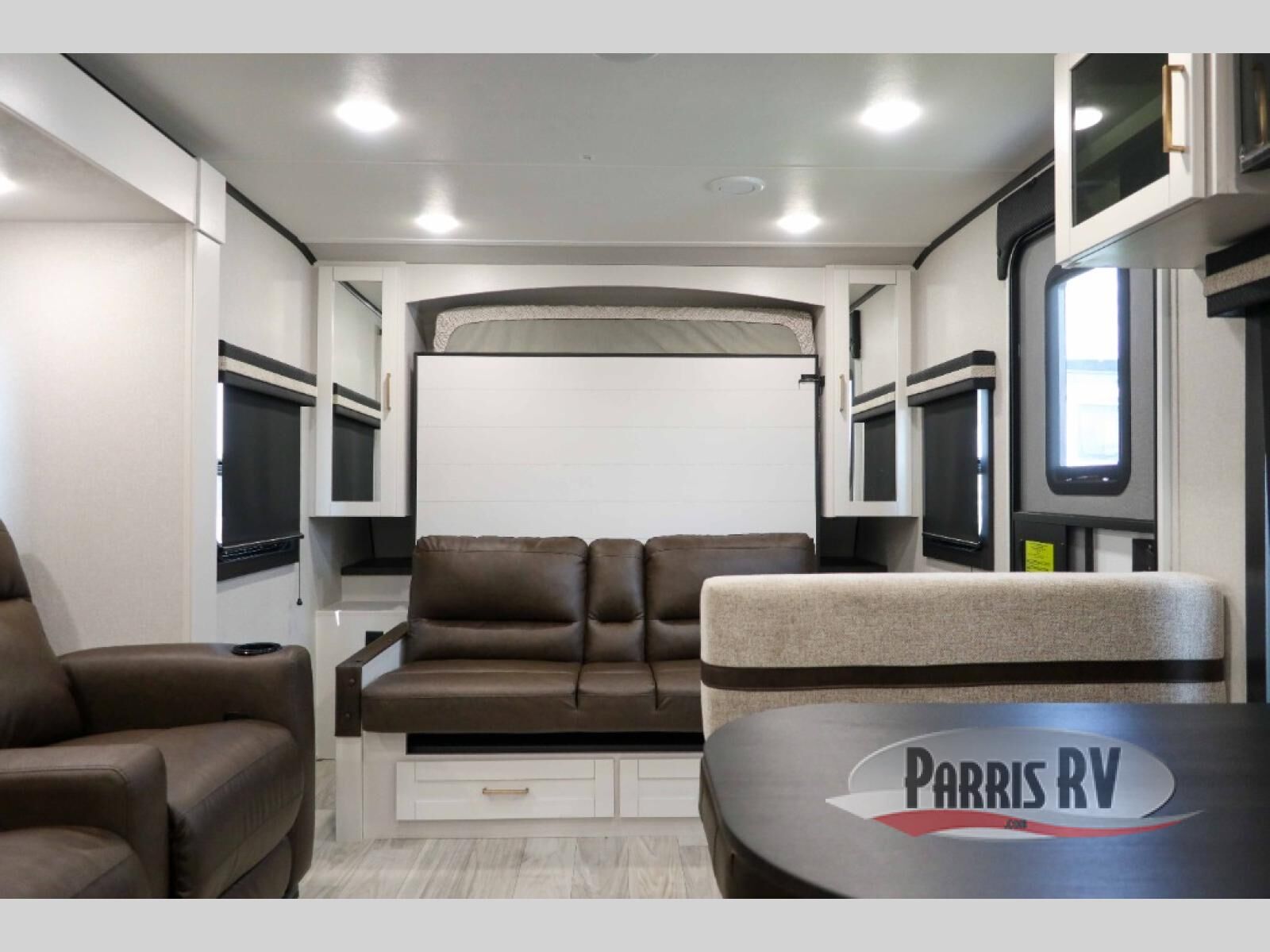 At the front of the trailer, you'll find a versatile 60" x 75" queen Murphy bed that easily converts into a 60" Jack Knife sofa, offering comfortable seating during the day and a cozy sleeping space at night. The slide-out expands the living area with a 60" theater seat, perfect for relaxing, while also housing a fully equipped kitchen with a three-burner range and an 11 cu. ft. refrigerator, making meal prep easy and convenient. Across from the slide, a spacious 38" x 68" dinette provides additional seating for meals, games, or gathering, situated right next to a pantry for storing all your dry goods. In the rear corner, the bathroom includes a roomy 40" shower, a foot-flush toilet, and a linen closet to keep towels and essentials neatly organized and within reach.