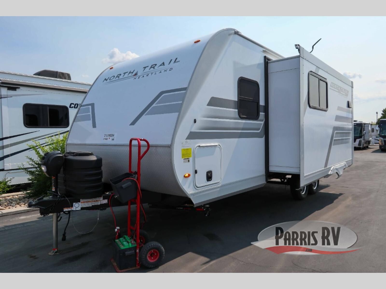 Built for comfort, durability, and modern convenience, these Heartland North Trail travel trailers offer everything you need for a premium camping experience. Each model features a strong American-made Norco Z-frame with an aerodynamic front profile and front diamond plating for added protection. The exclusive TrusstXL Roof System and CoreShield vacuum-bonded walls with Azdel provide superior insulation. Inside, enjoy residential comforts like seamless countertops, solid hardwood maple cabinet doors, LED lighting throughout, and 60 x 80 in. queen beds or 60 x 76 in. Murphy beds. Tech-ready features include an LED smart TV, USB ports, TPMS monitoring, and a 200W solar panel with 30 AMP digital controller. With a Quiet Series A/C, on-demand 60K BTU water heater, with these trailers you are equipped to make every trip comfortable and adventure-ready.
