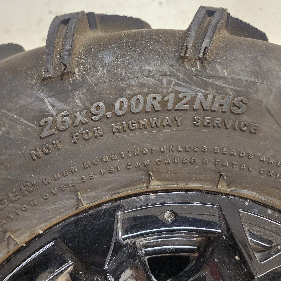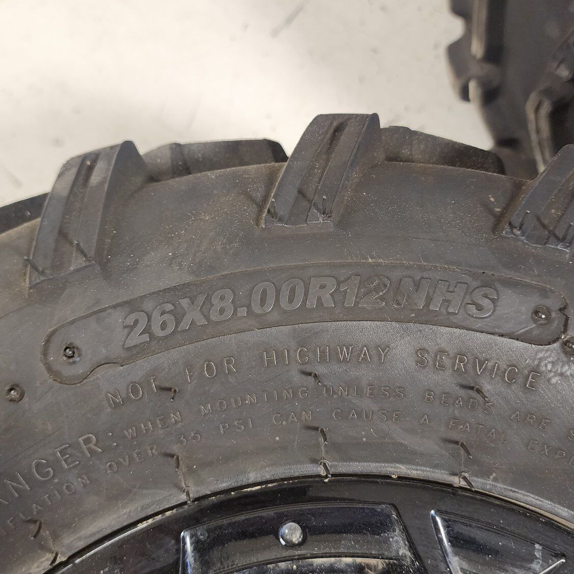 Sizes: • Fronts: 26x8.00R12 NHS (Not for Highway Service) • Rears: 26x9.00R12 NHS (Not for Highway Service)