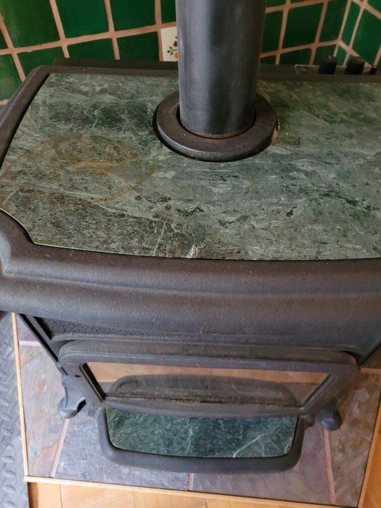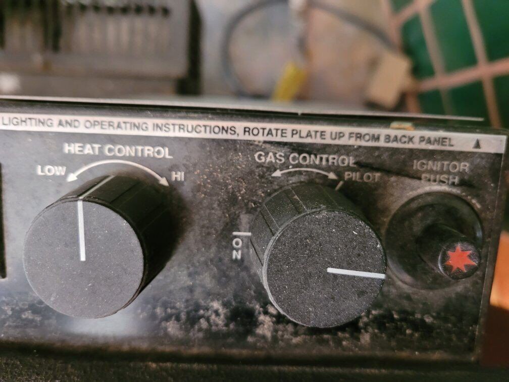 Freestanding wrought iron gas fireplace. Runs on natural gas. Electric blower. Marble top and front. Artificial logs.