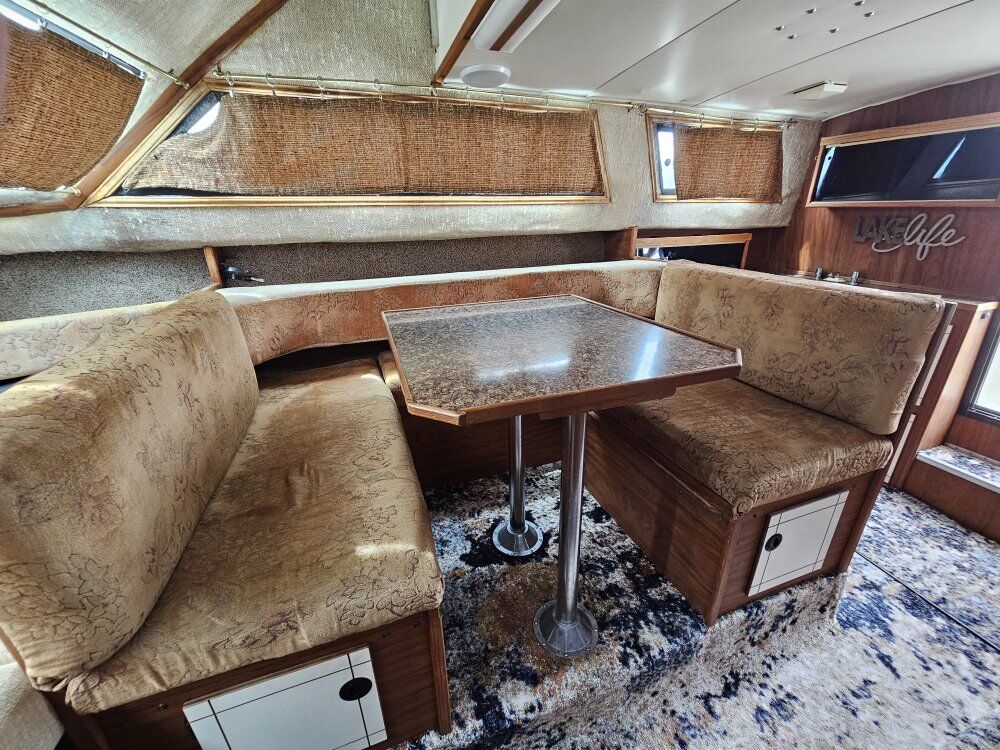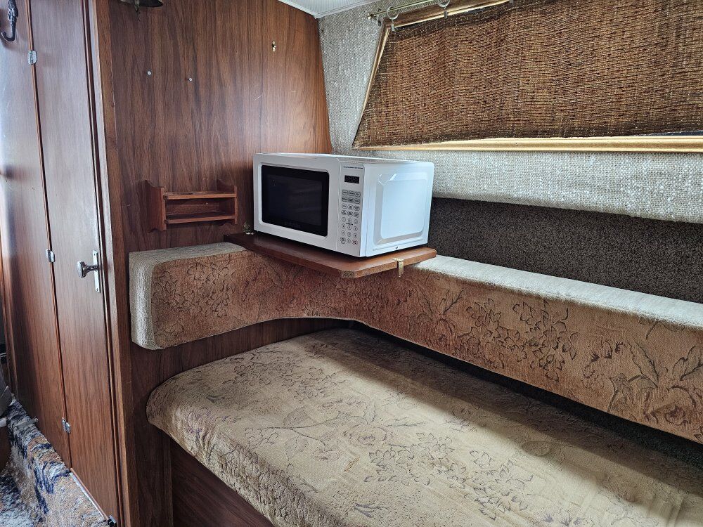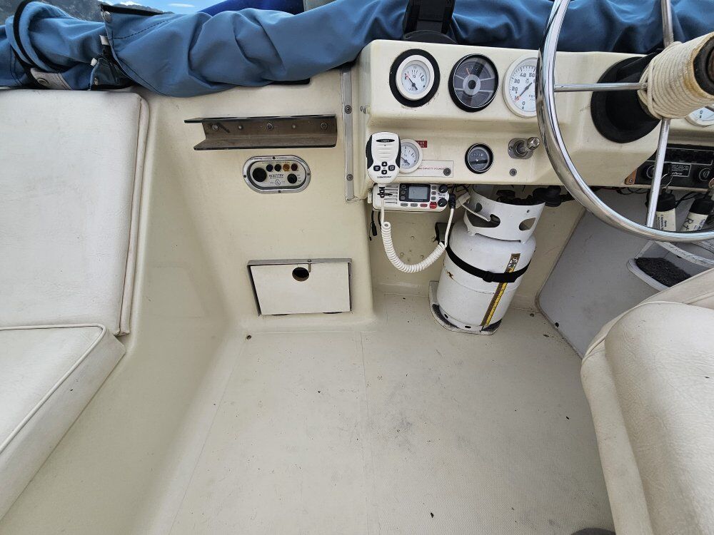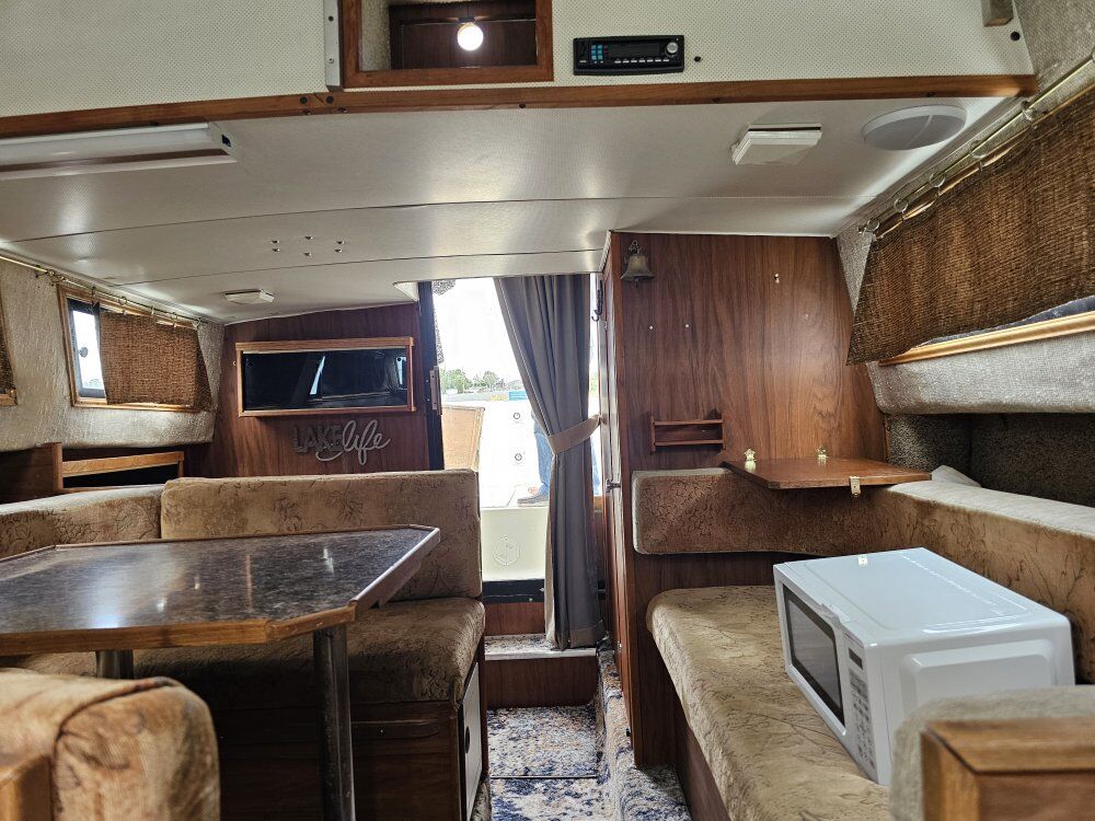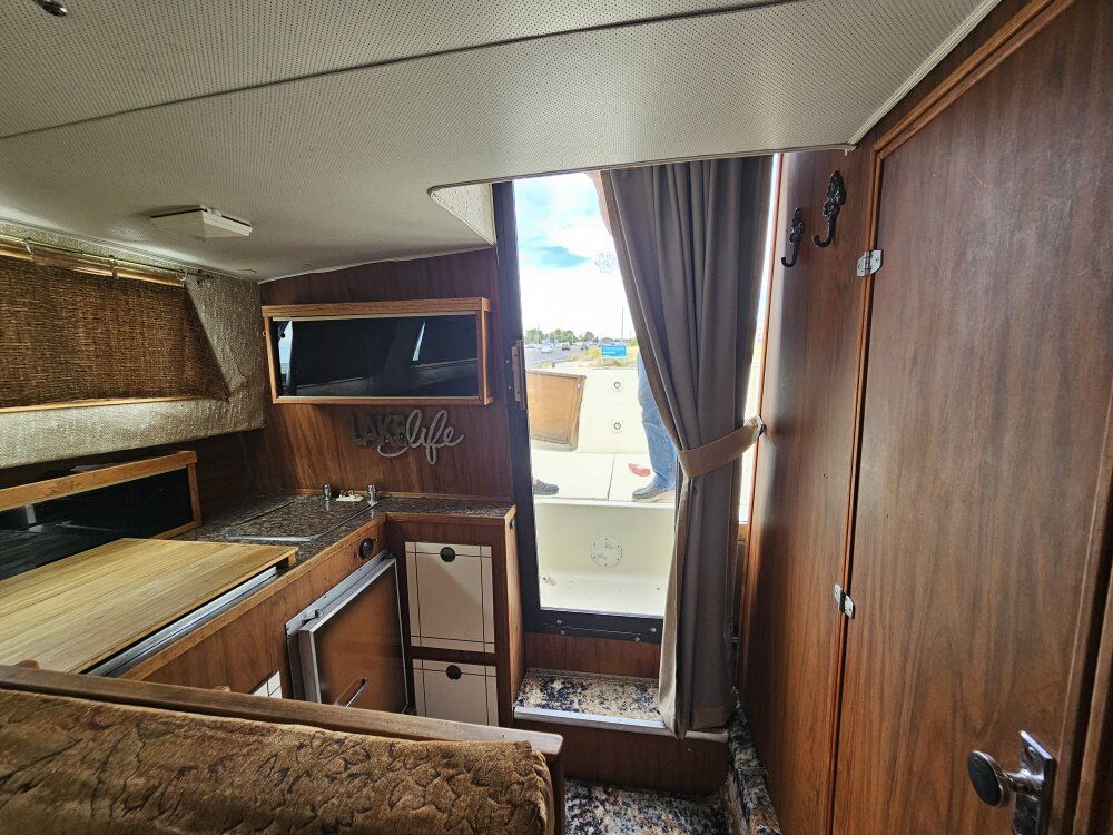 BATHROOM WITH PORTA POTTY, DRESSER AND CLOTHES RACK ICE BOX 3 BURNER STOVE (PROPANE TANK ON BRIDGE) STAINLESS STEEL SINK CD PLAYER / RADIO / SPEAKERS LOTS OF STORAGE!!!!!! HAS BIMINI TOP WITH FULL ENCLOSURE WINDOWS