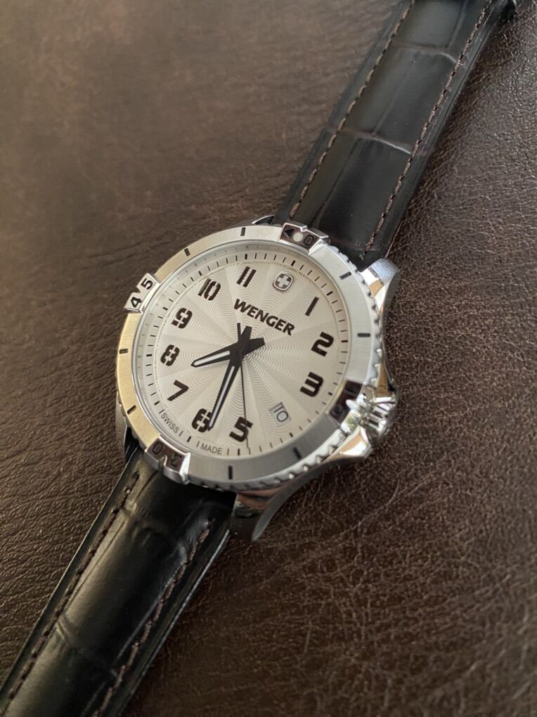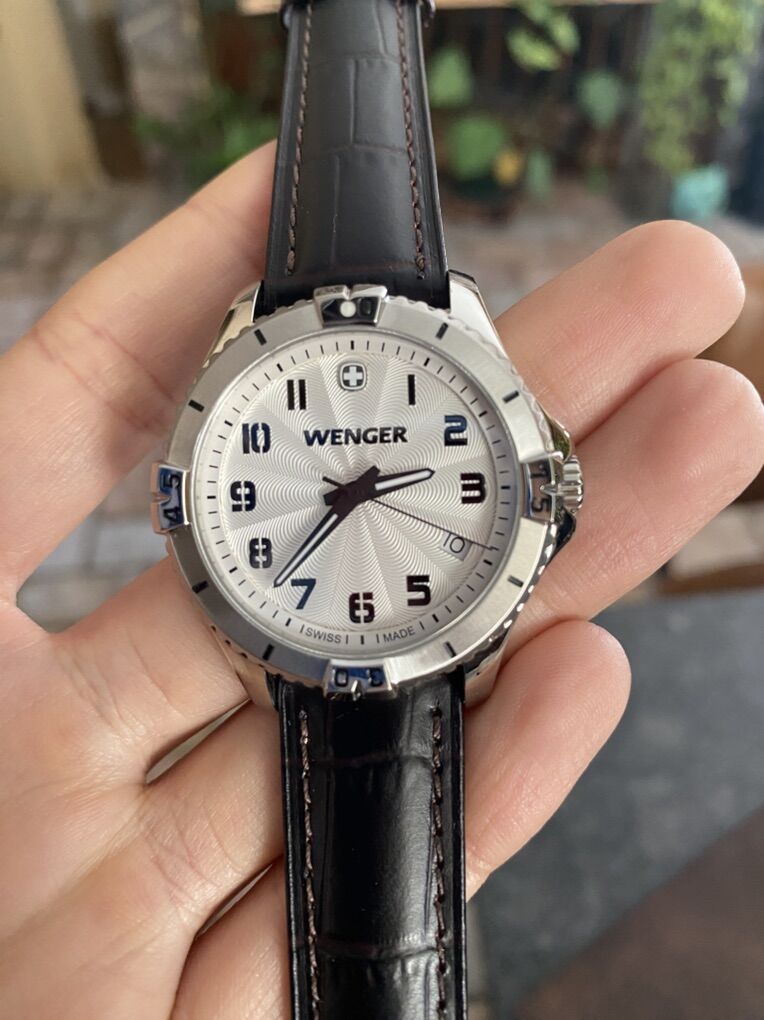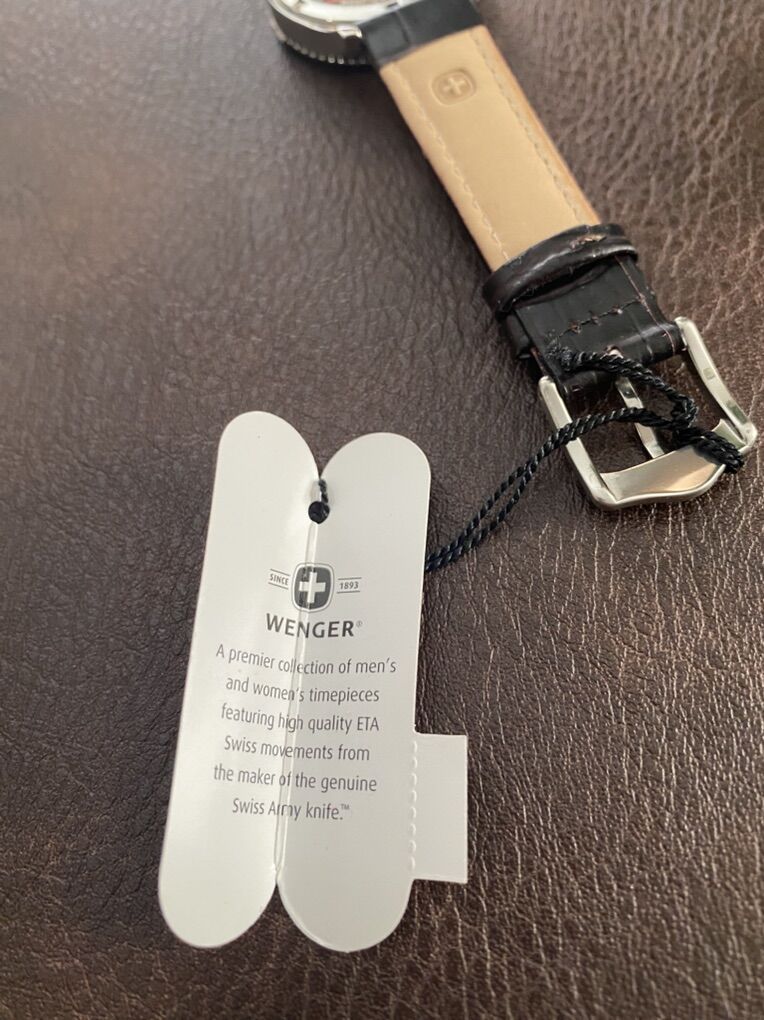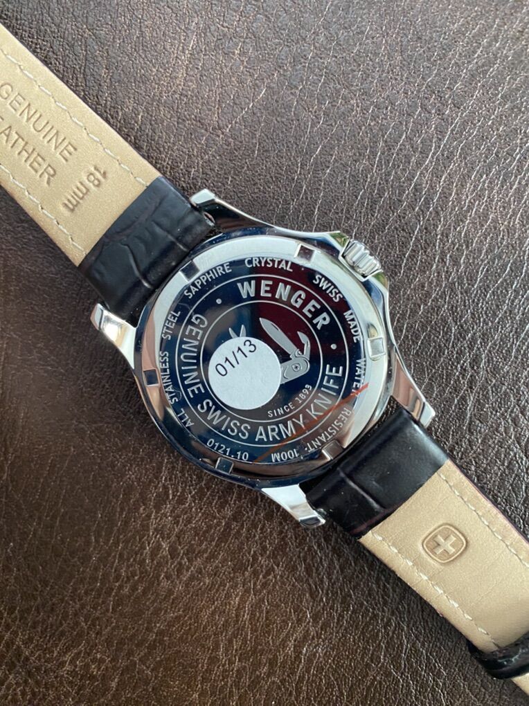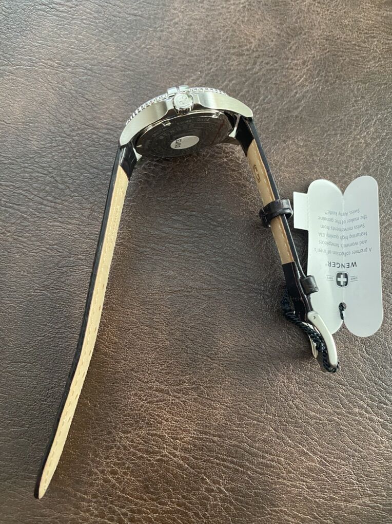 Wenger Squadron Swiss Military Watch Model: 0121.10 Swiss made with a Swiss movement Sapphire crystal 18mm dark brown leather band 36mm stainless steel case