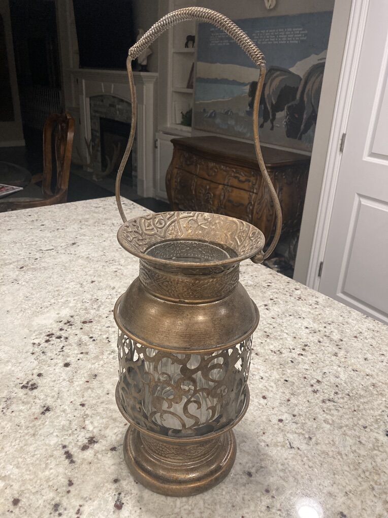 ZelleI'm selling a decorative lantern for home decor. It's non-functioning. Made of metal that is painted to look like brass. Has a glass invert in the center and a rotating handle. Measures approximately 12 tall with handle folded down and 6 wide. 21 tall with handle in the upright. $20