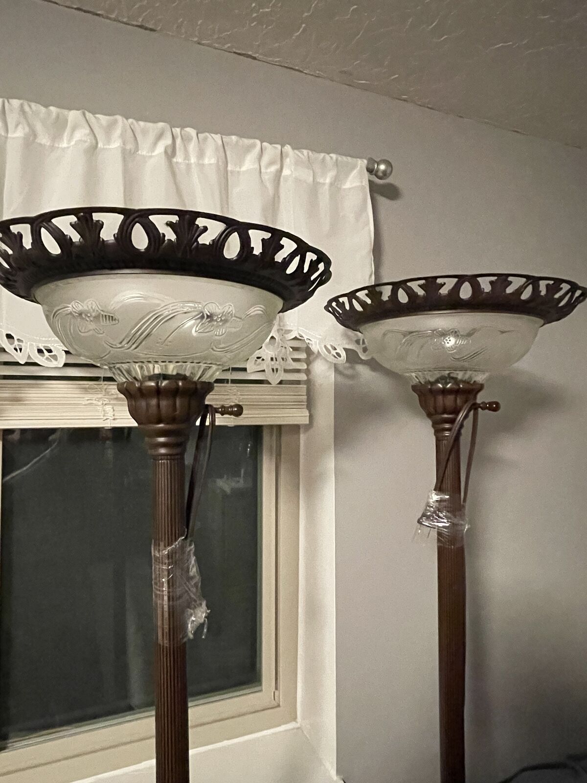 (2) Two, brown, decorative glass bowls with removable decorative metal trim, stands 5.5', sold as a set