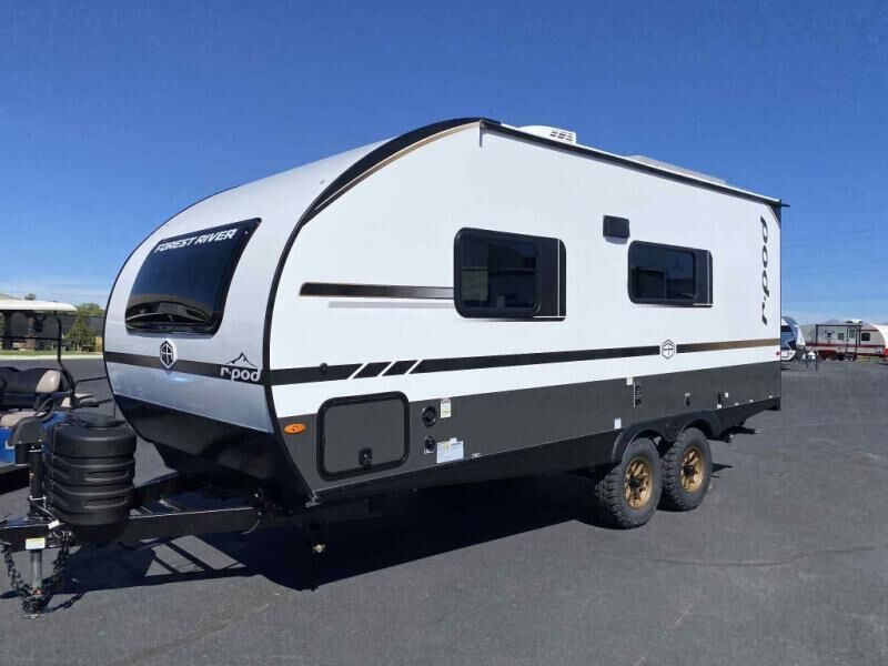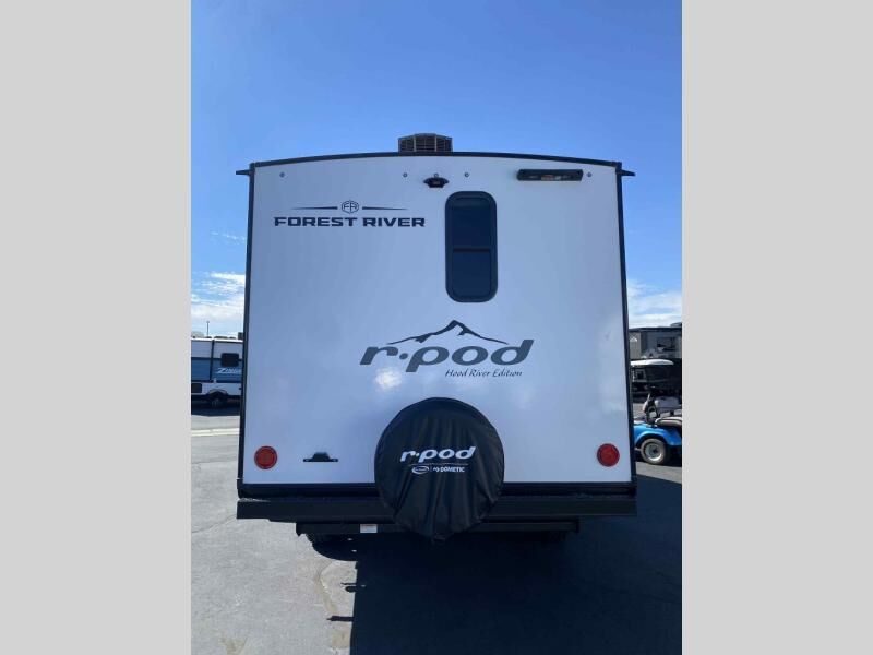 With any R-Pod travel trailer by Forest River, you will enjoy affordable luxury at the lowest tow weight in its class! There is a sealed underbelly with forced heat, a curved dual-pane acrylic front window with a bug screen and night shade, plus a large roof mounted solar panel for off-grid capabilities. The 15K A/C unit will keep you comfortable during the summer camping months, and the tankless water heater will provide endless hot showers after hiking, biking, swimming and more! Each model also includes a black glass friction hinge entrance door, roof ladder prep, exterior motion lighting, plus a hot and cold exterior spray port to wash off sand from the beach. Inside, you'll enjoy seamless Surf-X kitchen countertops, blackout roller shades, and a central vacuum system for hassle-free cleaning!