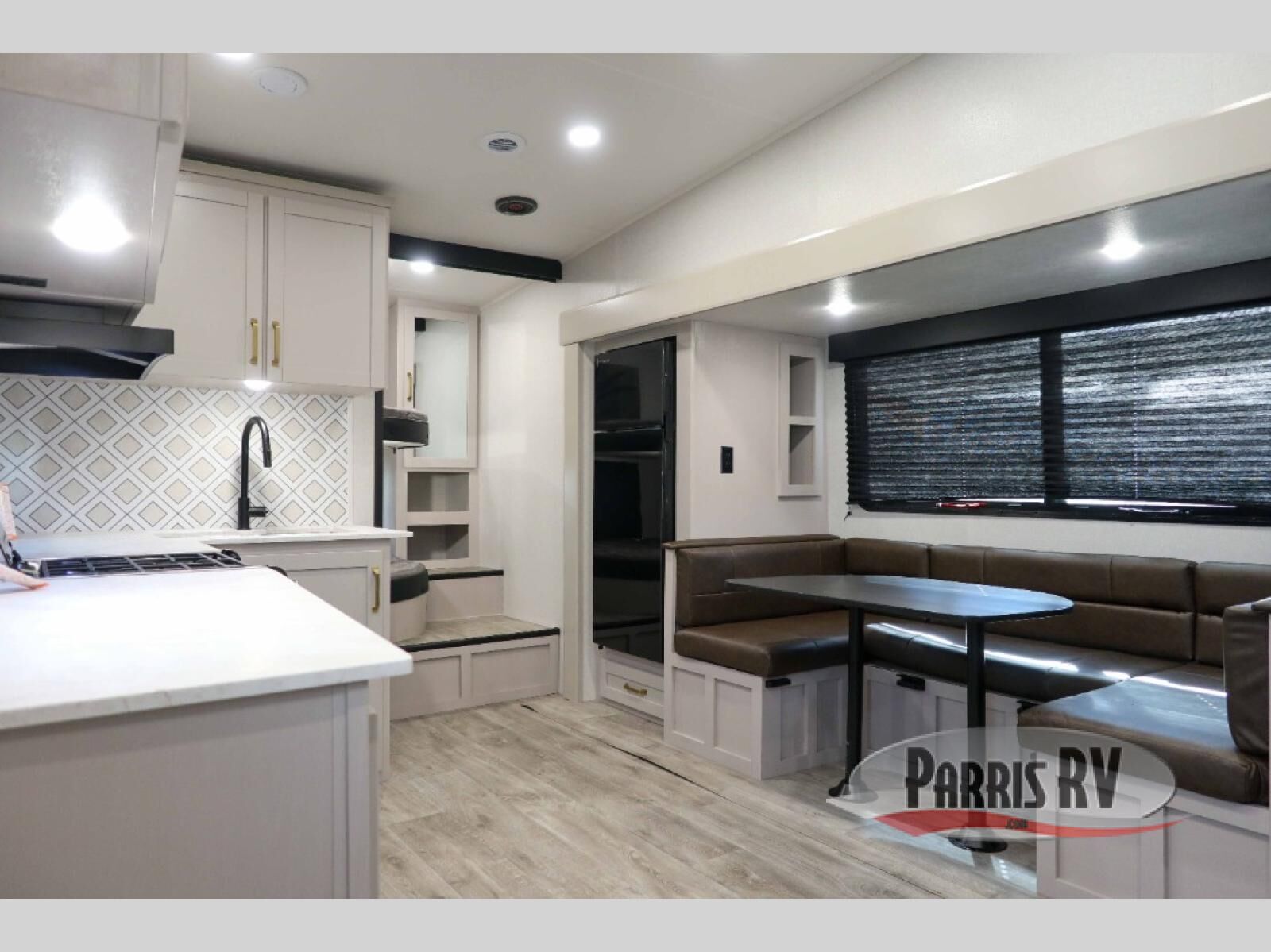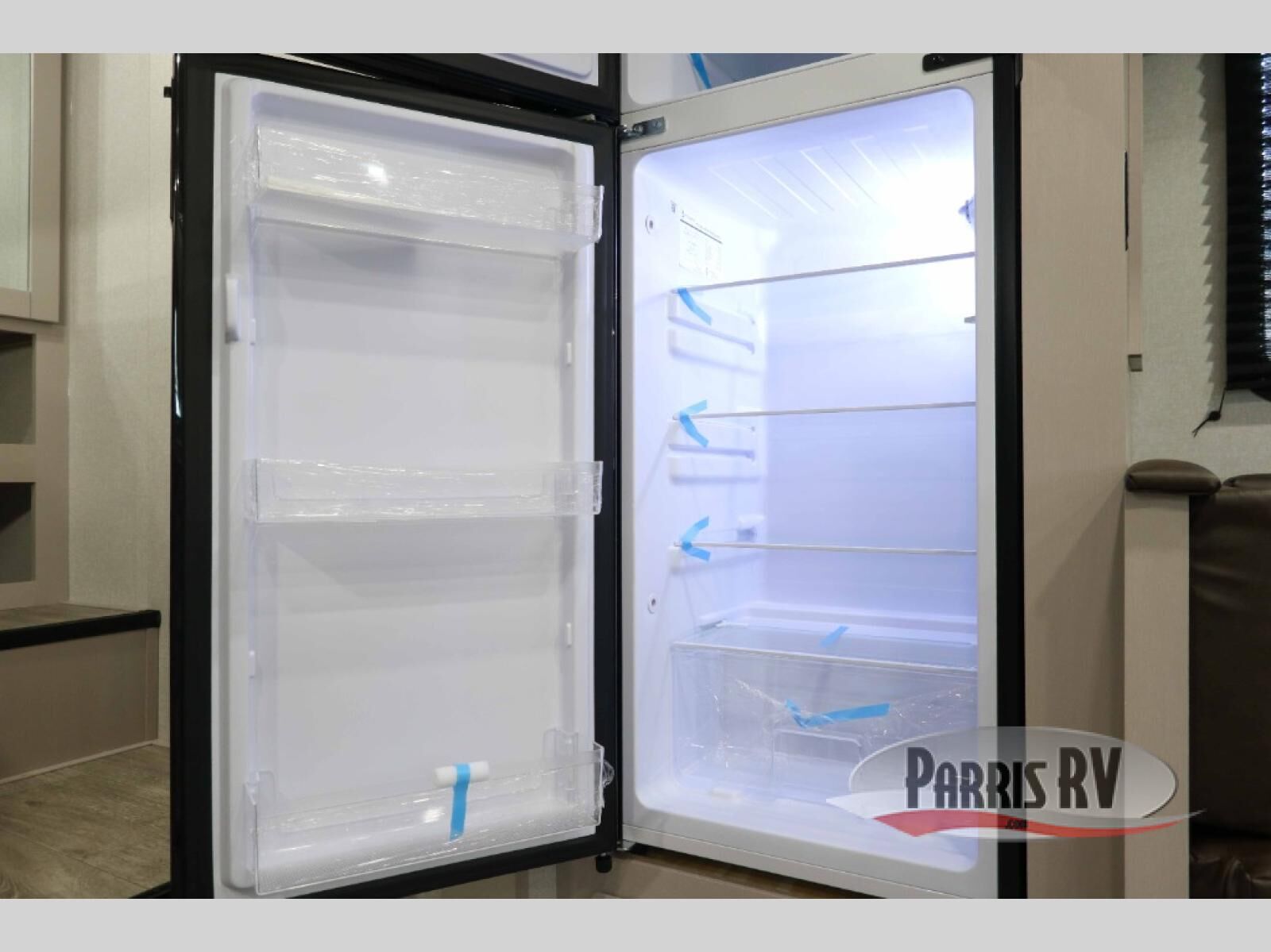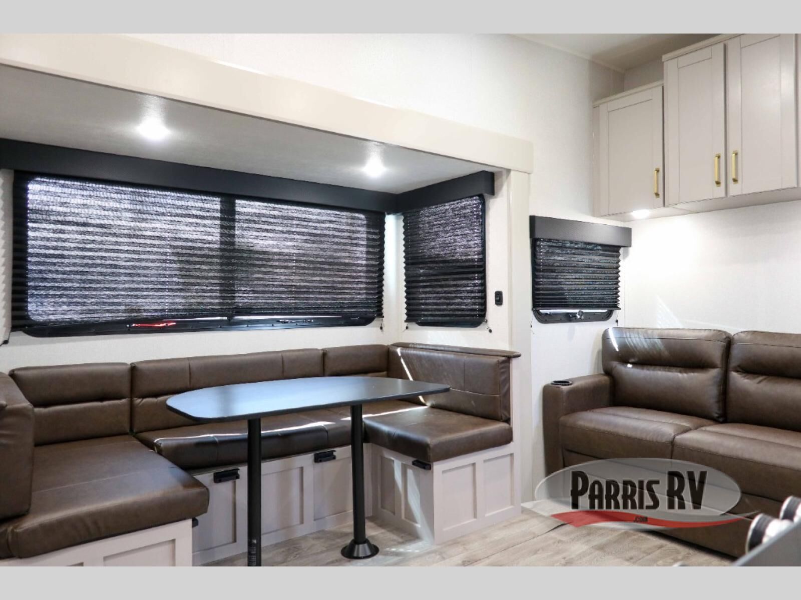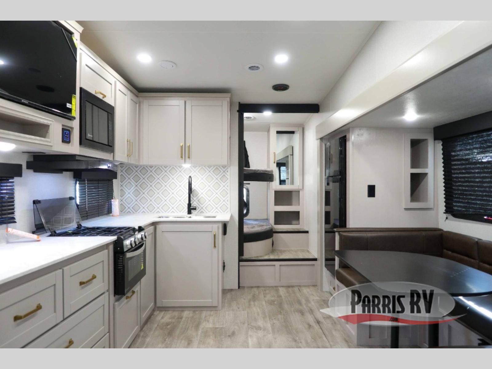 This fifth wheel's spacious interior boasts double-sized bunk beds designed for kids or guests, providing a comfortable sleeping space. A U-shaped dinette that offers ample seating and dining space for meals or even more sleeping space, as well as the 60" tri-fold sofa, which provides additional seating and can be converted into a comfortable sleeping area. In the kitchen area, you will find many amenities to cook delicious meals, such as a microwave, refrigerator, and overhead cabinets that will allow you to keep everything organized. The front bed is spacious, featuring a queen bed ideal for sleeping tight, and the full bath will complete the at-home experience since you will be able to take a refreshing shower on hot days!