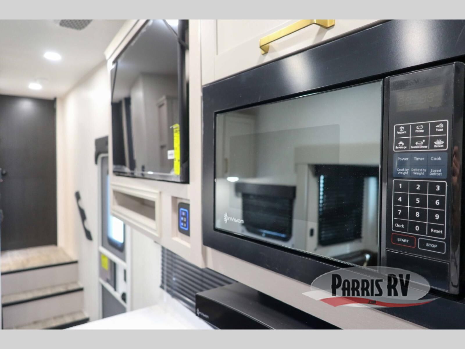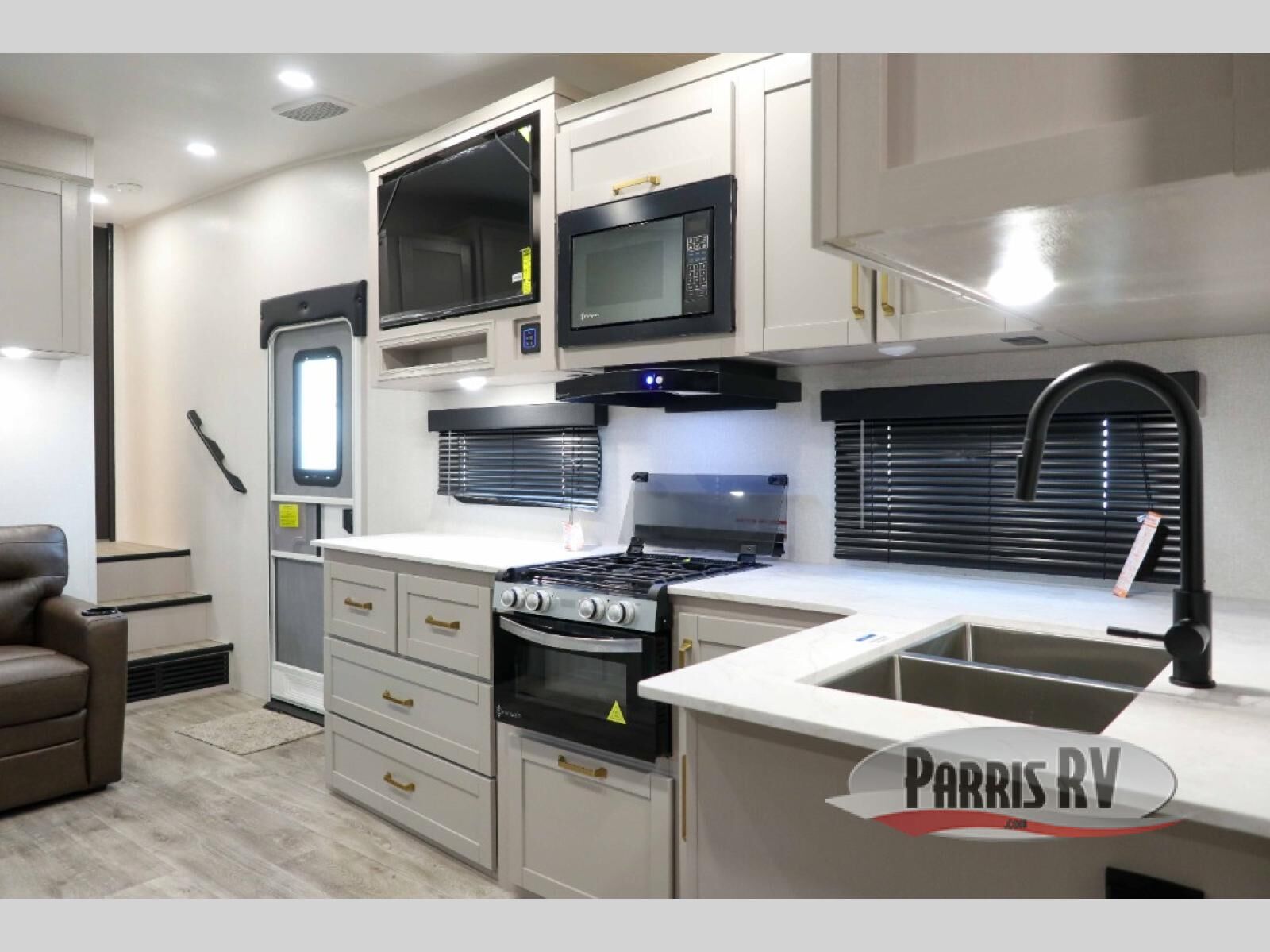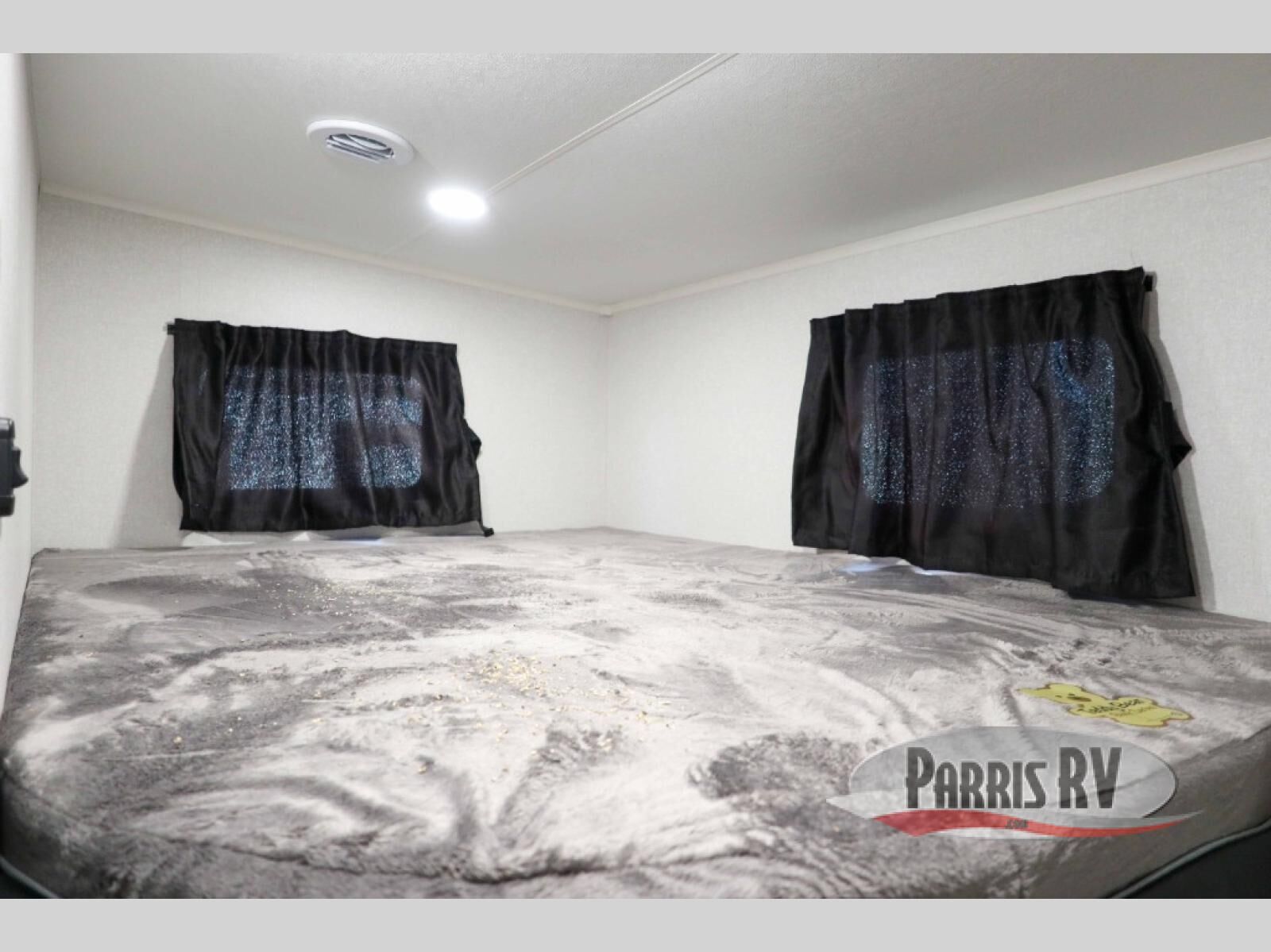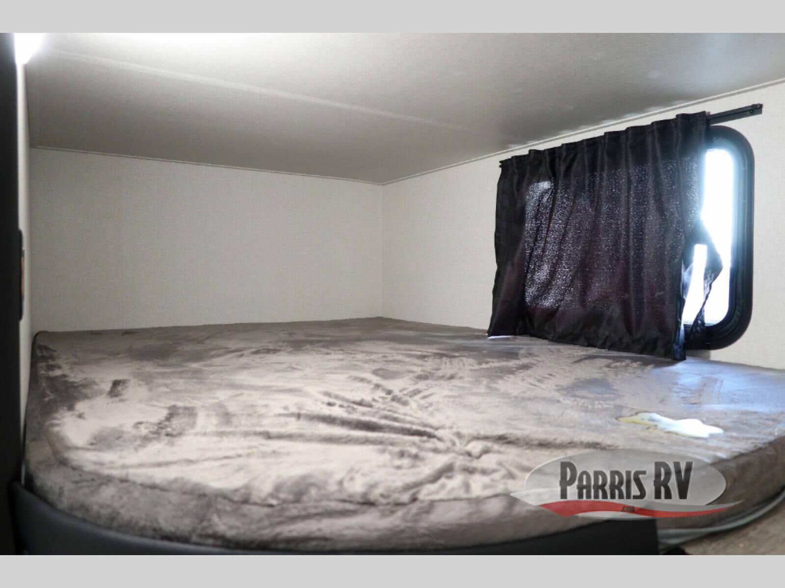 This fifth wheel's spacious interior boasts double-sized bunk beds designed for kids or guests, providing a comfortable sleeping space. A U-shaped dinette that offers ample seating and dining space for meals or even more sleeping space, as well as the 60" tri-fold sofa, which provides additional seating and can be converted into a comfortable sleeping area. In the kitchen area, you will find many amenities to cook delicious meals, such as a microwave, refrigerator, and overhead cabinets that will allow you to keep everything organized. The front bed is spacious, featuring a queen bed ideal for sleeping tight, and the full bath will complete the at-home experience since you will be able to take a refreshing shower on hot days!