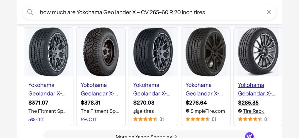 Yokohama Geolandar X–CV M+S Mud and Snow tires nearly new with less than 5000 miles on them. Excellent condition must see. These tires new run about $300 each. that isn’t even including the rims. The OEM 20x8 powder coated aluminum rims are at least $300 each also. $2400 to replace all 4 wheels and tires new. Asking $1200 obo