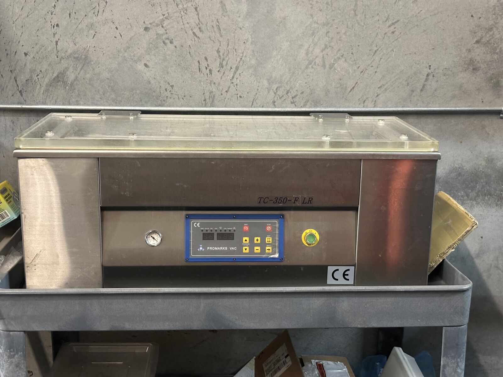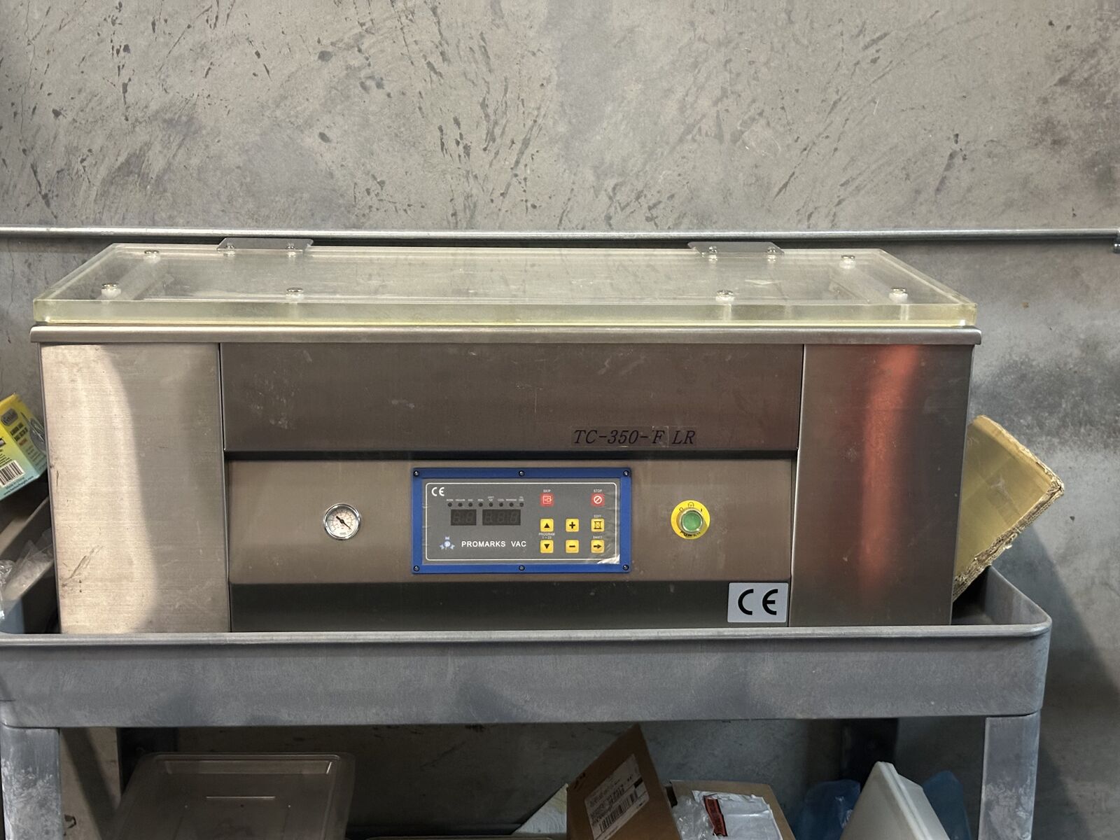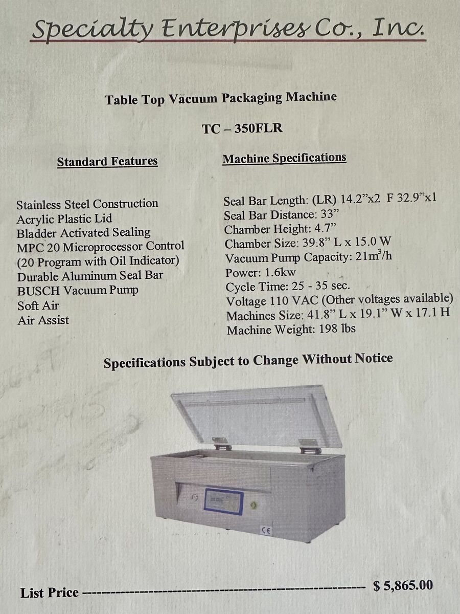 39.8" Long x 15" wide Chamber vaccuum Sealer, 3 heat seal bars capable of sealing two large sides of Salmon, 1 whole fillet of habut or a loin of tuna. pro marks