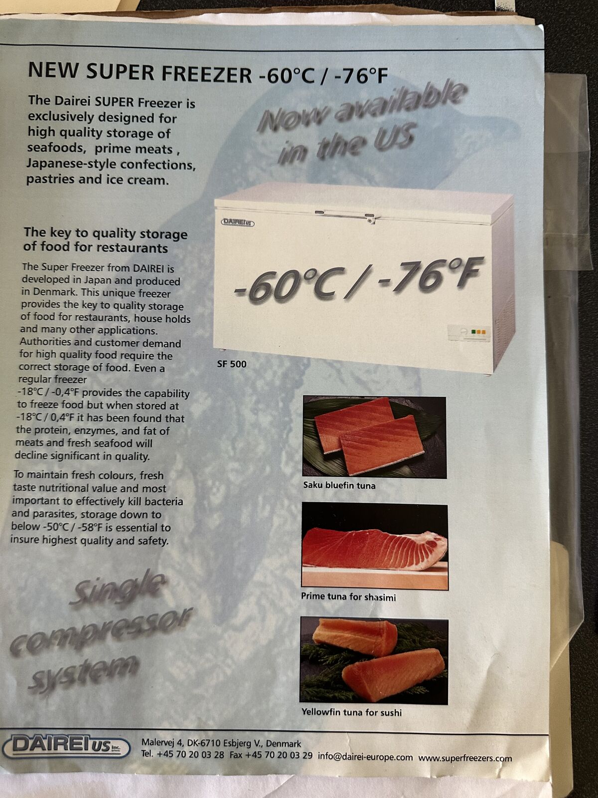 Super freezer, -76 degrees Farenheit, perfect for storing frozen toro, and high quality meat and seafood such as Bluefin Tuna or wagyu beef